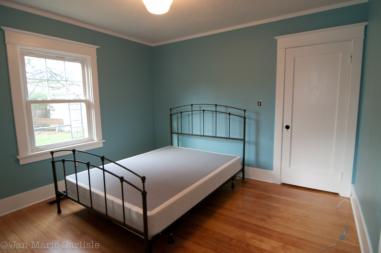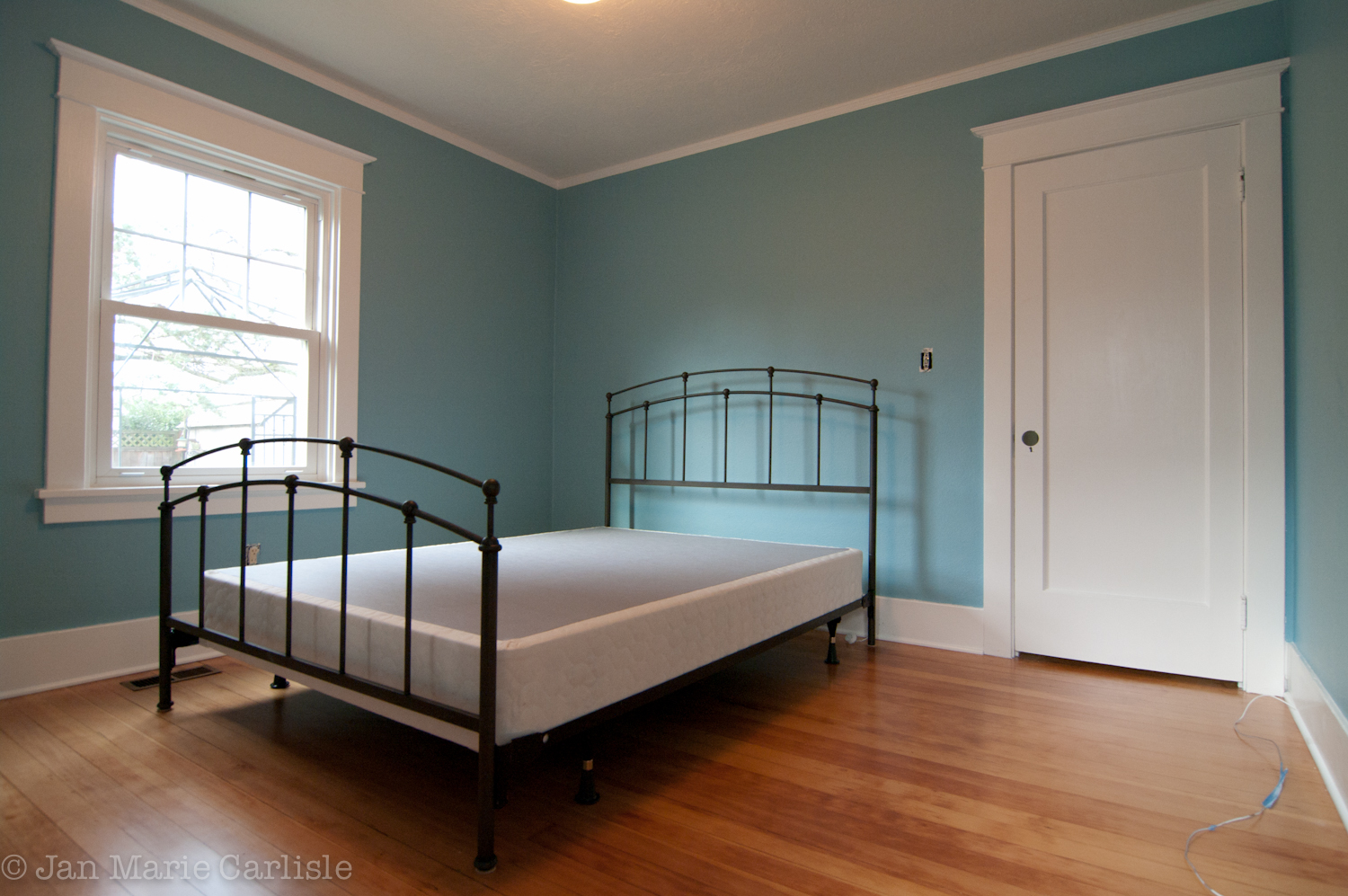 Our bedroom, after — the color is Marlboro Blue (also in this bedroom you can sort of see one of the light fixtures we picked):