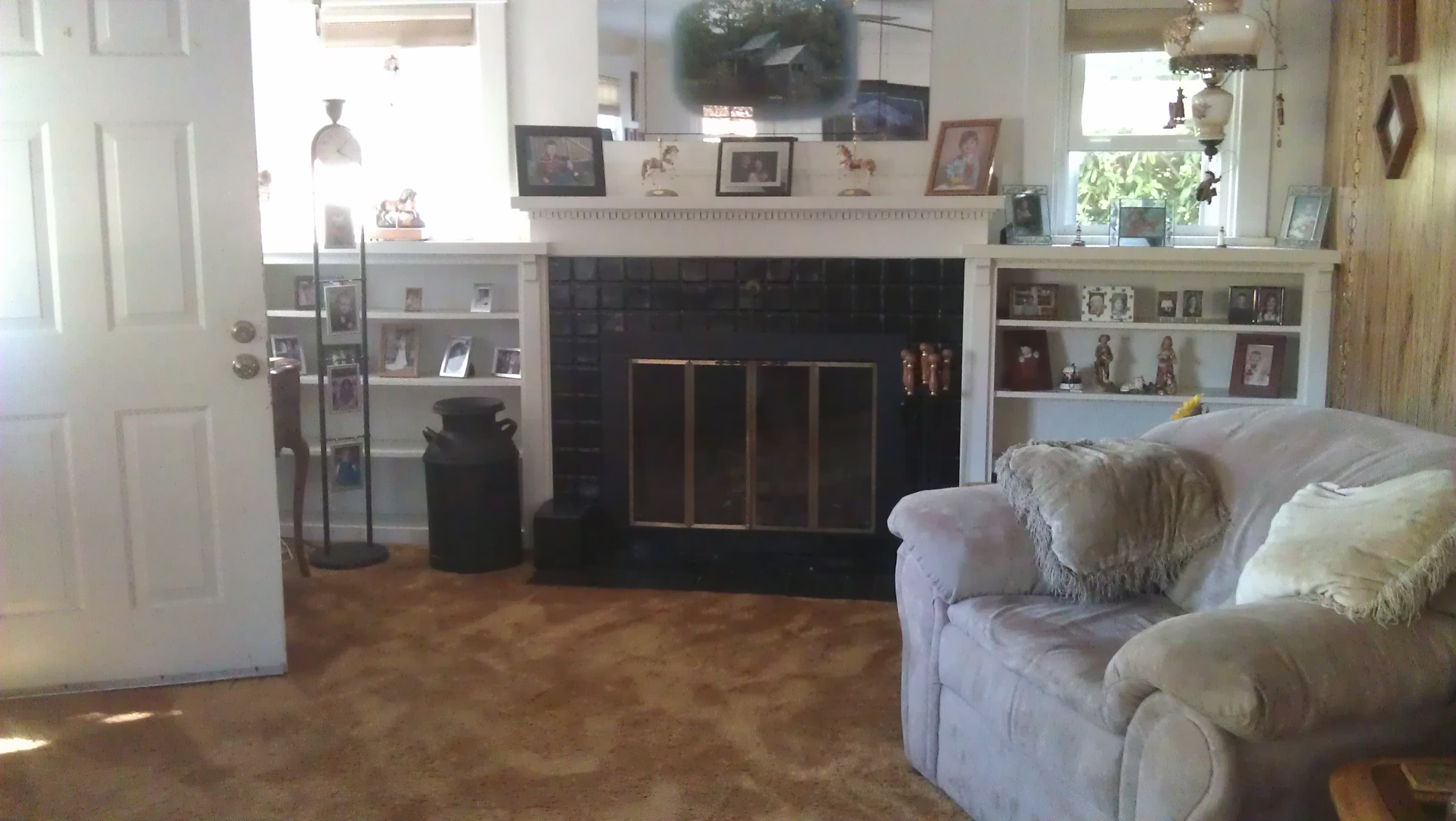 The living/dining room after — the walls are Hawthorne Yellow and the fireplace is Warmed Cognac: