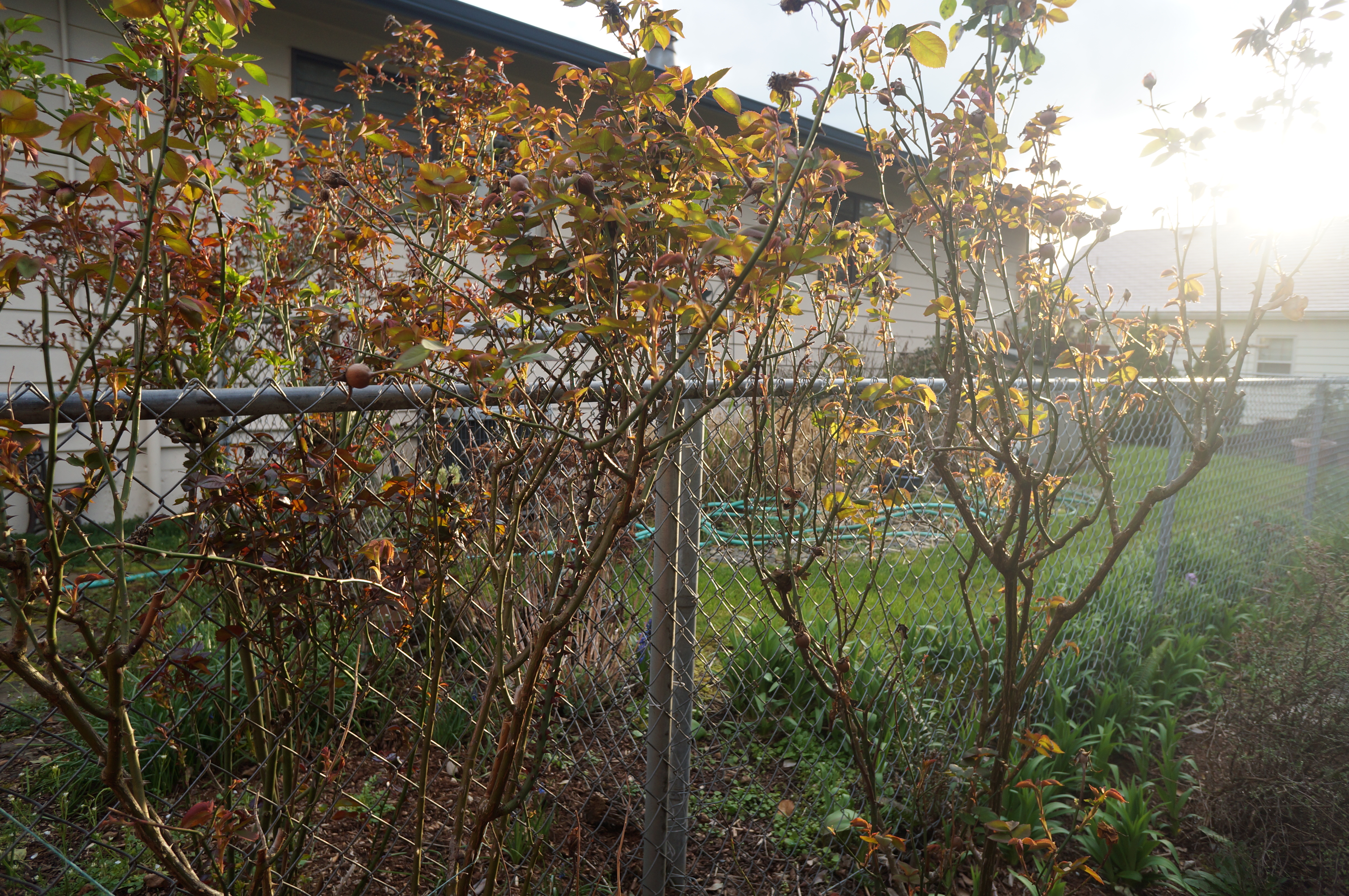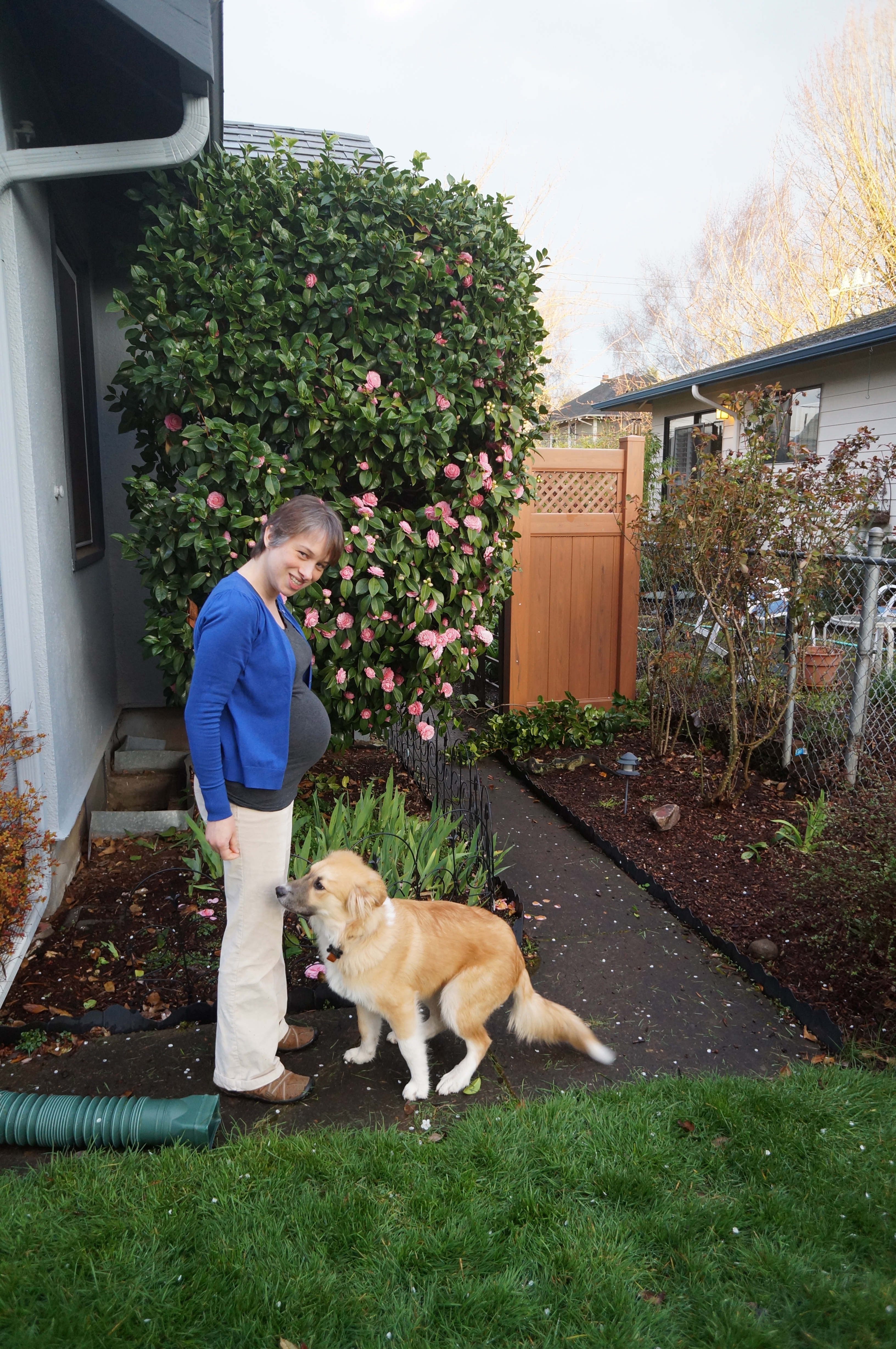 This is the other bush, which is in front of the baby’s room window. It must be a different kind, because it doesn’t look like anything is going to bloom on it. We’ve been talking about thinning it or cutting it down to let more light in that south-facing window, but there are birds in it, and someone told me we’ll probably want to keep the baby’s room dark for naps: