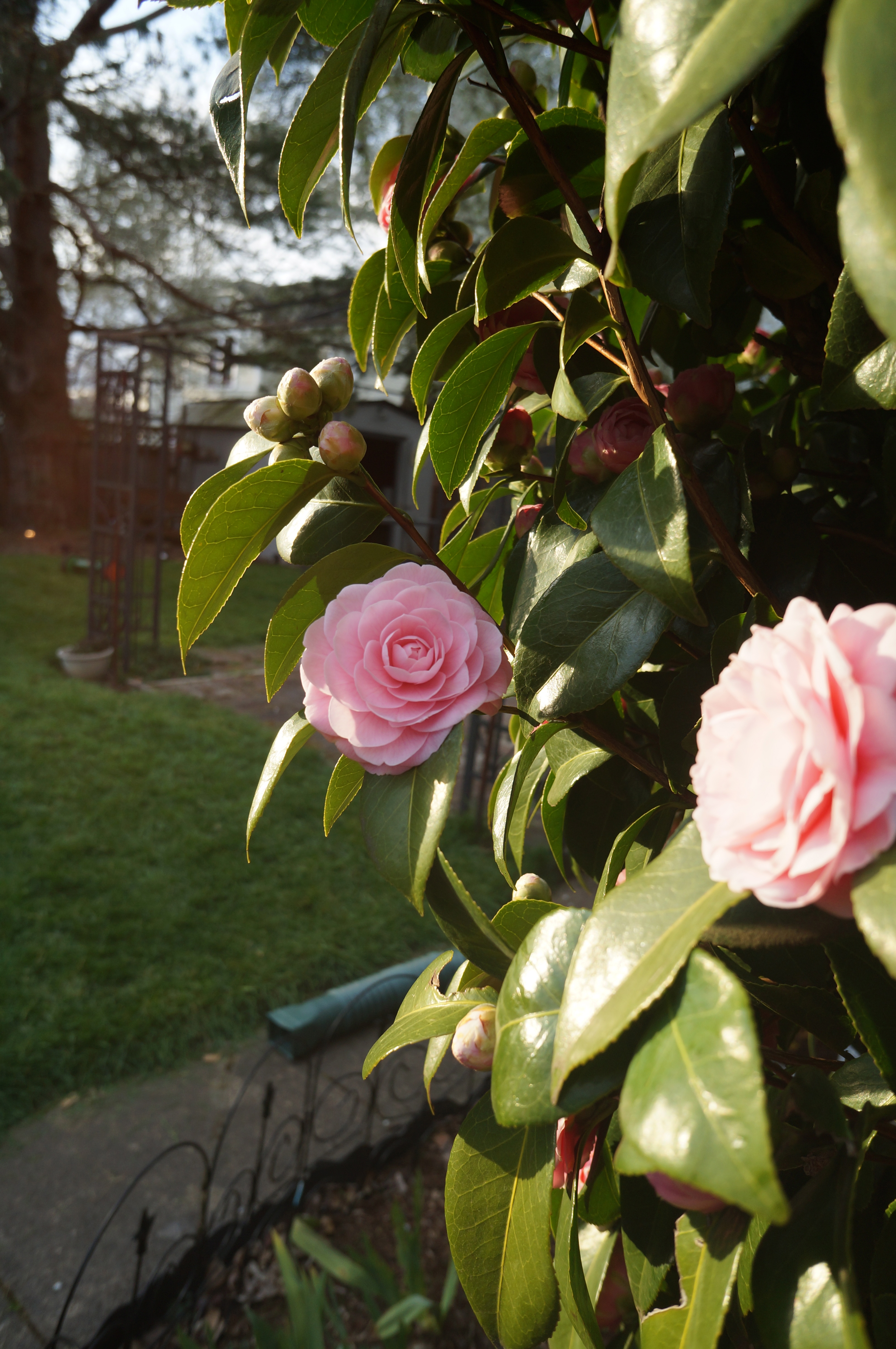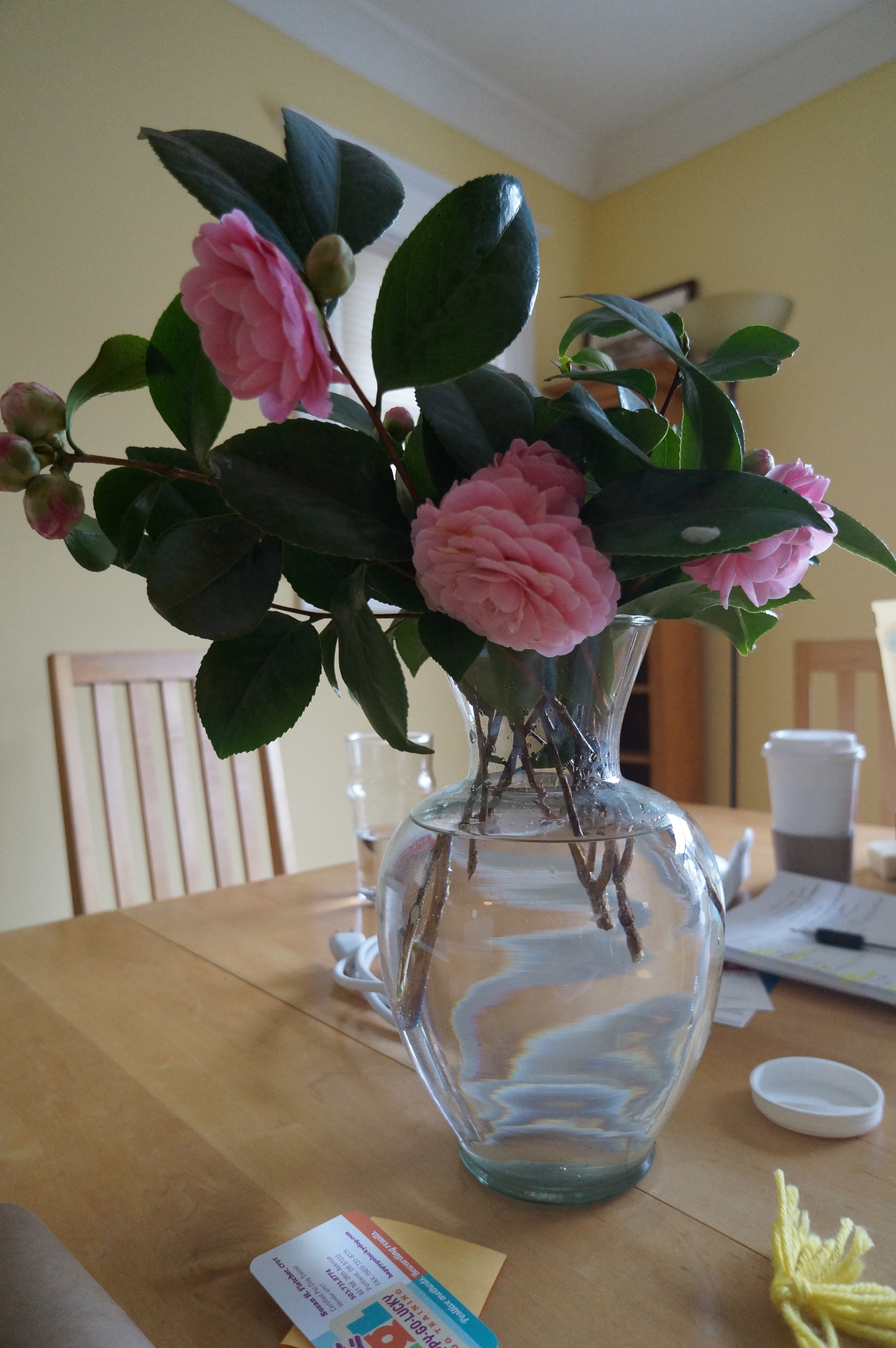 We trimmed the Camellia bush, or whatever it is, today, to let more light into our room. I hope it survives our amateur hacking away at it! We tried to avoid the blossoming branches, but some got cut by accident, so I made use of my vases: