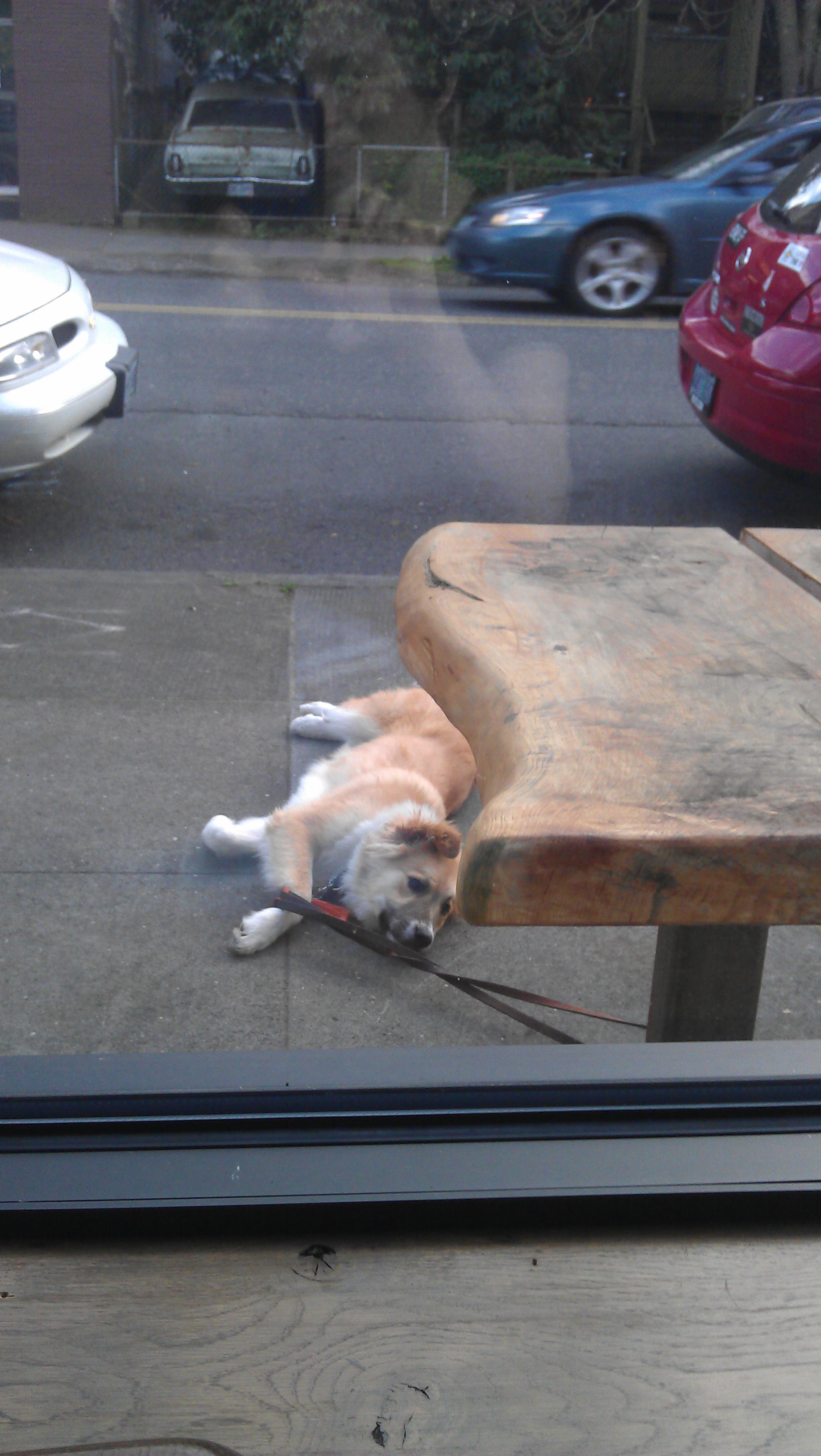 After that first visit, we walked back up Division and met Jan for some delicious happy hour food. They didn’t make me buy a drink. 🙂 I tied Andrew outside and he got lots of attention. At one point he was rolling on back and asking for a belly rub whenever he saw someone approaching.