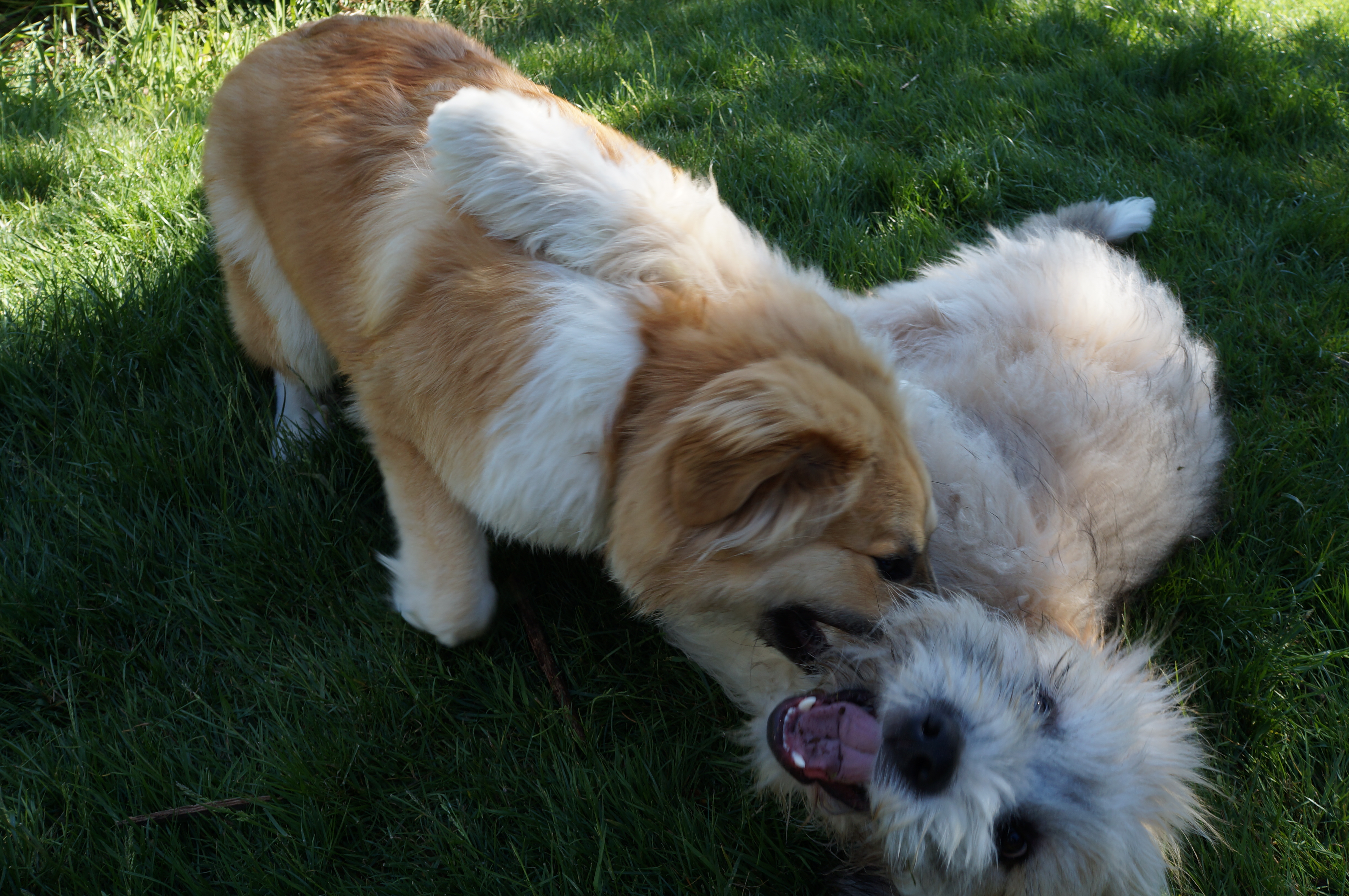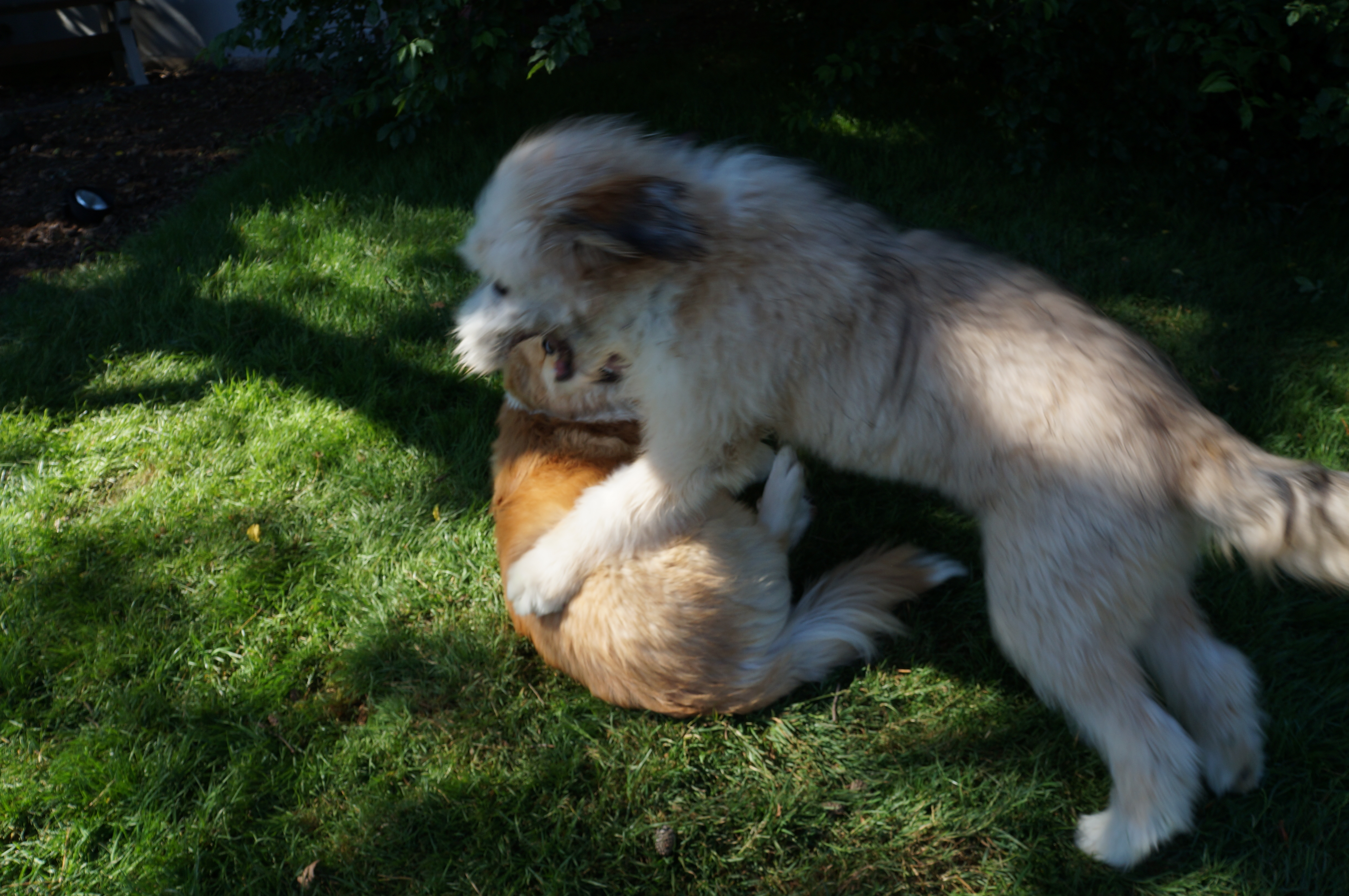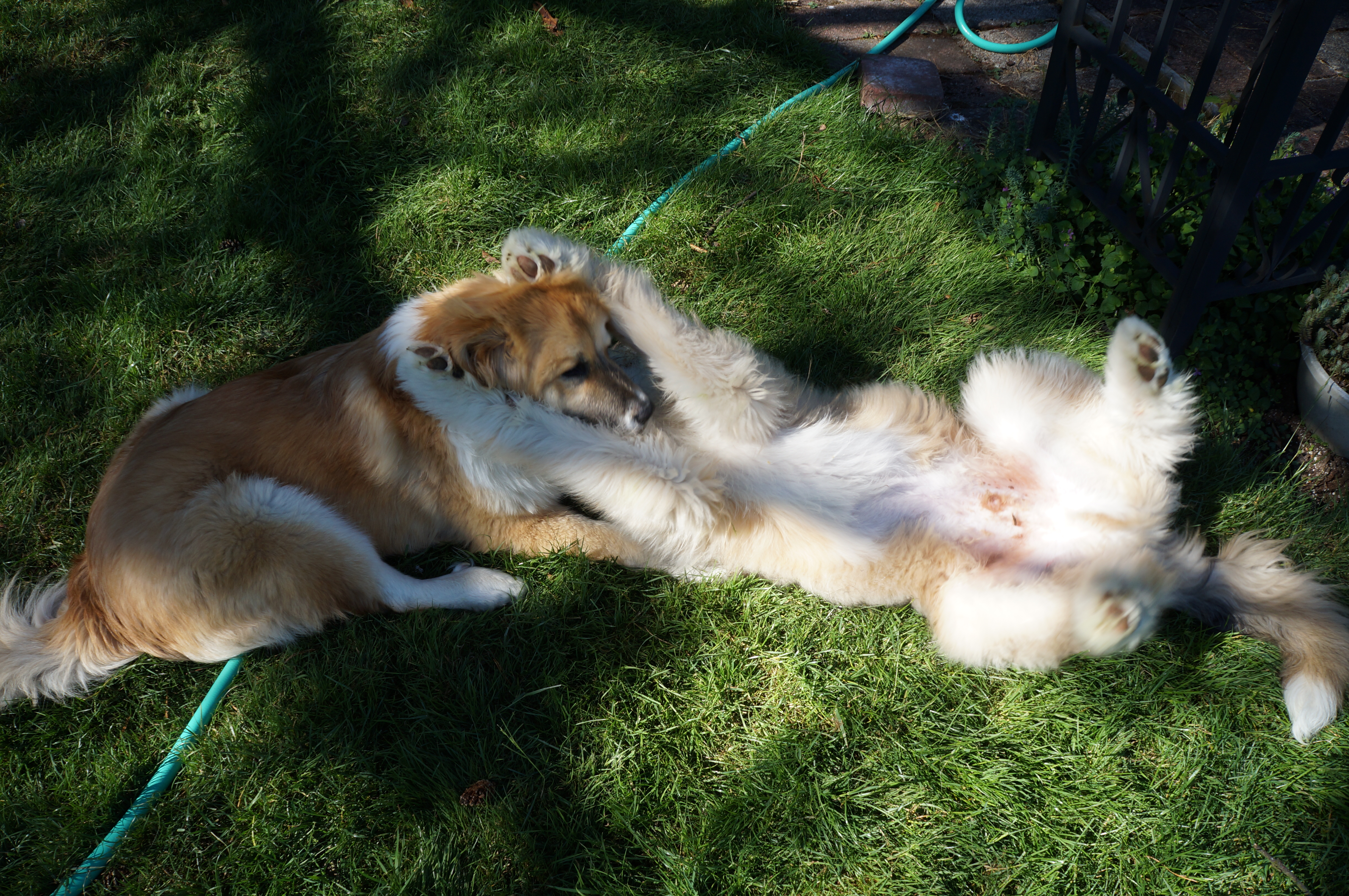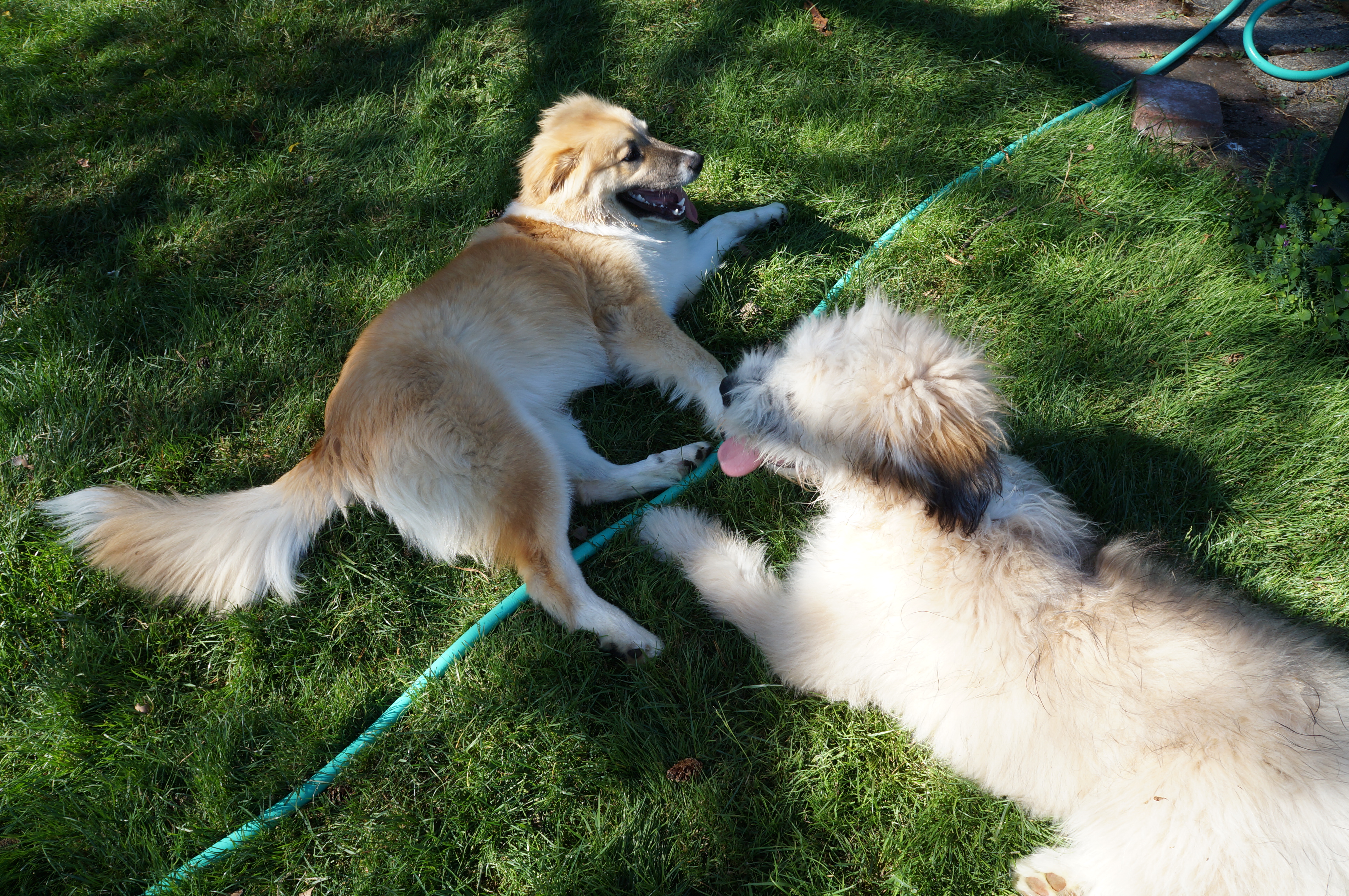 We went out for Mexican food with the dogs, who mostly laid down nicely together: