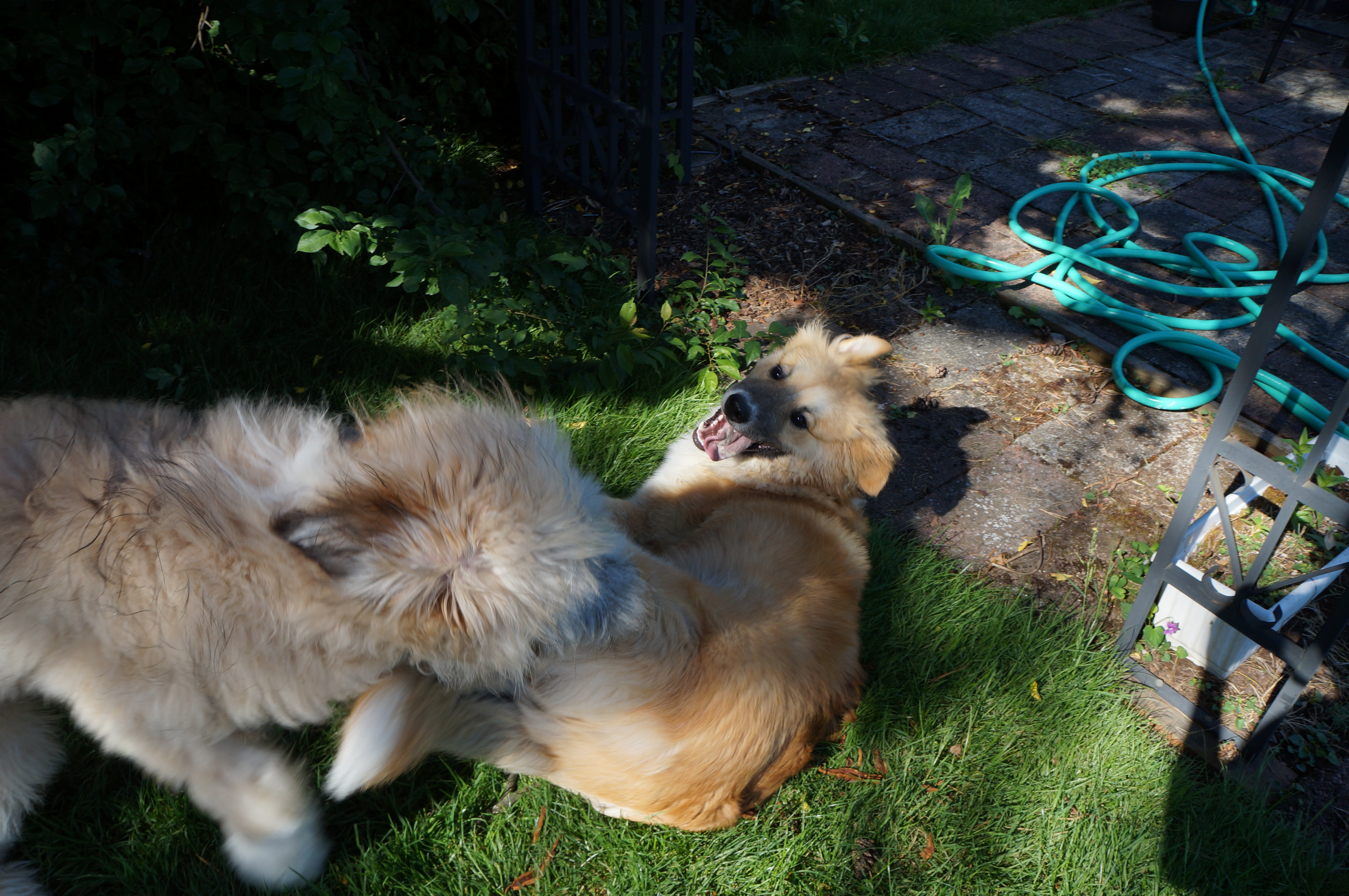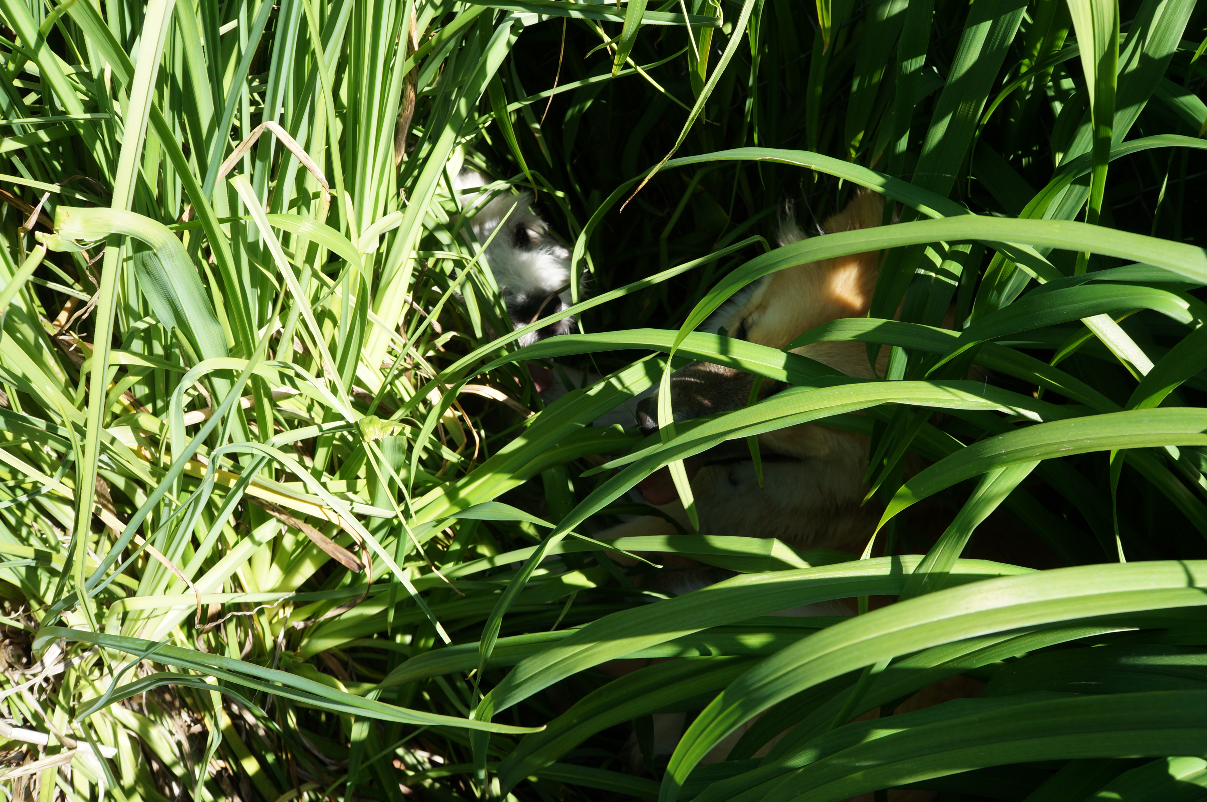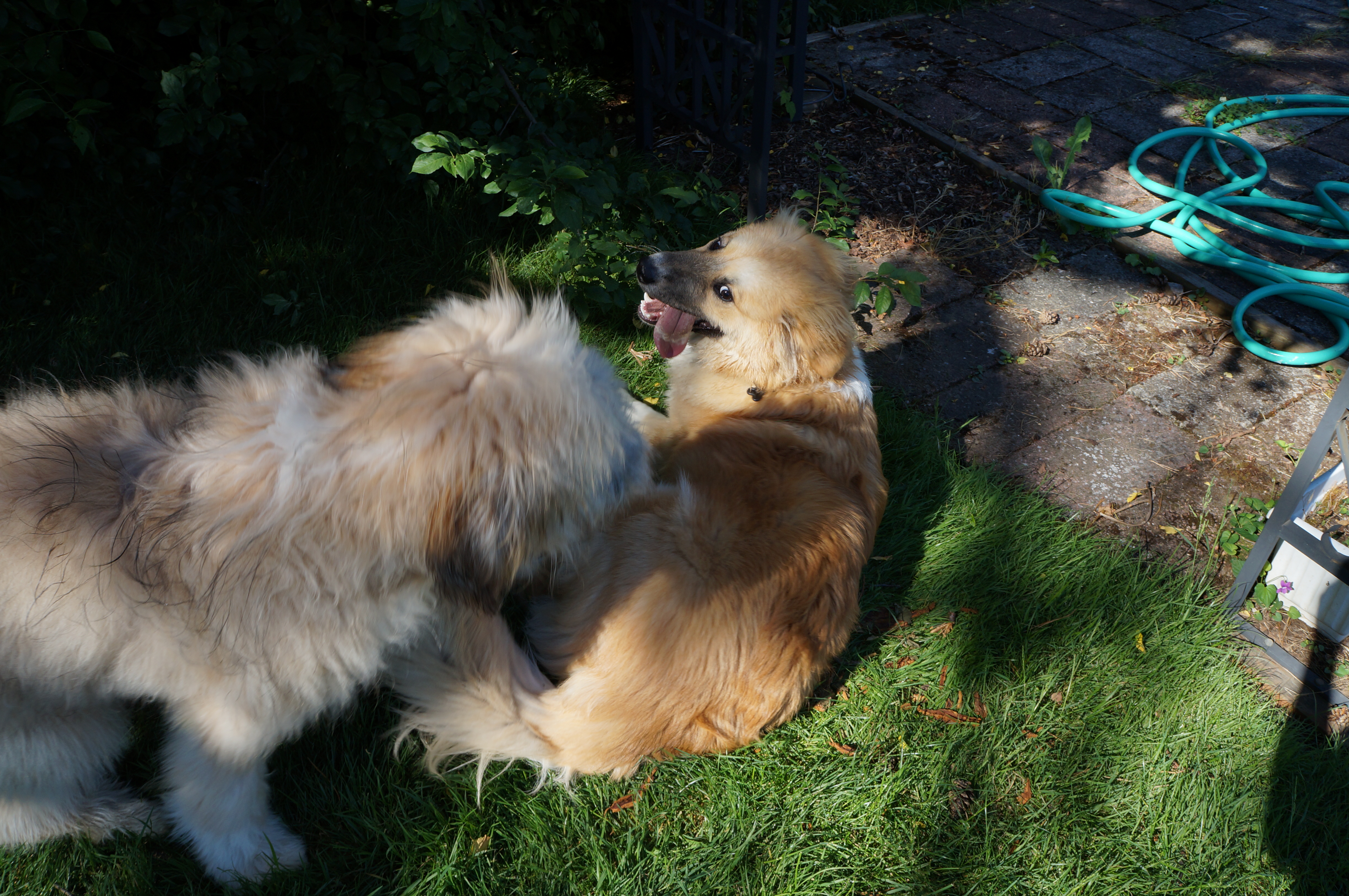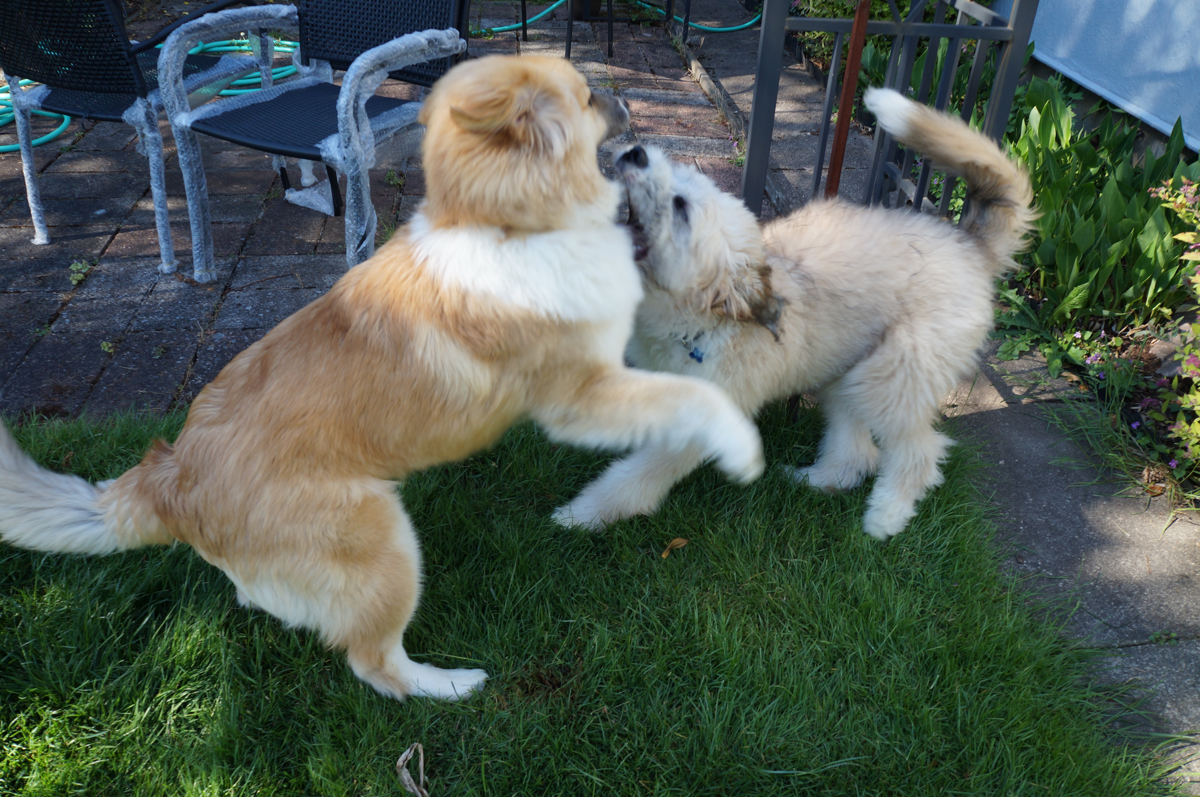 We went out for Mexican food with the dogs, who mostly laid down nicely together: