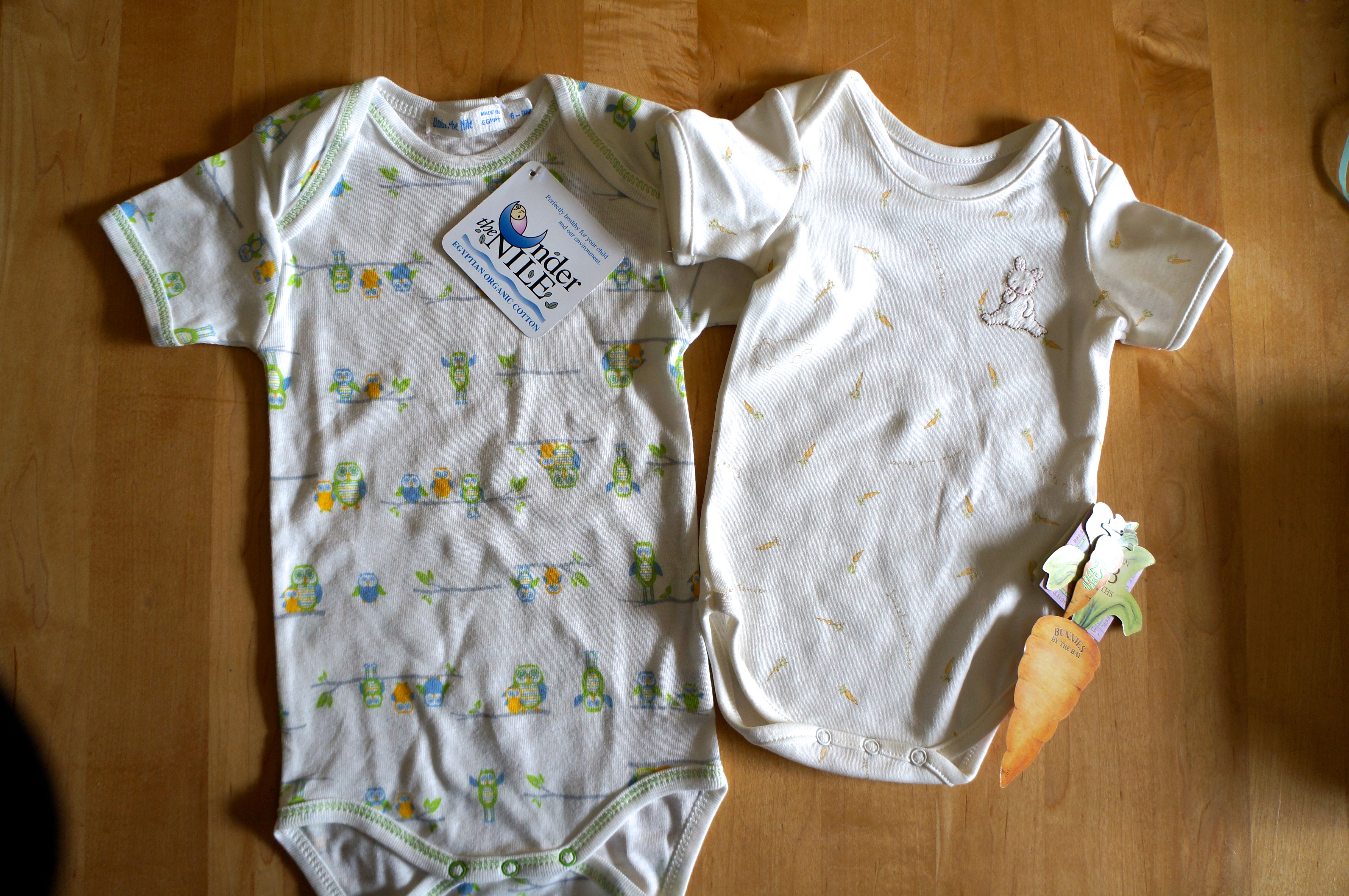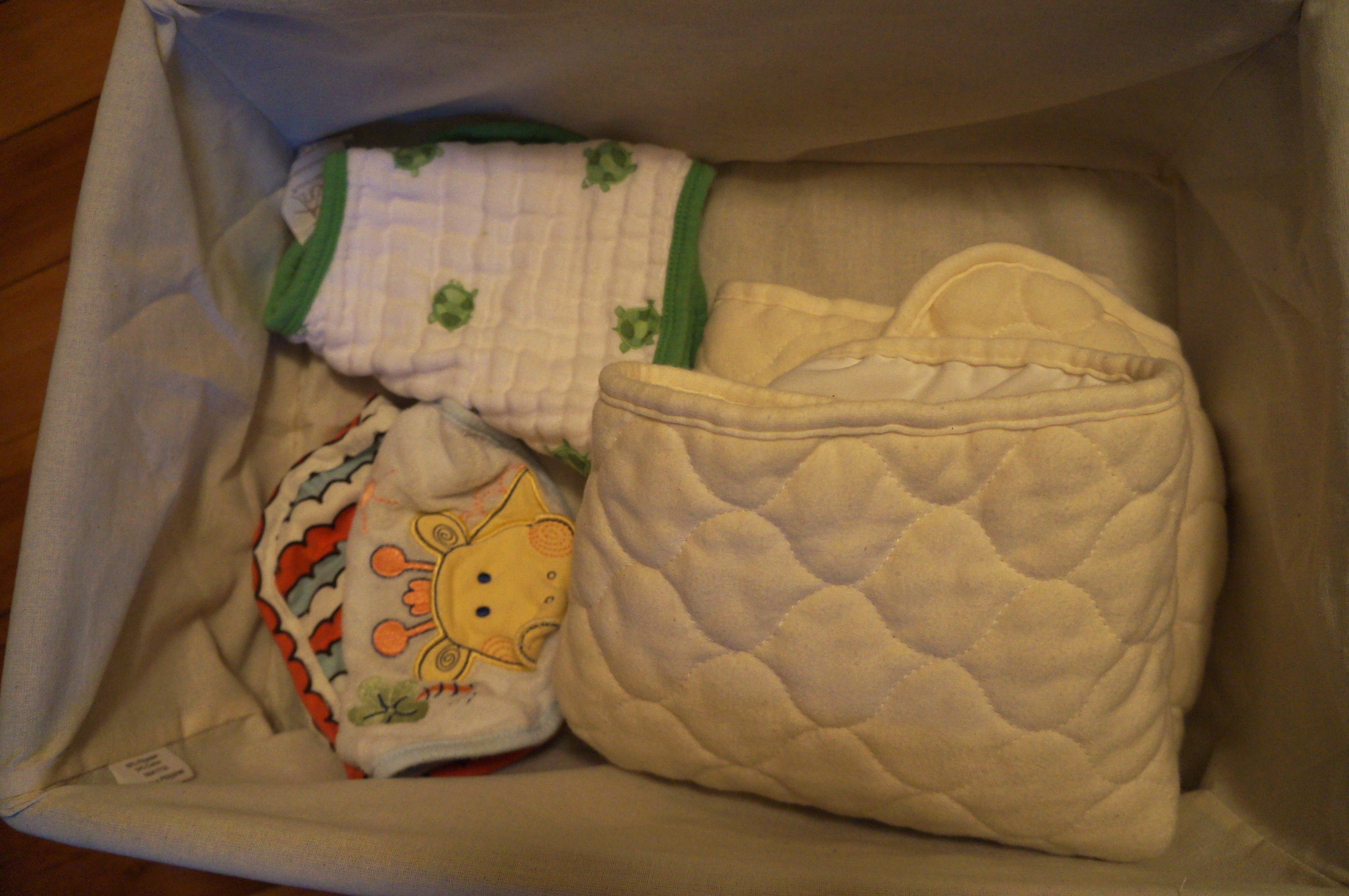 First, I ordered these items with the gift cards from my coworkers. The organic cotton gown thing was on sale so it was reasonable, and I got a very well-reviewed bib/burp cloth and a couple of the hemp diaper inserts for the Thirsties wraps: