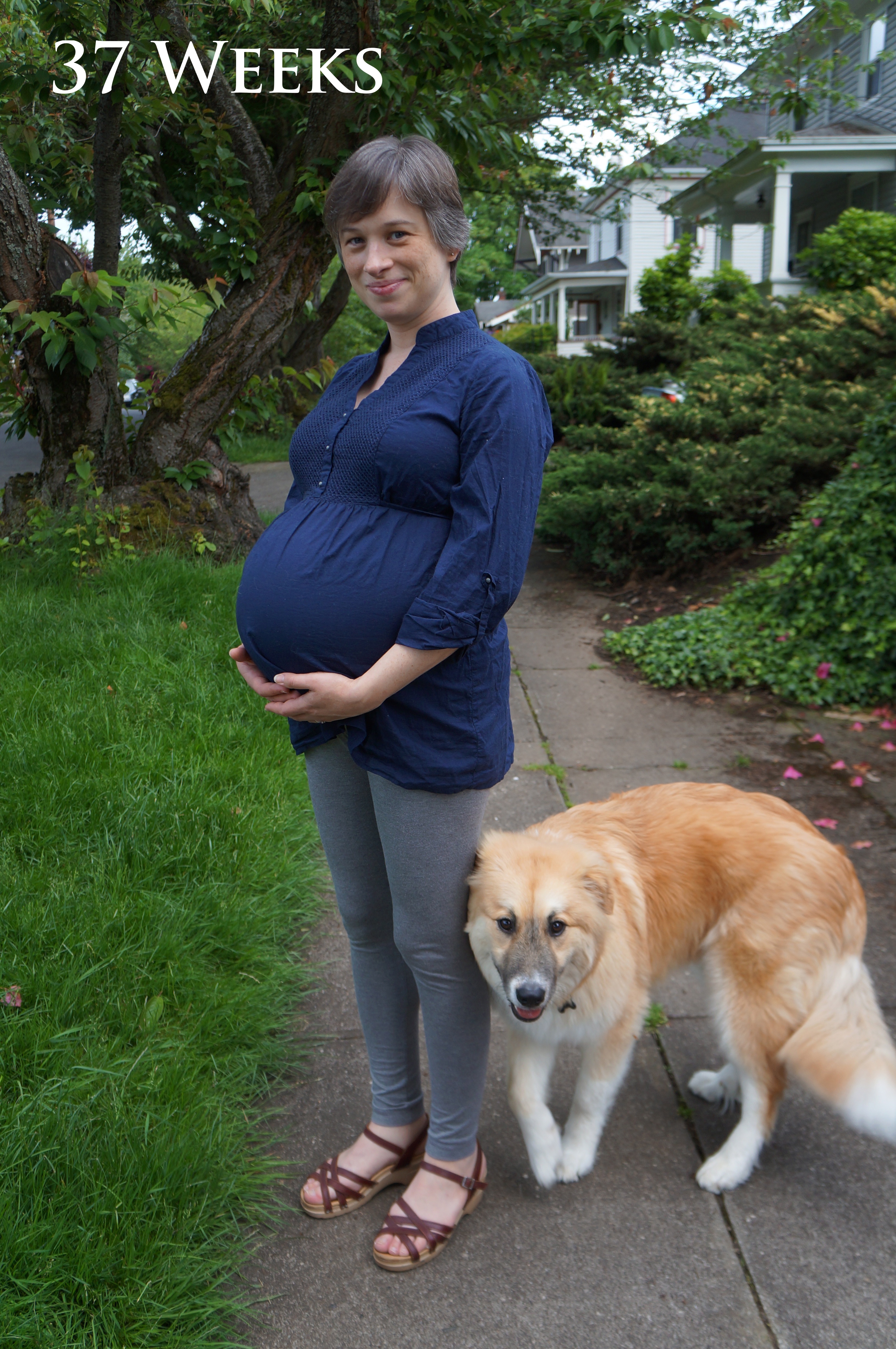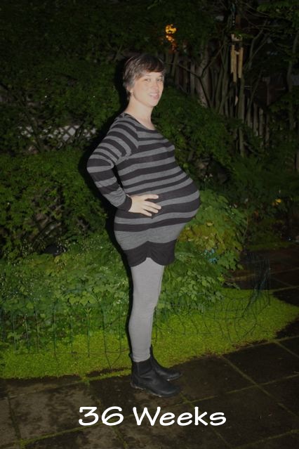I’ve really packed on the pounds — and the puffiness — in the past couple of weeks. I’m finally having Braxton-Hicks contractions (for the past week), especially when I’m being active — at work, walking the dog, or cleaning the house, mostly. Sometimes it feels like cramping and sometimes like I got the wind knocked out of me. I keep wondering how I’ll know when I’m actually in labor, but people tell me I’ll KNOW. But I still keep fantasizing that I won’t realize I’m in labor and he’ll just pop out. 🙂 That would be messy though.