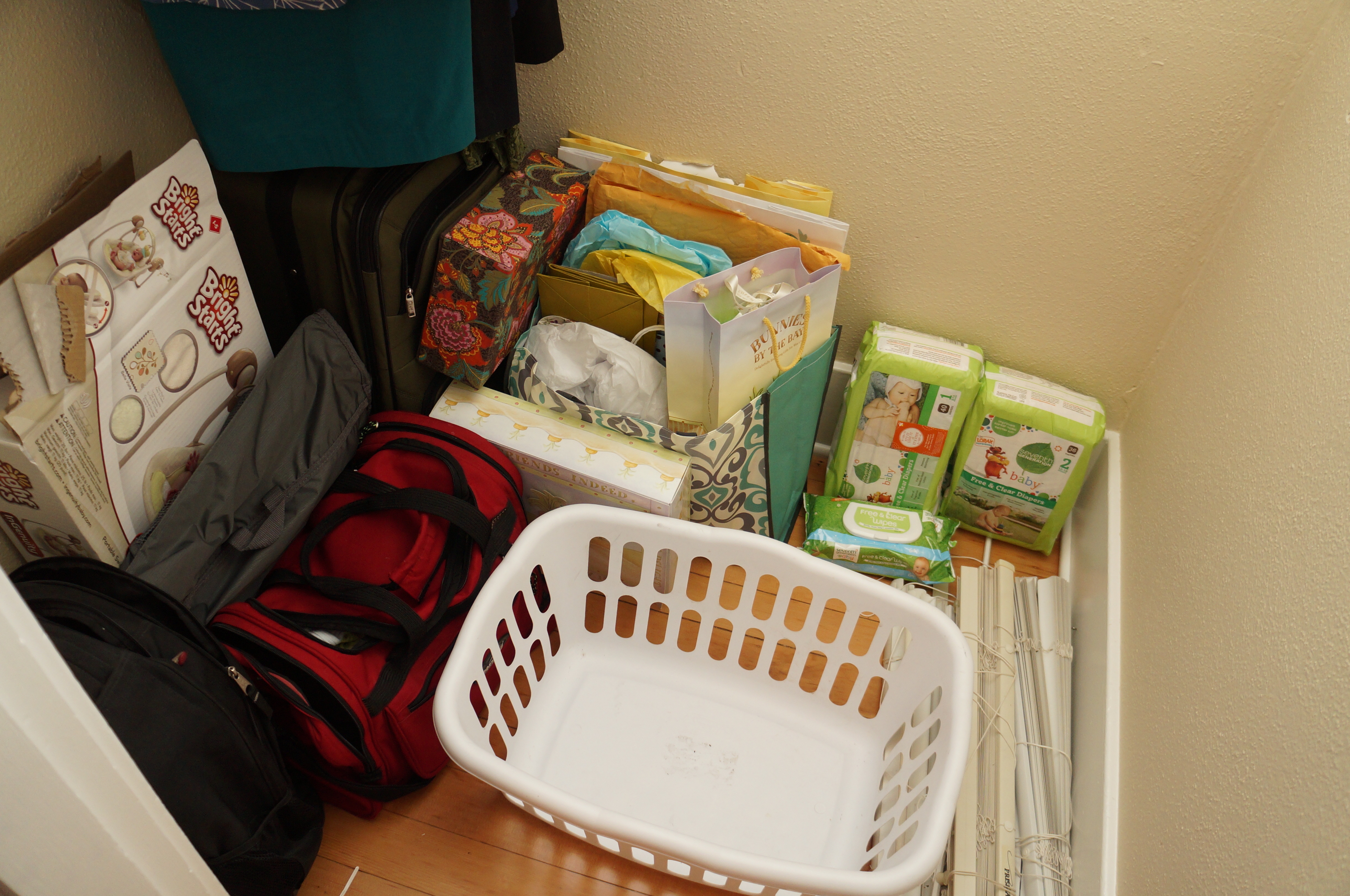 In the closet, I like the cute little hamper, and the red bag is being used to store clothing that won’t fit yet: