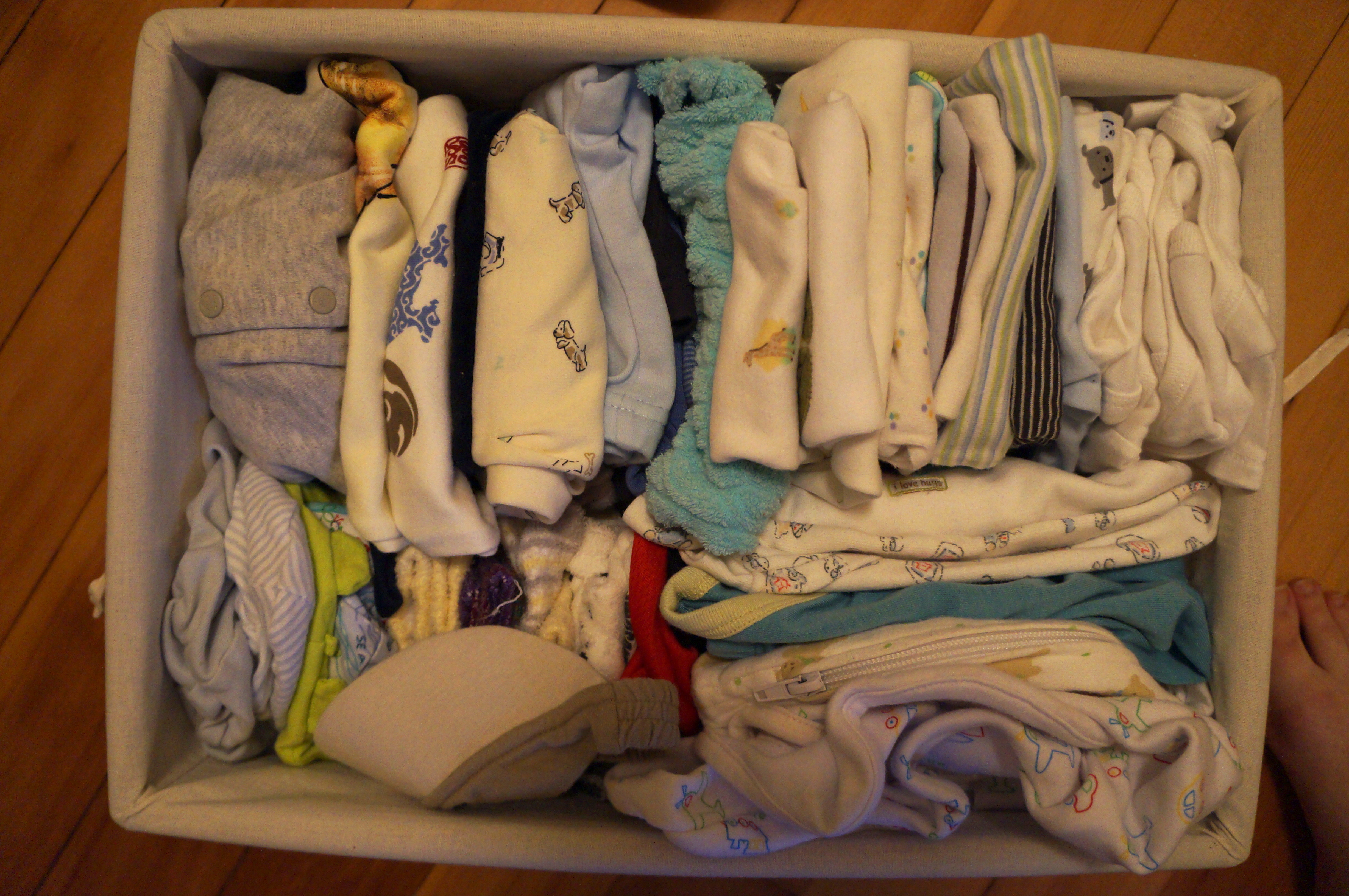 We somehow managed to fit everything into the car for the trip home, and today I spent a while removing tags, washing and folding, and adding things to the nursery. Here is one wall, where I would like to add a dresser but it’s not necessary yet. I put the toys and stuffed animals on chairs so that Andrew won’t take them (I need a dresser or shelves to keep them out of his reach!). I still have a couple of blankets to add to the blanket basket; one is hanging to dry right now. I’m keeping cards and other small mementos in the plastic bin for the time being.