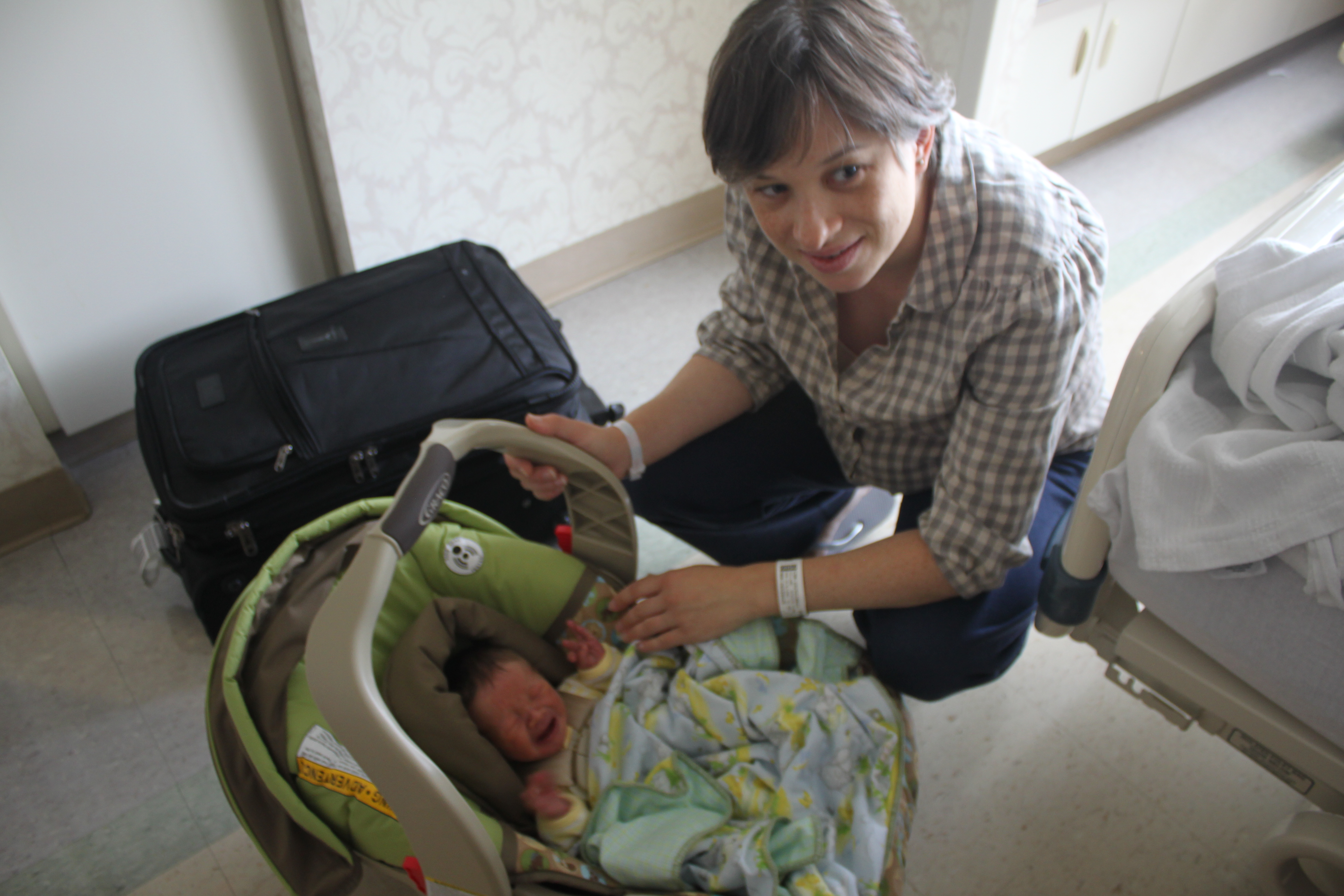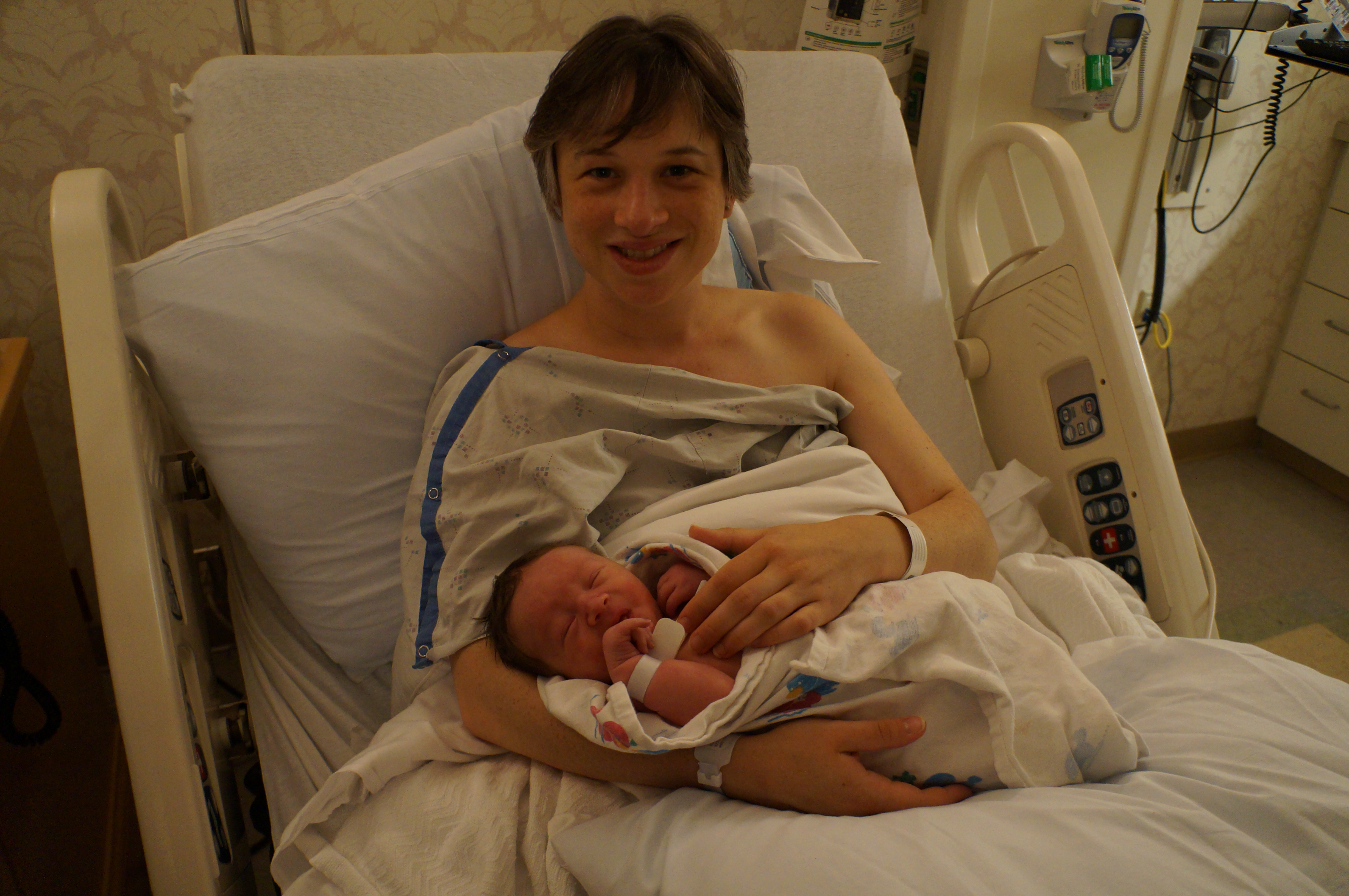 If I sound dramatic now, you should have heard me during my contractions… Anyway, at least it was short! I don’t know how long I should say I was actually in labor. I worked the night of the 15th and started having more consistent contractions the morning of the 16th before I left work. I slept that day and was having fairly painful contractions and back pain in the evening, but I didn’t want to get too excited about it. I couldn’t sleep that night but I was still on a night schedule anyway. I used a contraction timer app to time contractions most of the night just to entertain myself, and they were consistently 3-4 minutes apart but I still didn’t think I was in labor. At 2:30am I thought my water might have broken (it probably didn’t) but I didn’t want to wake anybody up so I waited until 5:30am and called the midwife on call at the hospital, who told me to keep monitoring things and call back in an hour, so I woke A. up and told him the plan, and in that hour suddenly it started to get serious. By 6:30 I was doubled over with the contractions and called and said we were coming in, even though I was still afraid I was leaving the house too soon.