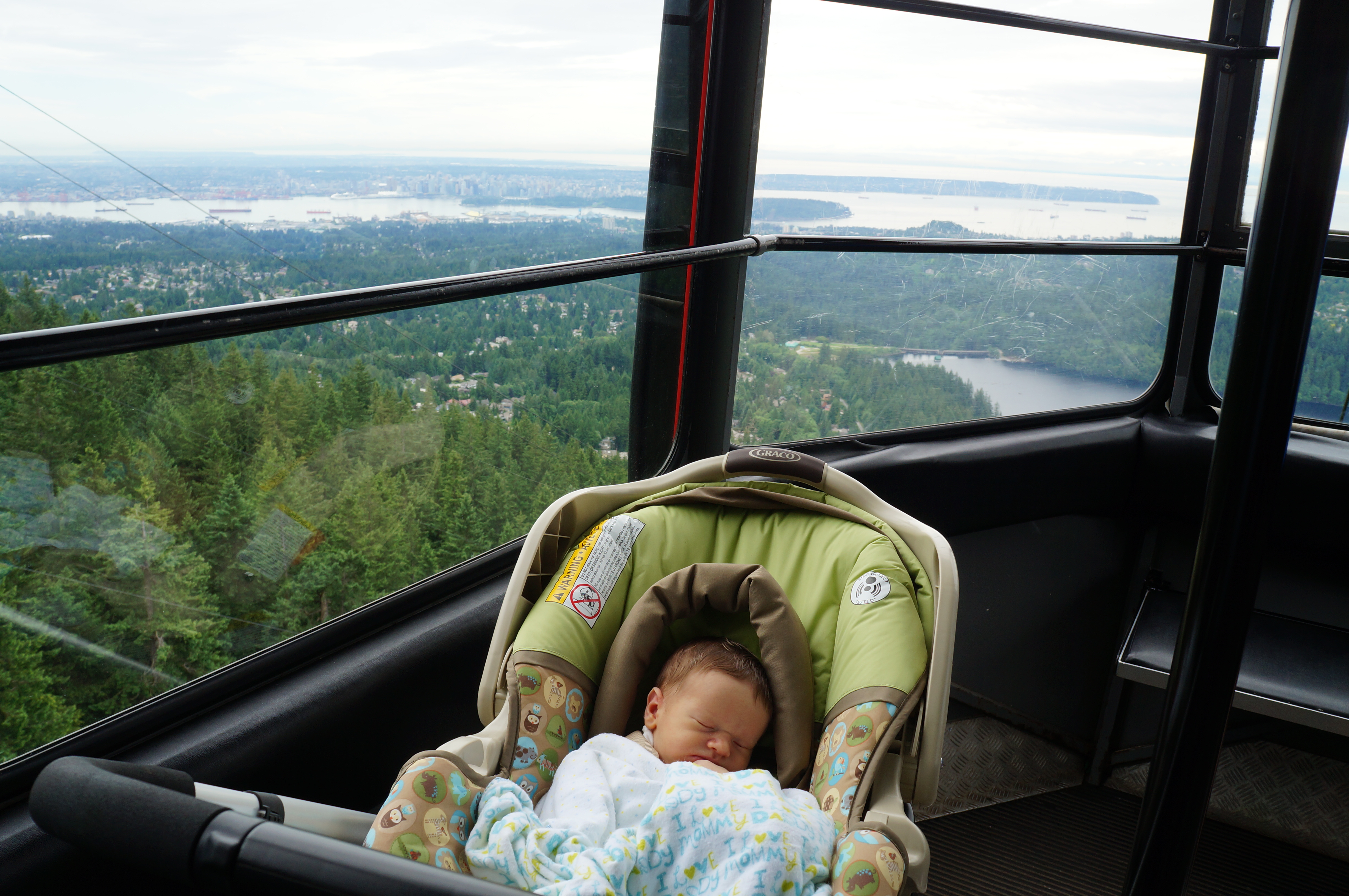 When Ari was 9 days old, we left for A.’s brother’s wedding in Vancouver, B.C.! I’m not going to post pictures of all the family members, but it was a great time and everyone got to meet Ari. Here’s Ari in the gondola up to the mountain-top wedding: