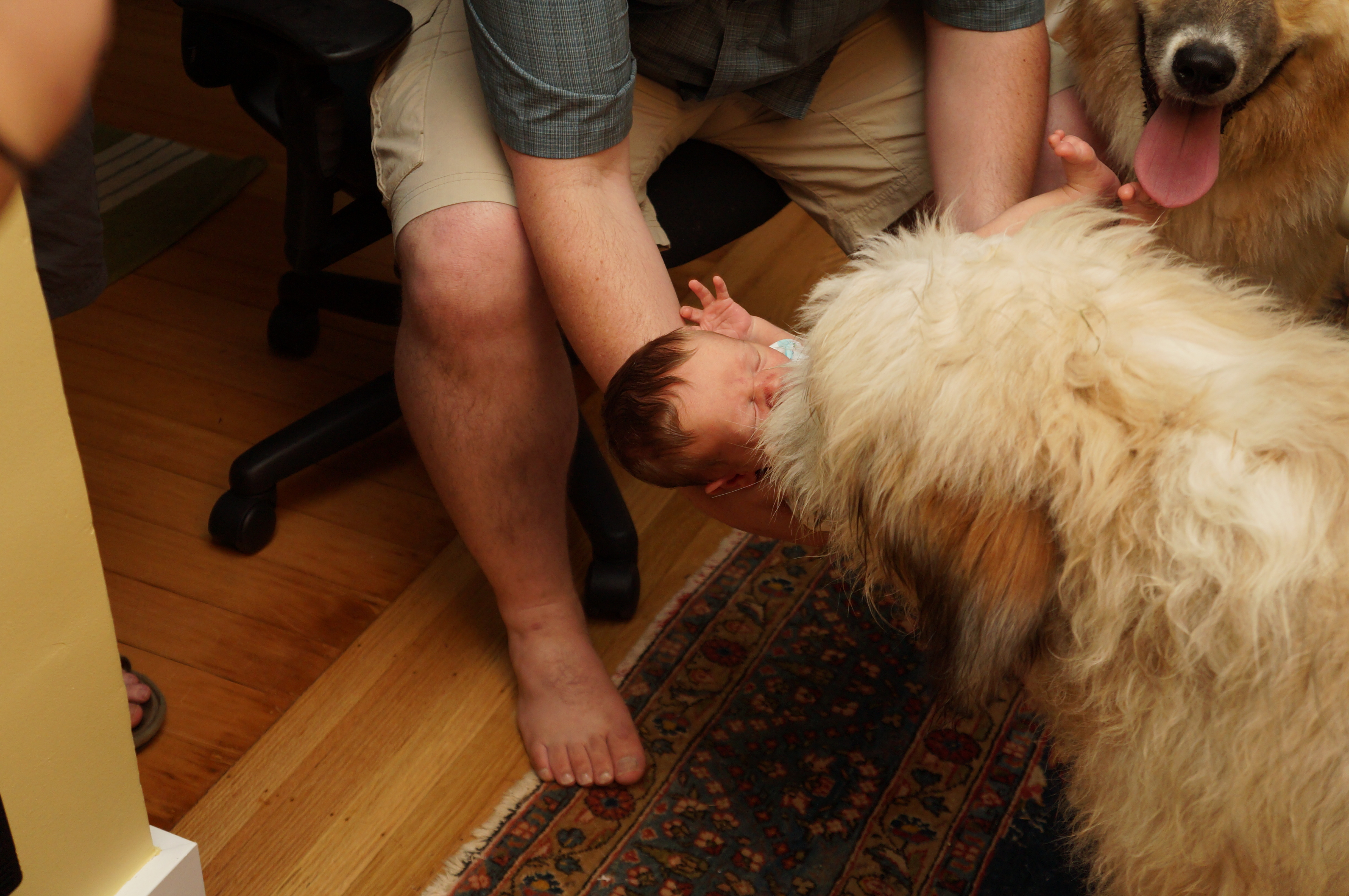 Jan and Pat brought Baker over and Jan was trying to keep Baker away from Ari but A. introduced them before she could stop him and Baker was very good and just sniffed and licked him nicely. Andrew tolerated it fine and mostly has been okay with Baker sniffing Ari, but one time when Baker was getting a little excited Andrew got stiff and growled at him, so I moved them away before they could start snapping at each other in front of Ari’s face.