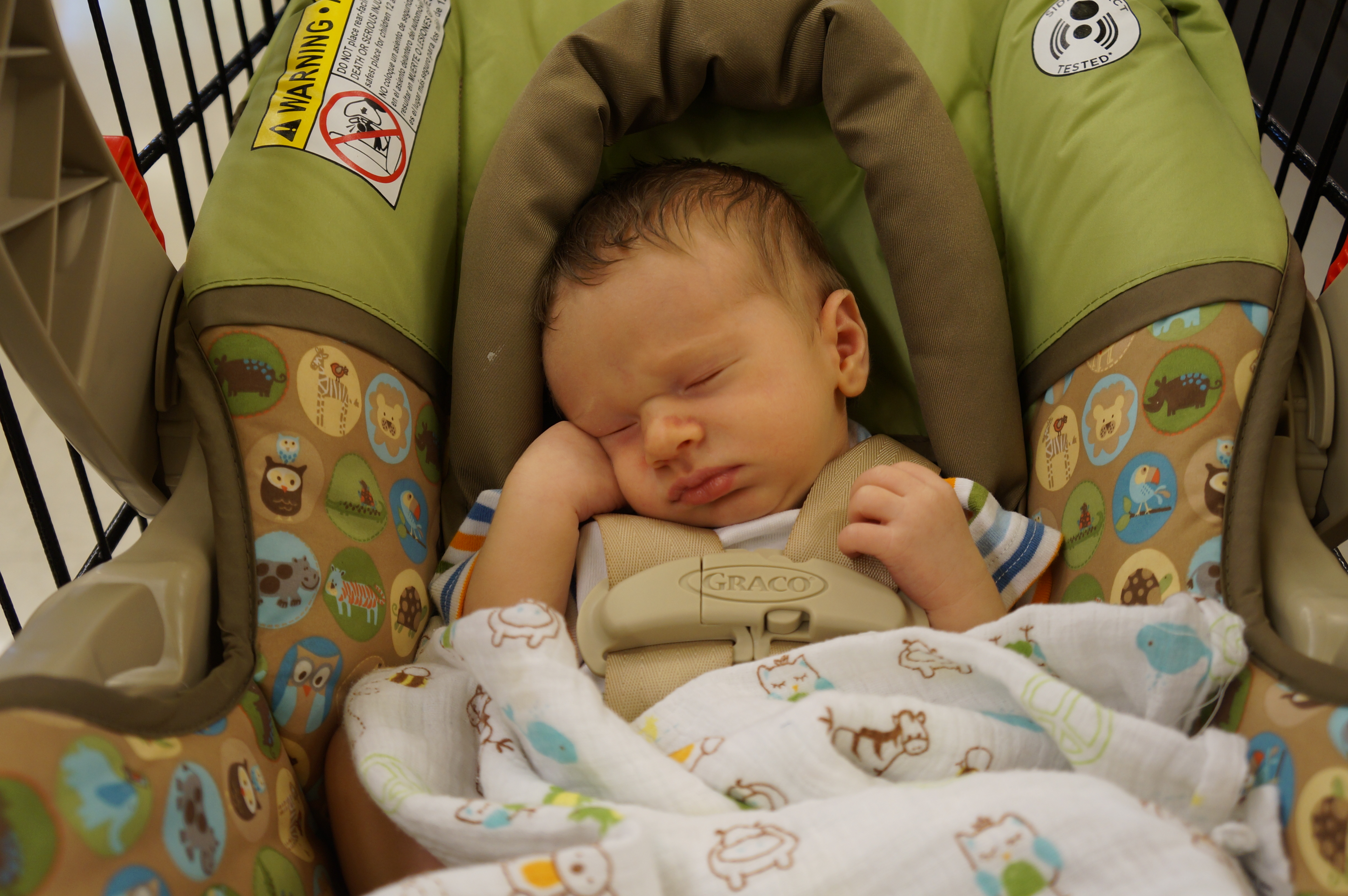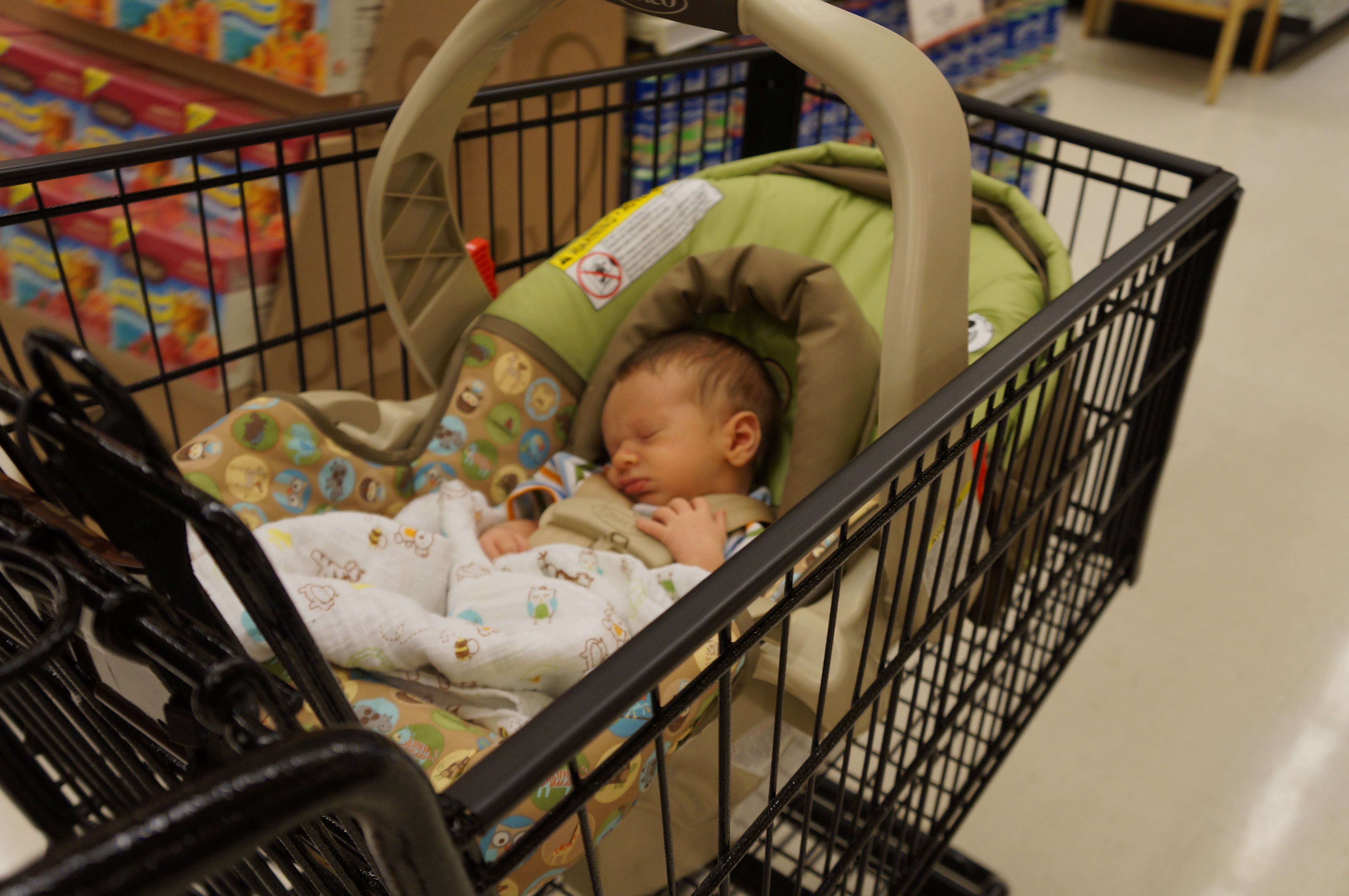 On the 4th of July, Jan and I took Ari to New Seasons for his first grocery store trip. It turns out the carrier takes up an entire shopping cart, so it’s not a good way to carry him in a store!