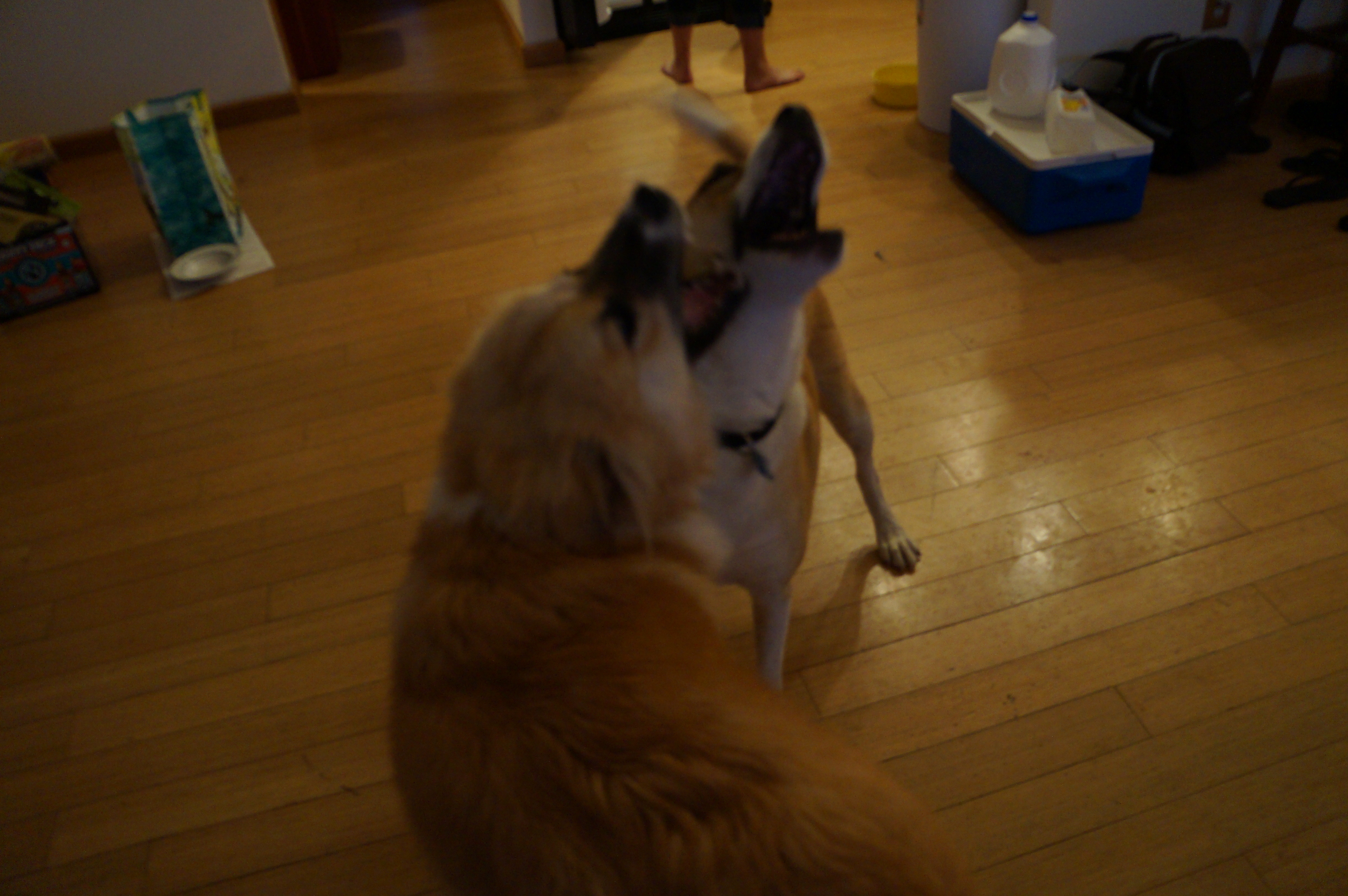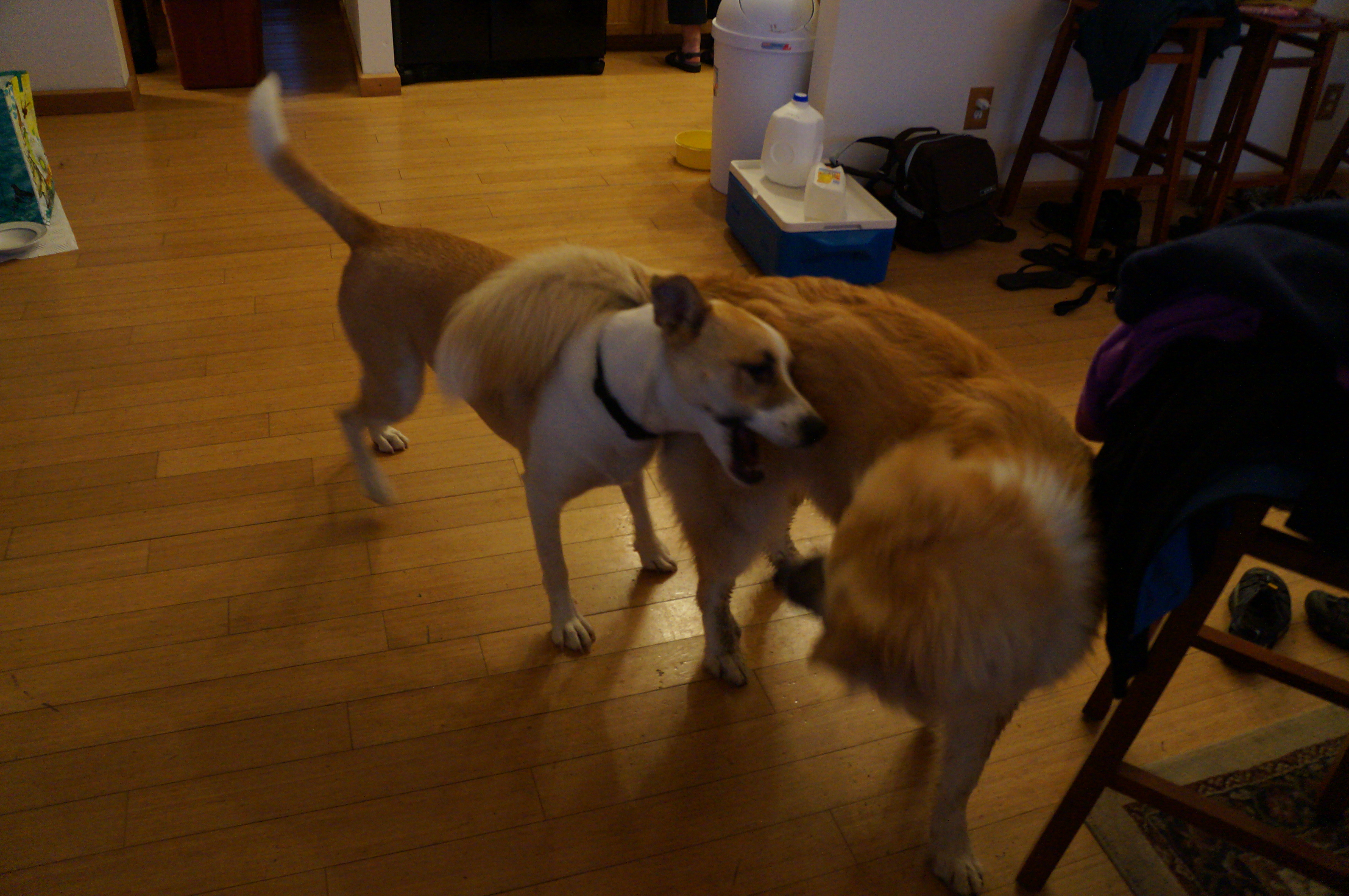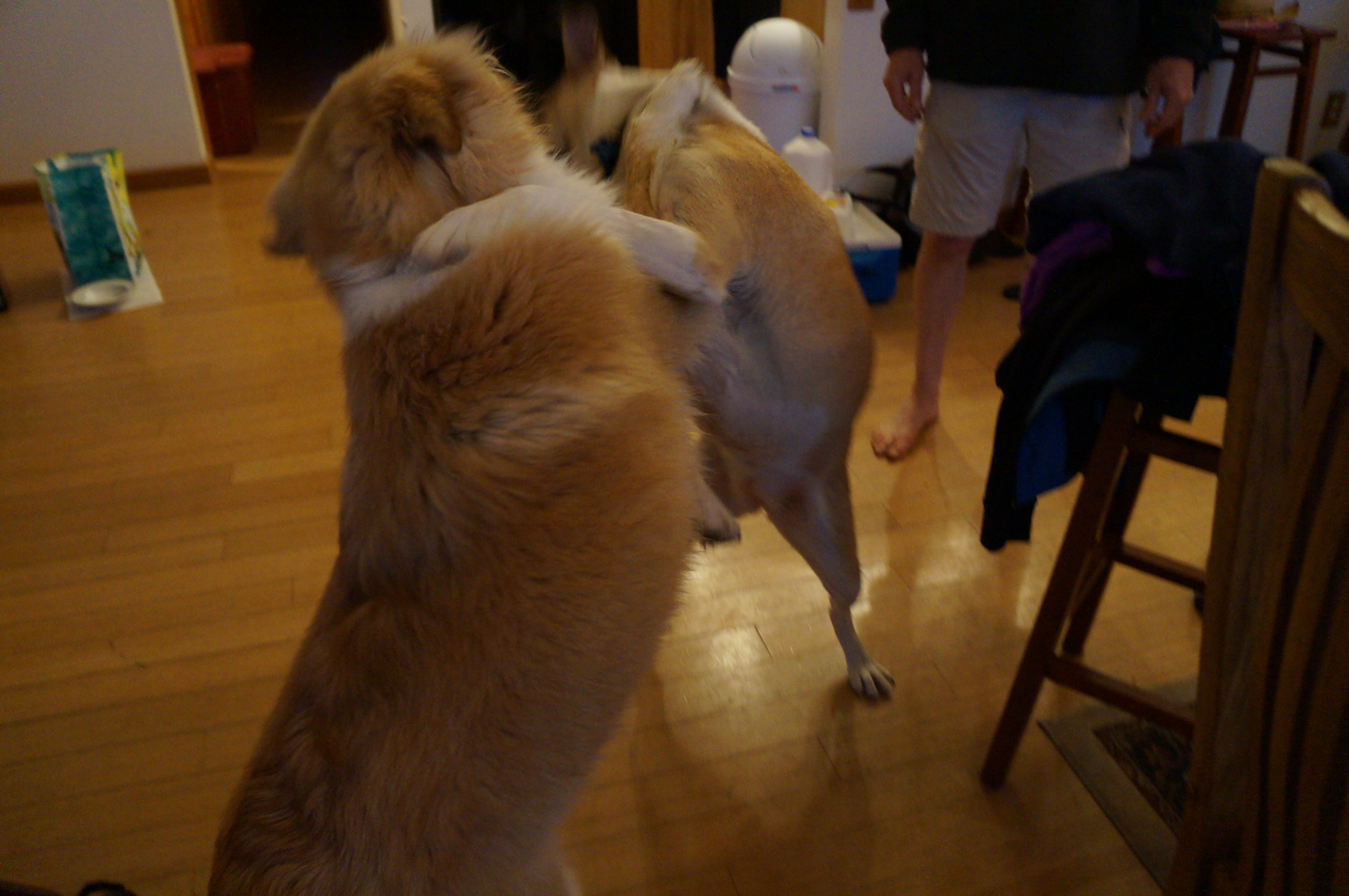 He played with his cousins Luna, Shaka, and Leia. He and Leia met for the first time on this trip. They’re close in age and once they got to know each other, they were playing practically nonstop, and cuddling and licking each other. But Andrew snapped at her when she got too close to Ari!