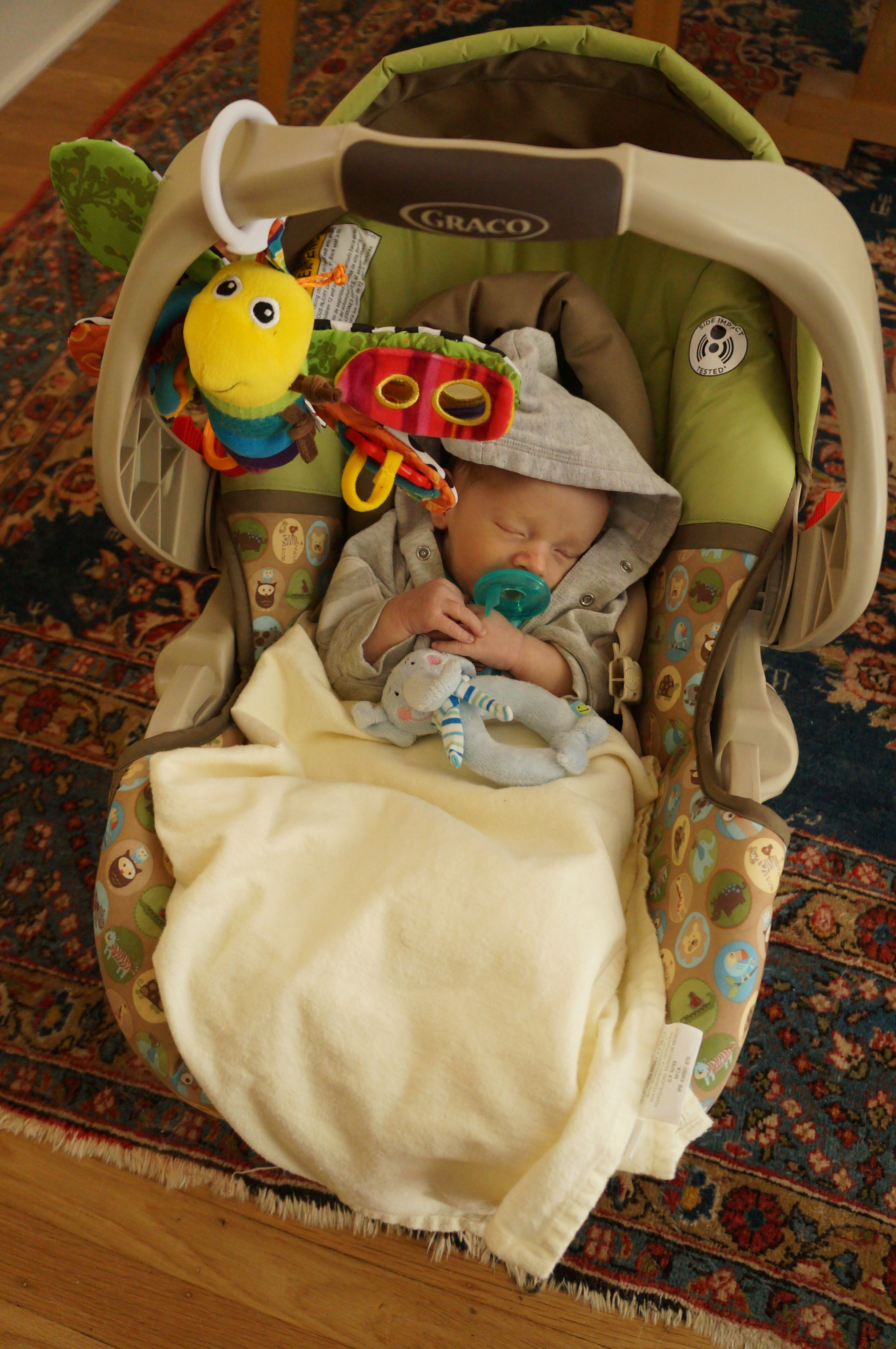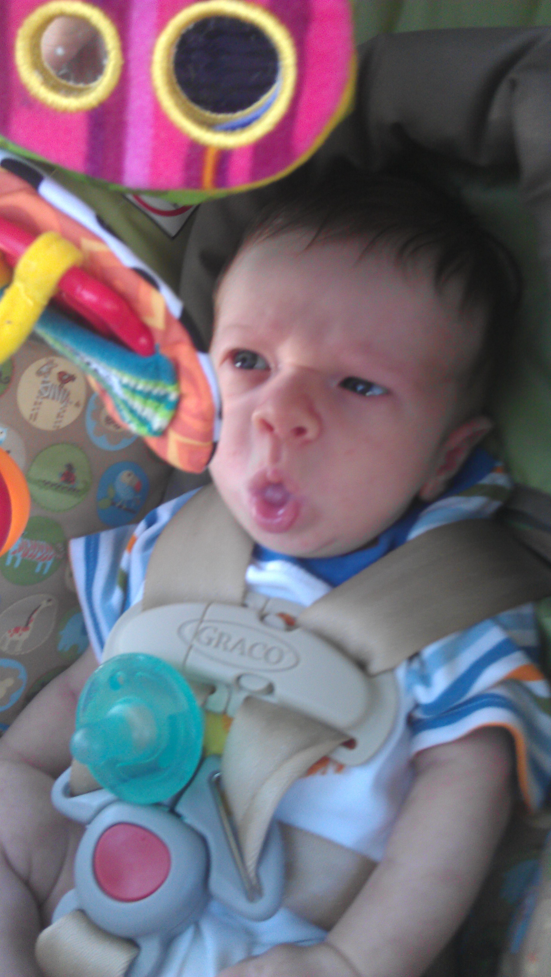 He grabs onto this toy on his carseat, and he’s been holding his pacifier like this pretty much since the beginning: