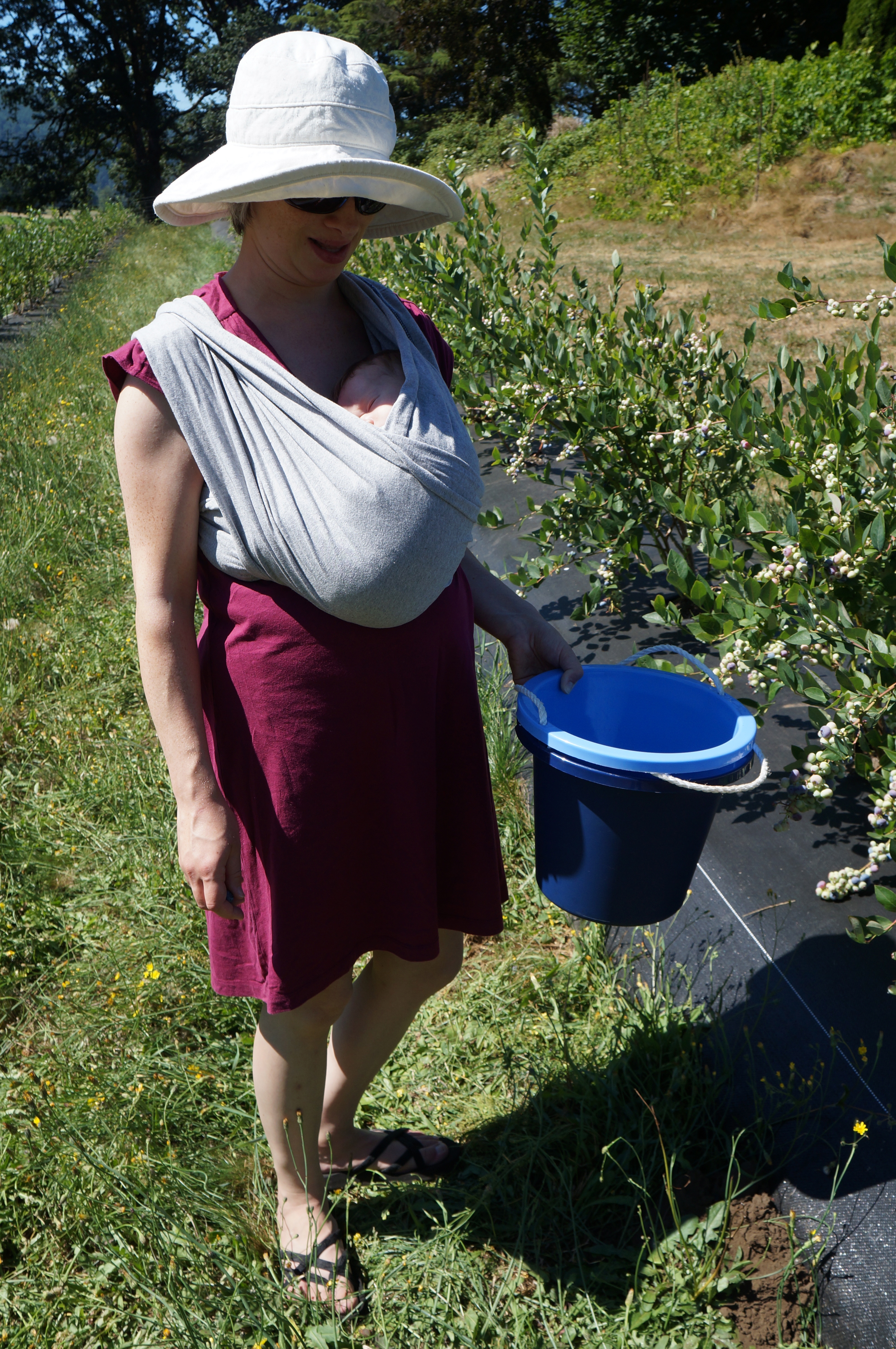 I put him in the carrier to pick berries. It was pretty hot, so we didn’t stay too long, and I couldn’t bend over too far!