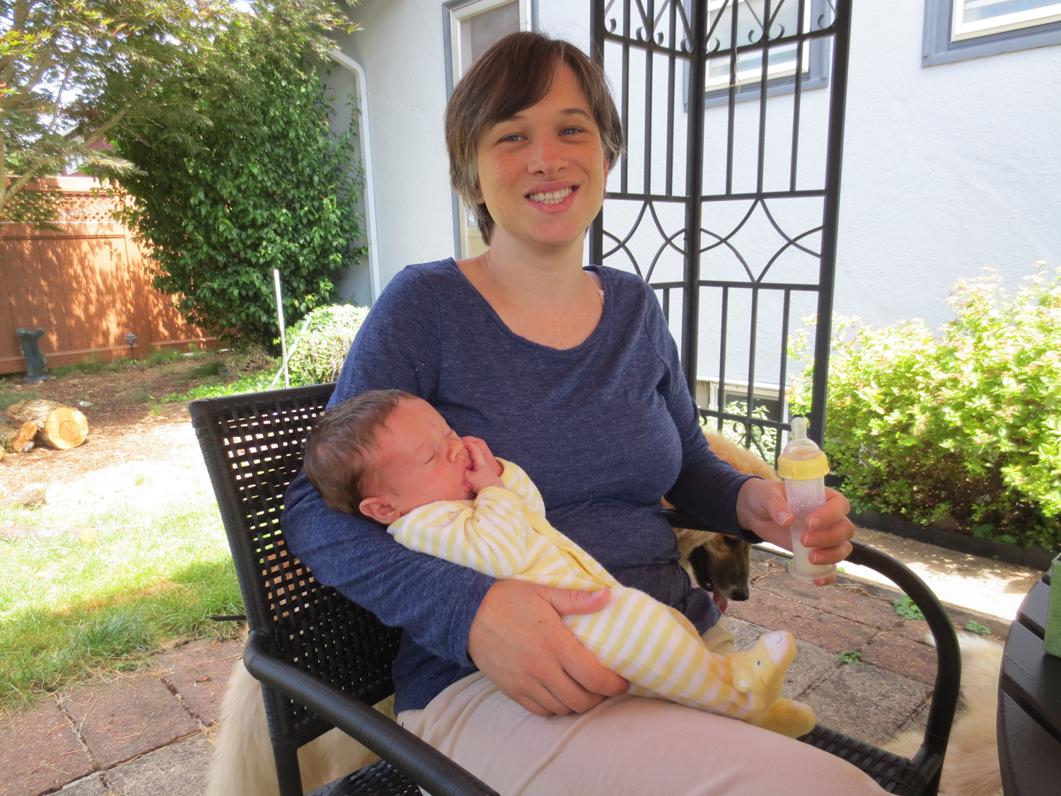 Last week my friend from D.C. visited for a few days, then A.’s dad was here for a few days. Wednesday (July 31st, Ari at 6 1/2 weeks old) was a very active day – my friend and I hiked in Forest Park and toured the Pittock Mansion, trading off wearing Ari in the front carrier. It was a beautiful wooded hike, along a stream part of the way, with a steep uphill to the mansion. I don’t know how long the hike was but the whole adventure took us about four hours. Then, in the evening, we left Ari with A. and his dad and biked to a women’s soccer game downtown! We only made it for the last half hour of the game, so it wasn’t a long outing. On the way back, I couldn’t make it up the long hill to our house so we had to walk our bikes, but overall I had a blast getting out! 15 minutes into the game I said, “Wow, for a whole 45 minutes I forgot I have a baby!” But then I remembered and had to call and find out how he was doing. They had already gone through the milk I had pumped and had thawed a bag from the freezer, as well.