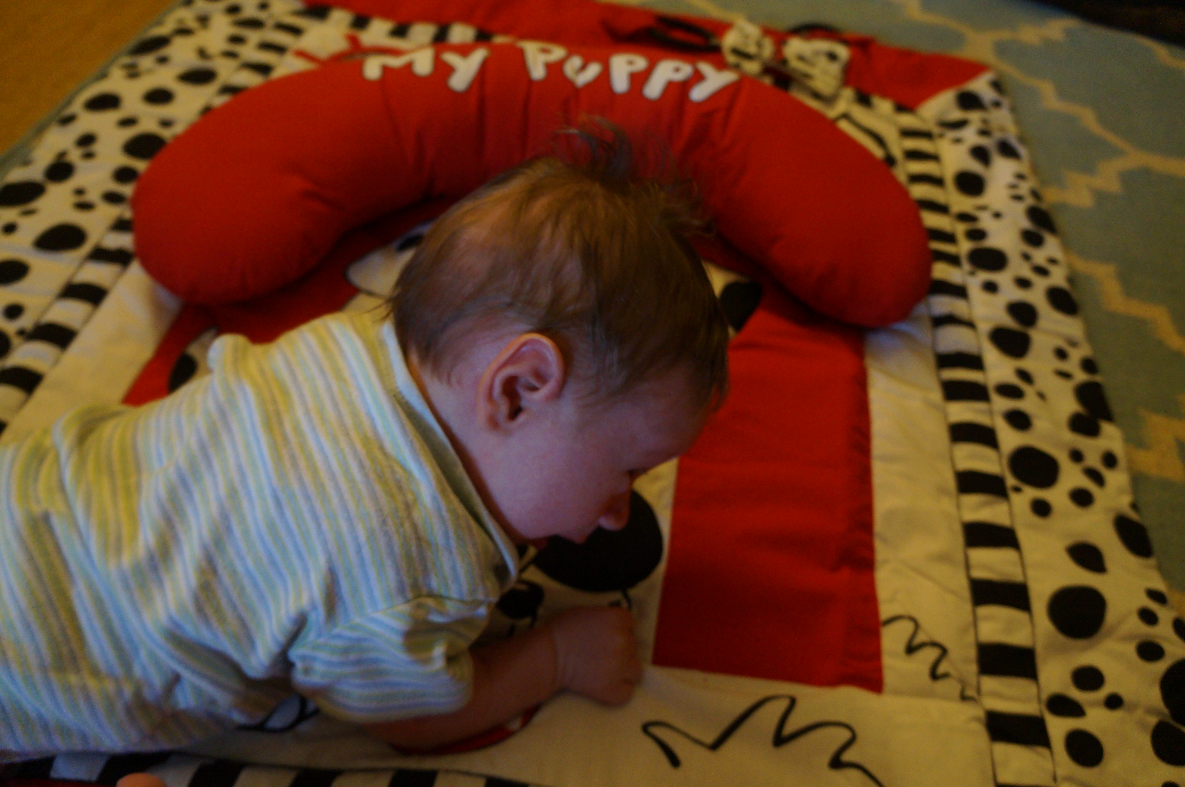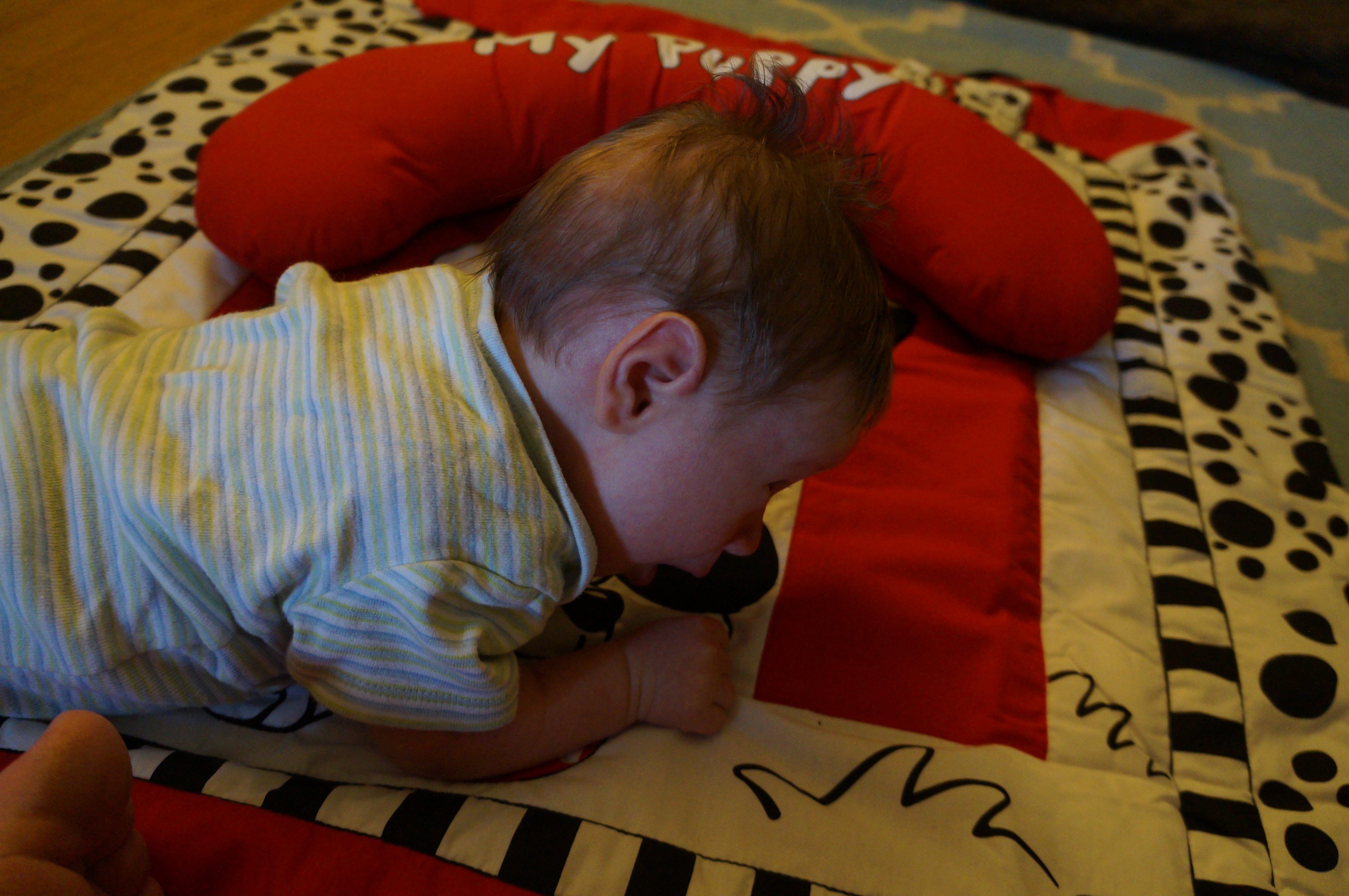 Here he is on his new tummy time mat. He still doesn’t like tummy time much; he gets really frustrated. But again, he’s holding his head up more and more!