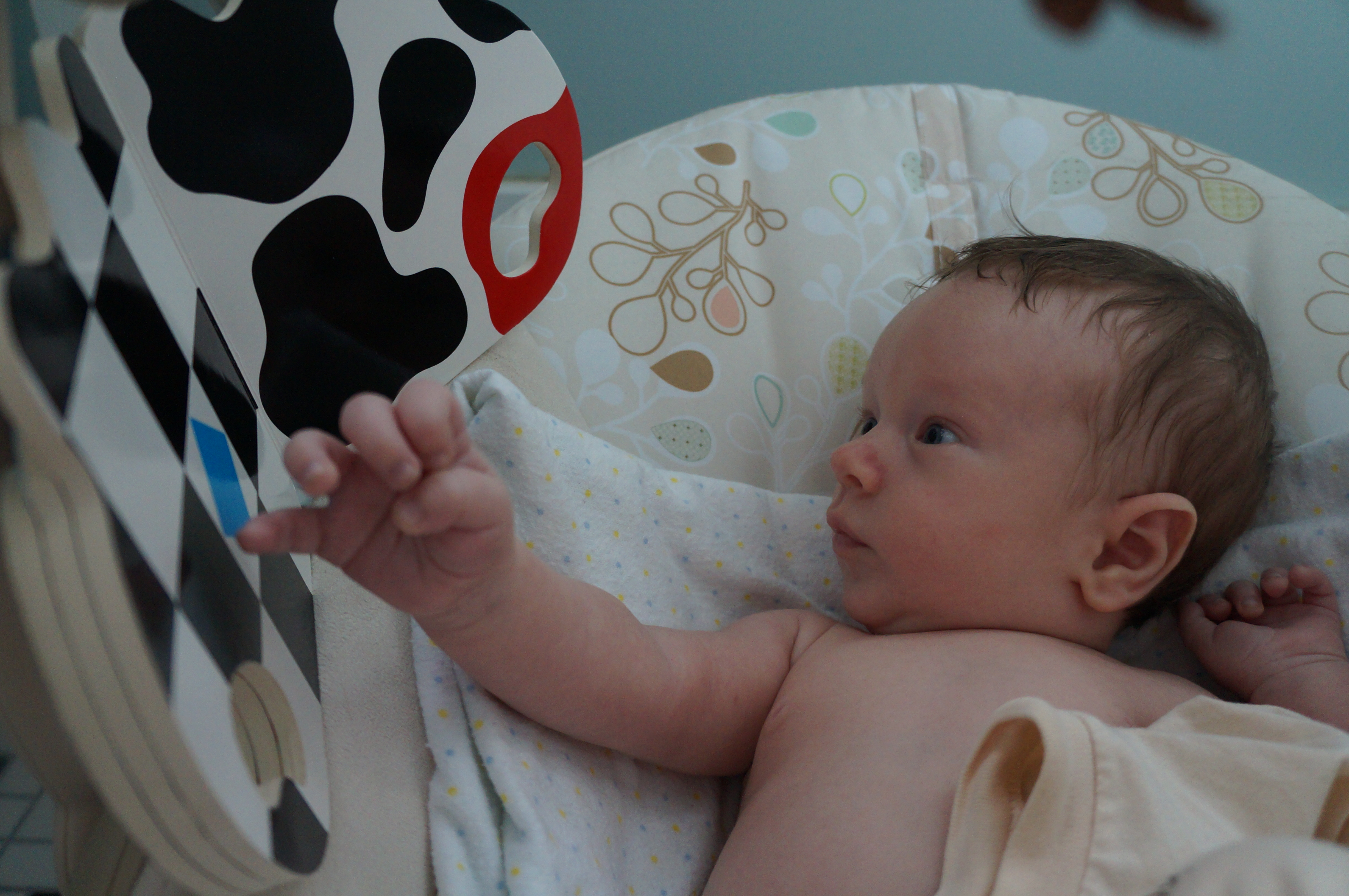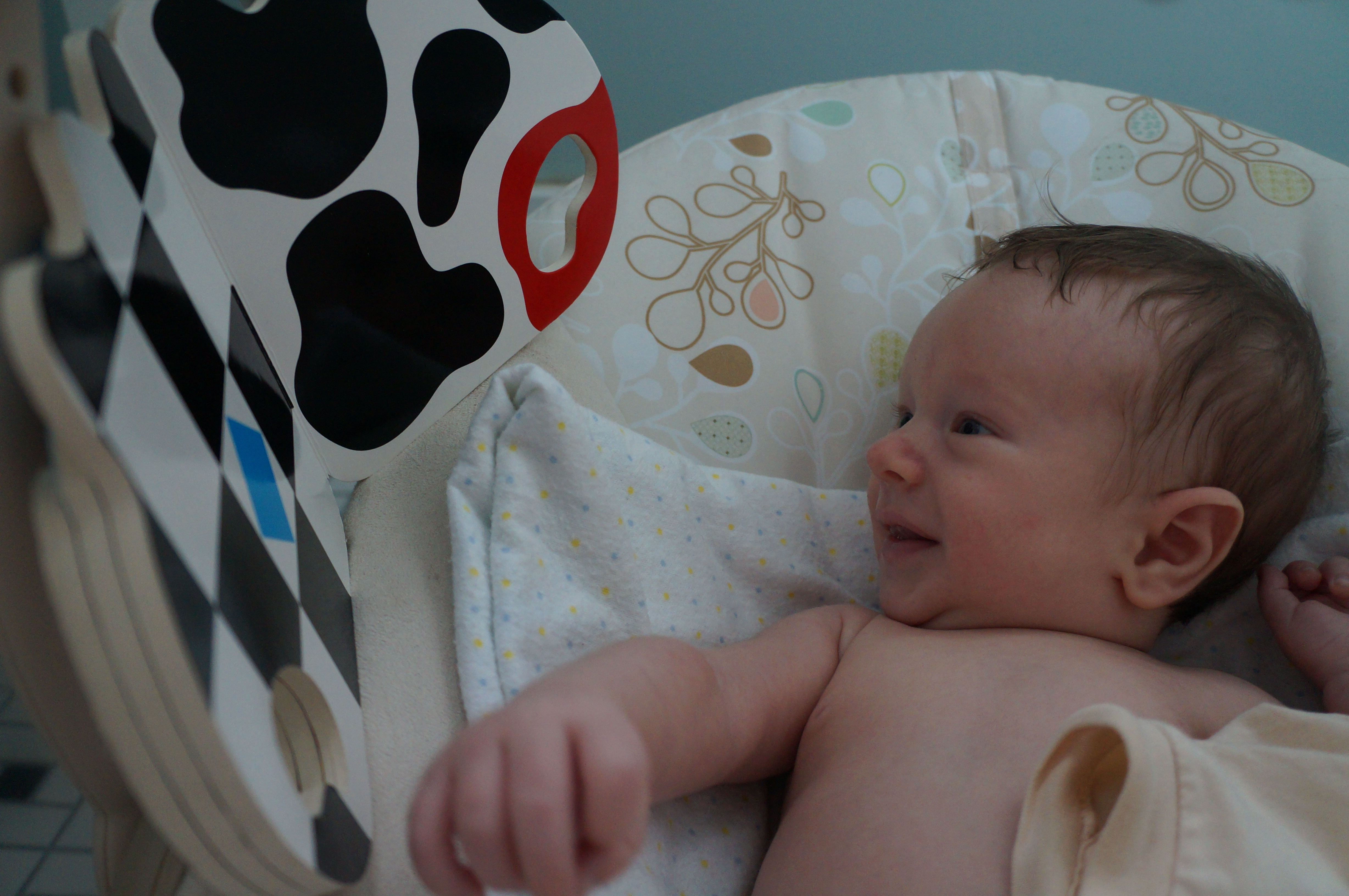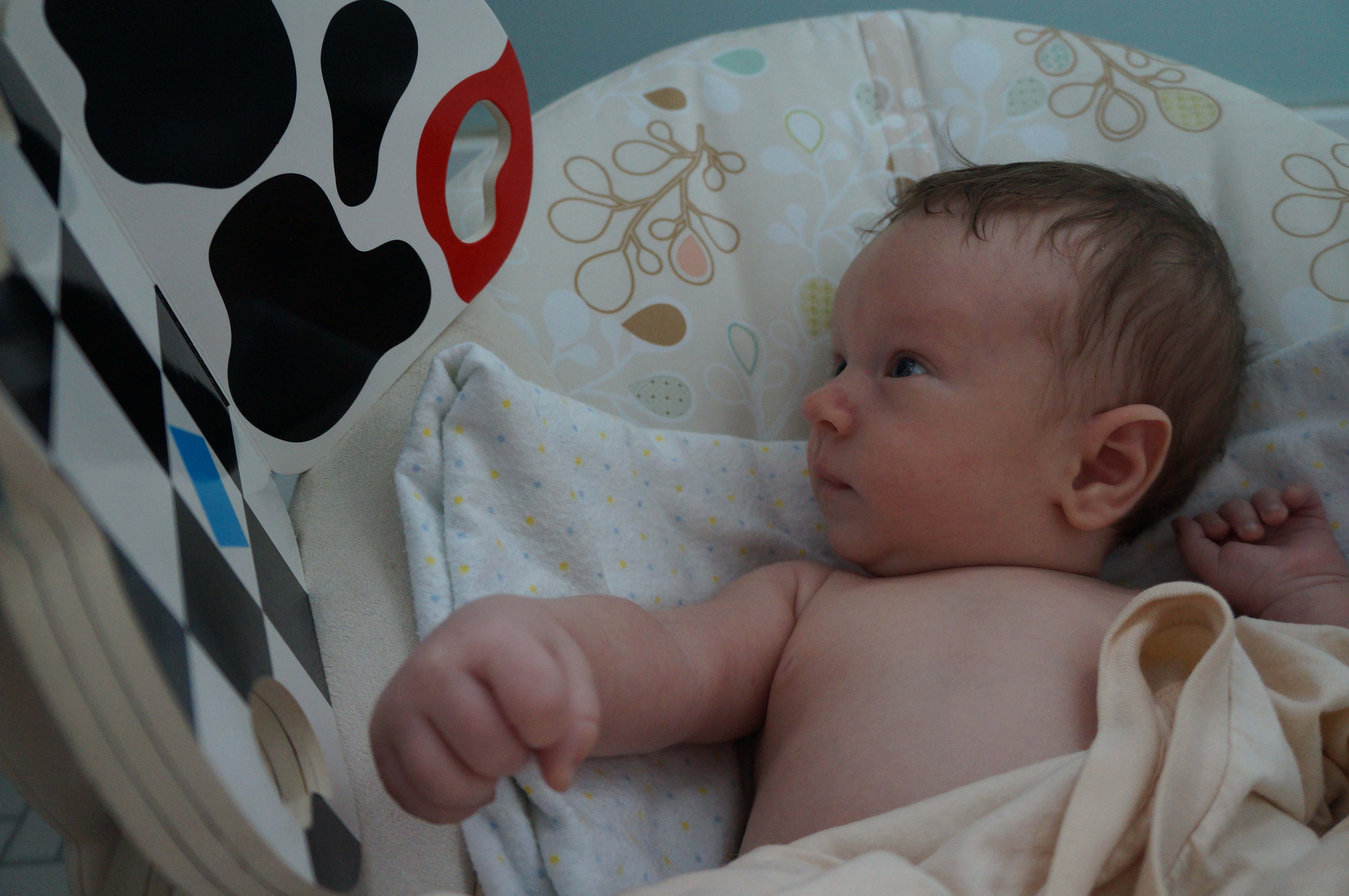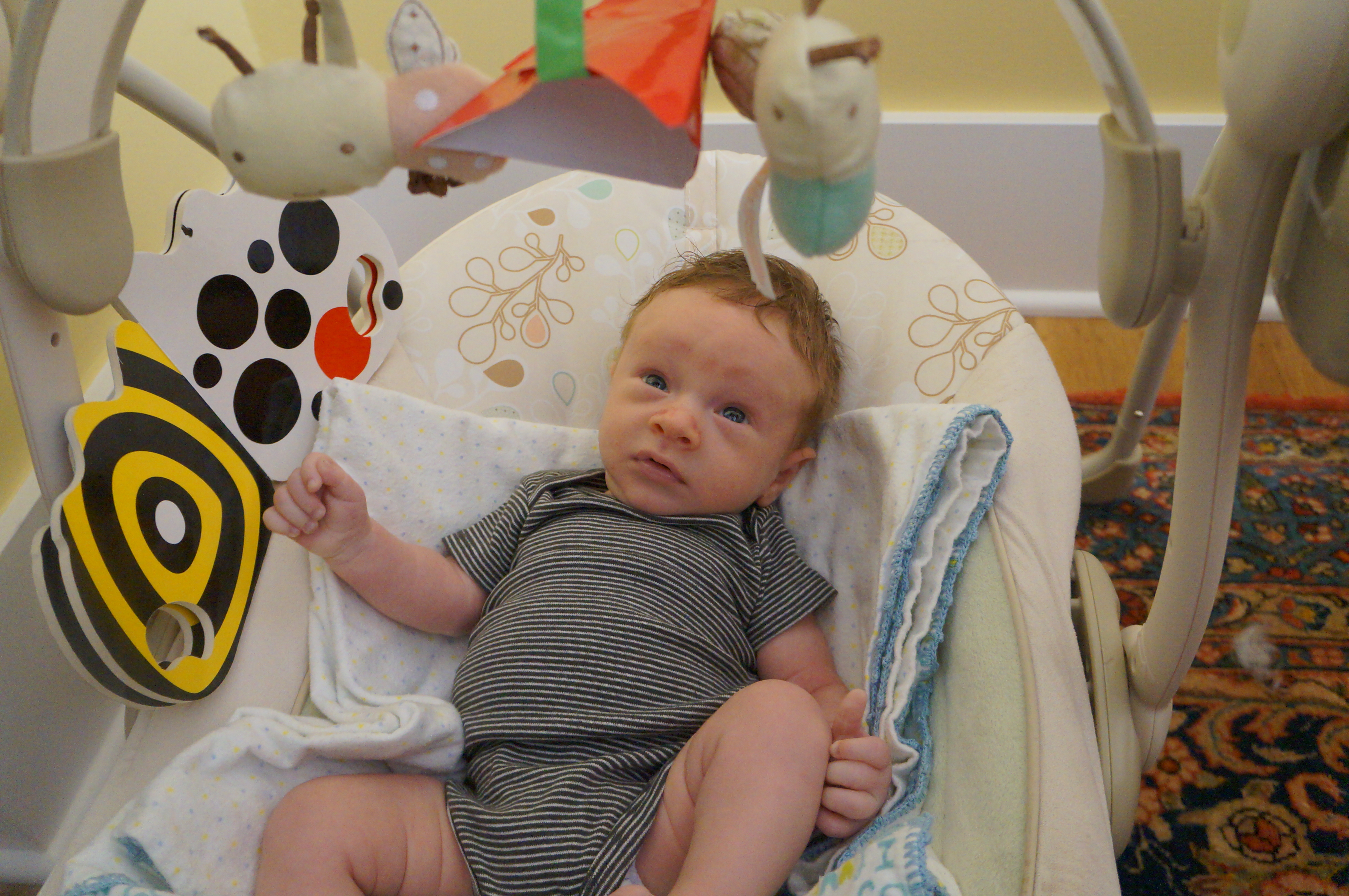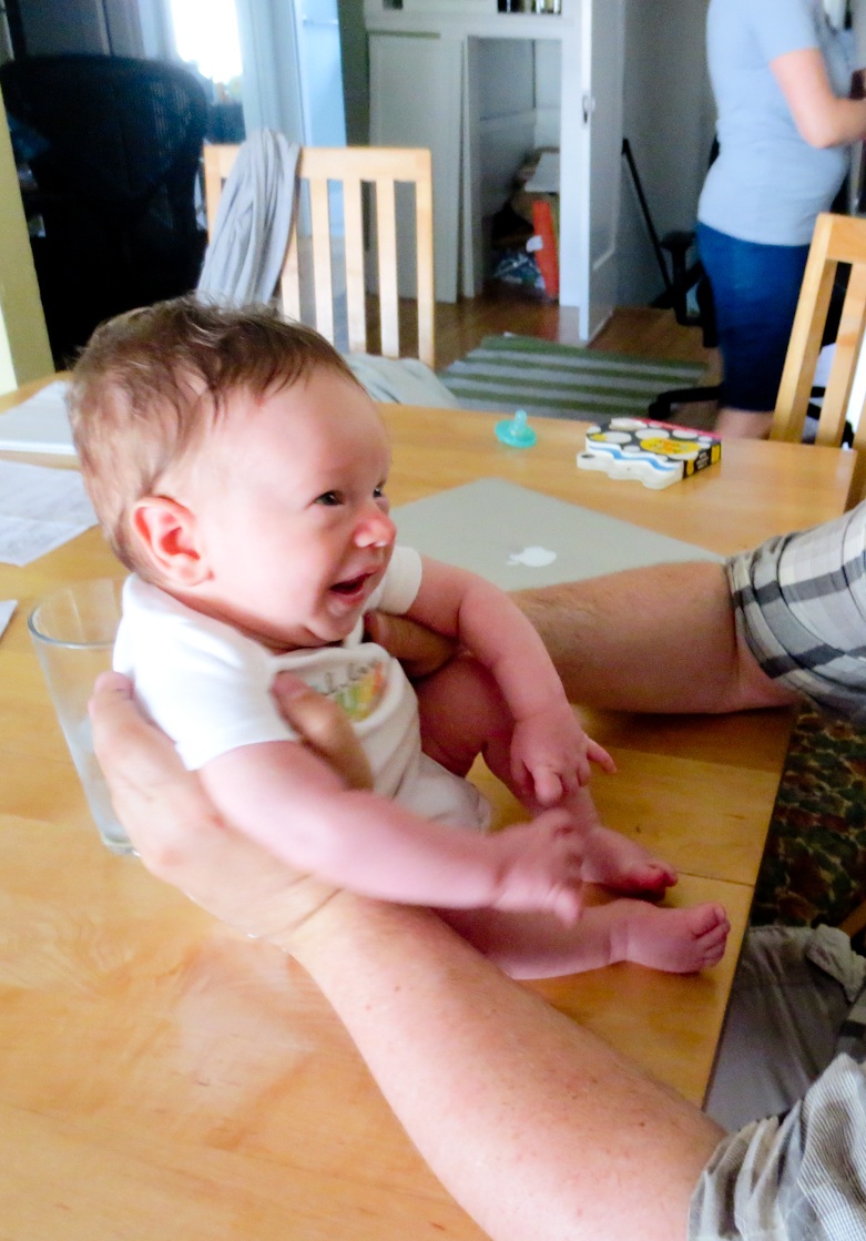The main developments in Ari’s life this week are more interest in looking at things and more smiling, although he’s been doing both those things for a couple of weeks. Now sometimes he can entertain himself for a half hour or so just looking at things. He also seems to be able to see me from farther away and he’s more interested in checking out the person holding him. Oh – and I set aside his newborn clothes; he’s outgrown them! Now he wears 0-3 months and even 3 months sizes. He weighed 10 pounds at the breastfeeding group meeting this week. He still wants to be held all the time – I’m typing this with one hand while I hold him, sleeping on my chest, with the other. I wake up now with cramping and stiffness in my hands and it’s hard to pick him up at first.