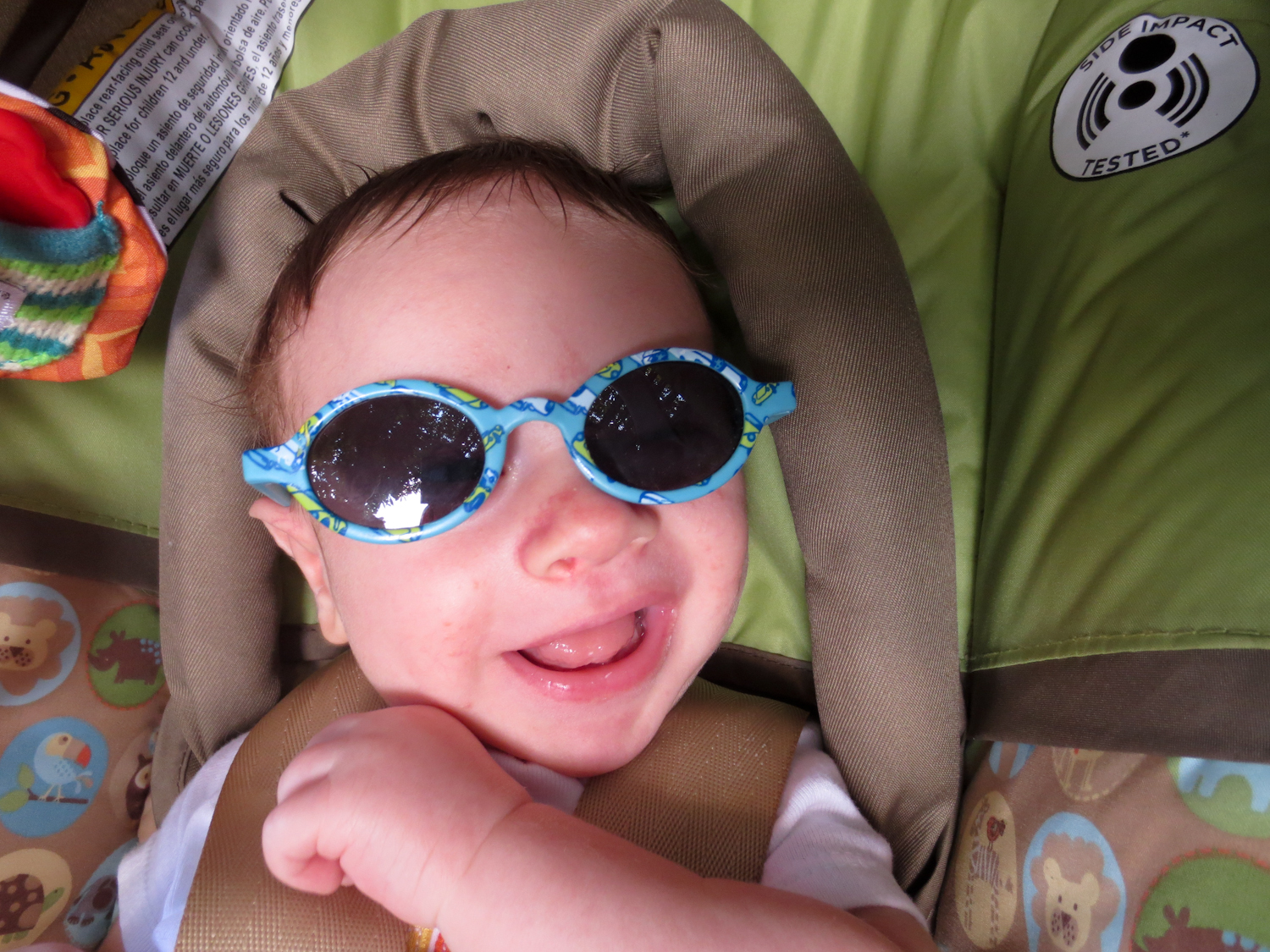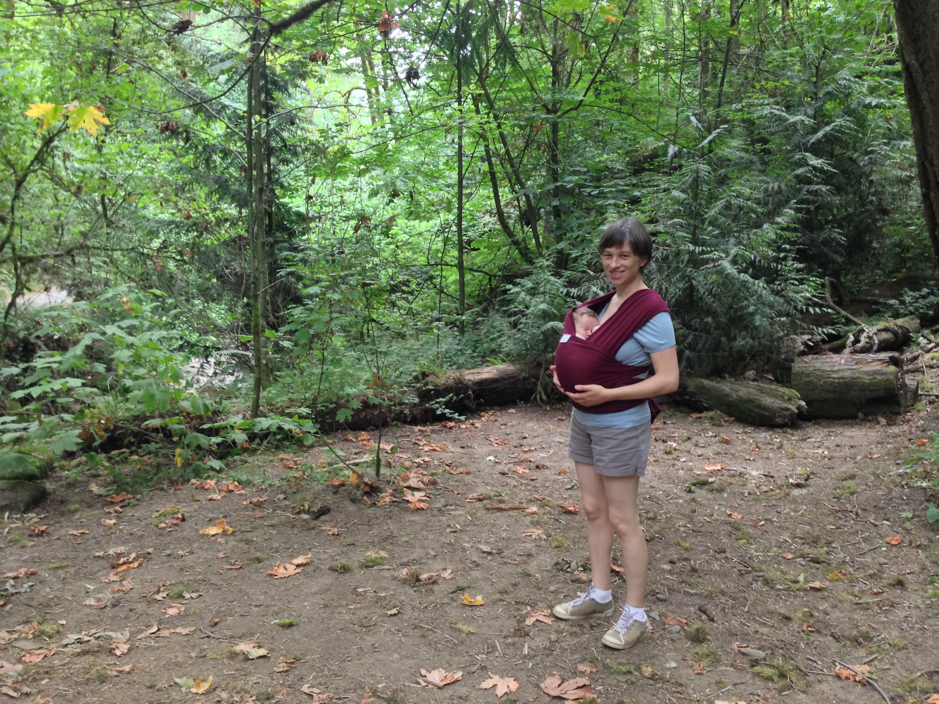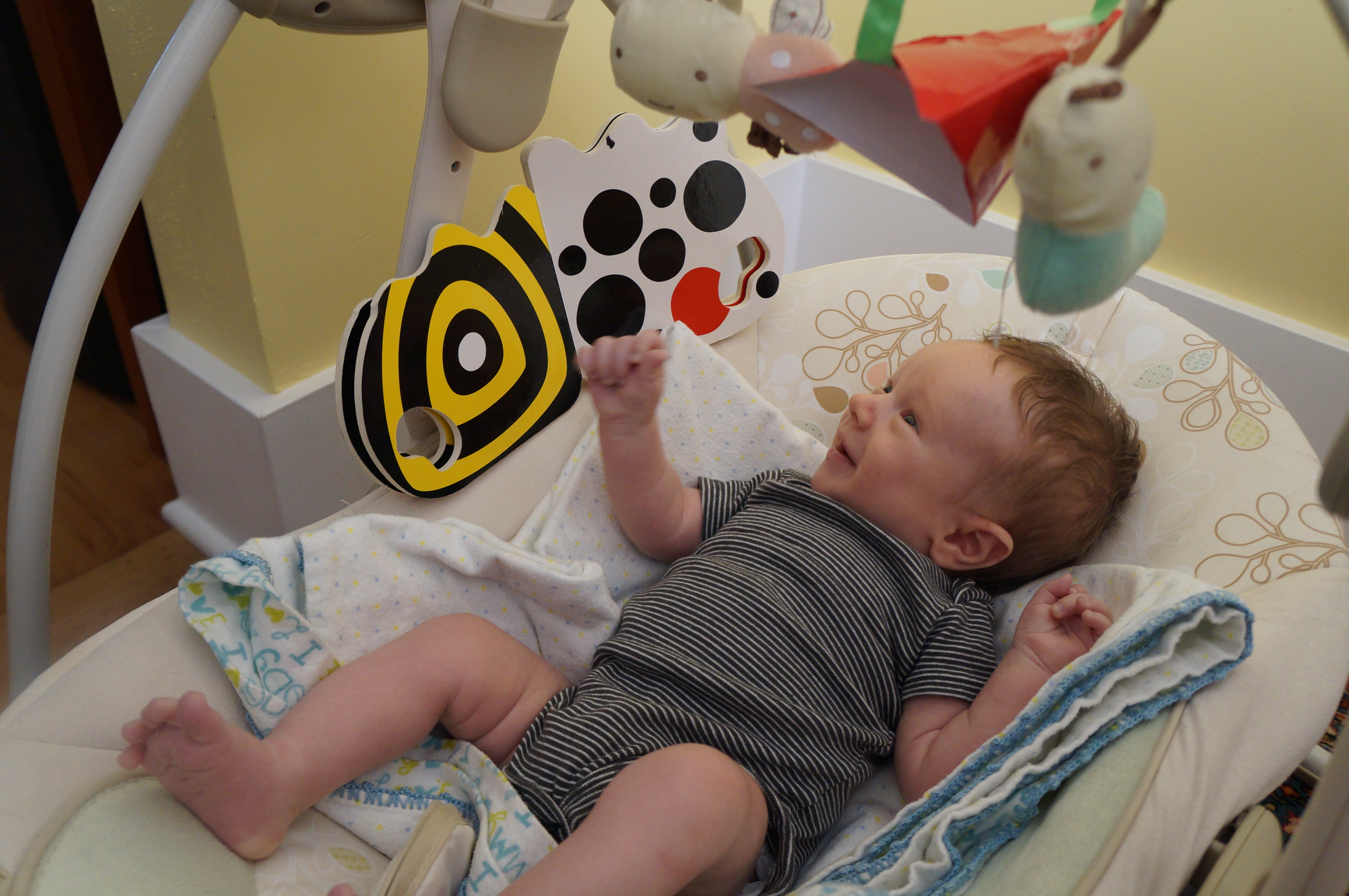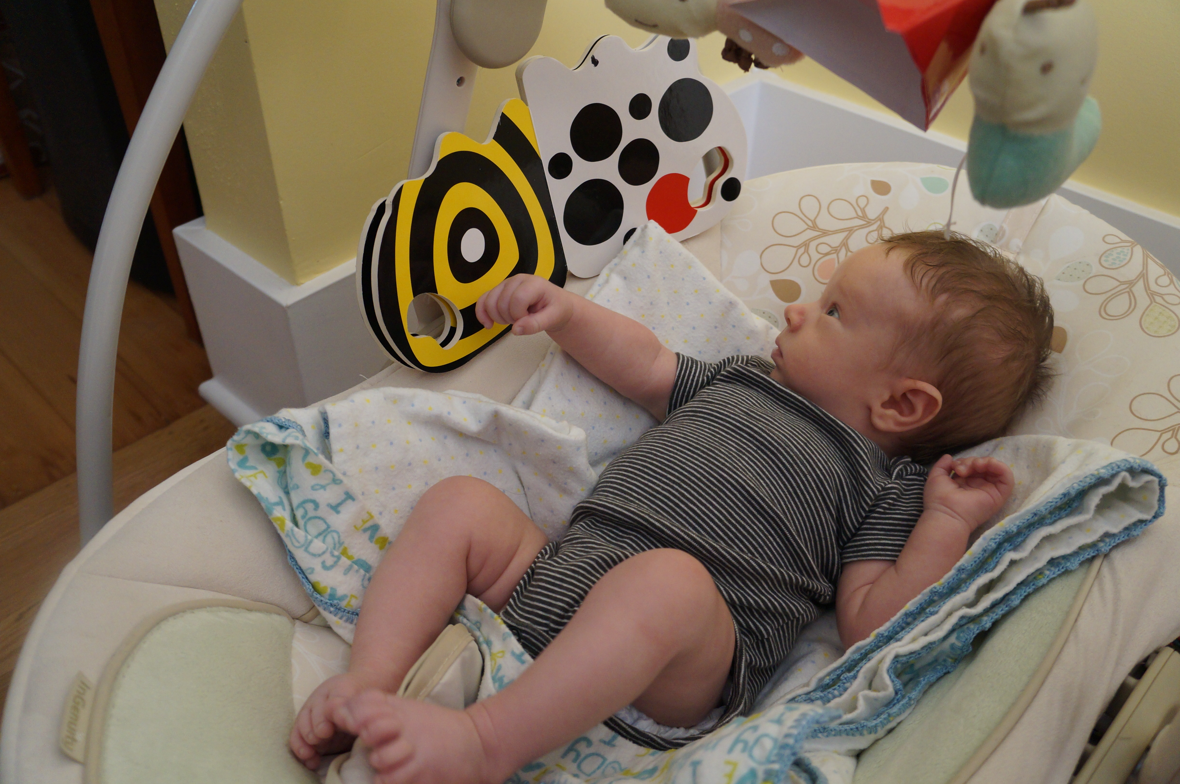 The main developments in Ari’s life this week are more interest in looking at things and more smiling, although he’s been doing both those things for a couple of weeks. Now sometimes he can entertain himself for a half hour or so just looking at things. He also seems to be able to see me from farther away and he’s more interested in checking out the person holding him. Oh – and I set aside his newborn clothes; he’s outgrown them! Now he wears 0-3 months and even 3 months sizes. He weighed 10 pounds at the breastfeeding group meeting this week. He still wants to be held all the time – I’m typing this with one hand while I hold him, sleeping on my chest, with the other. I wake up now with cramping and stiffness in my hands and it’s hard to pick him up at first.