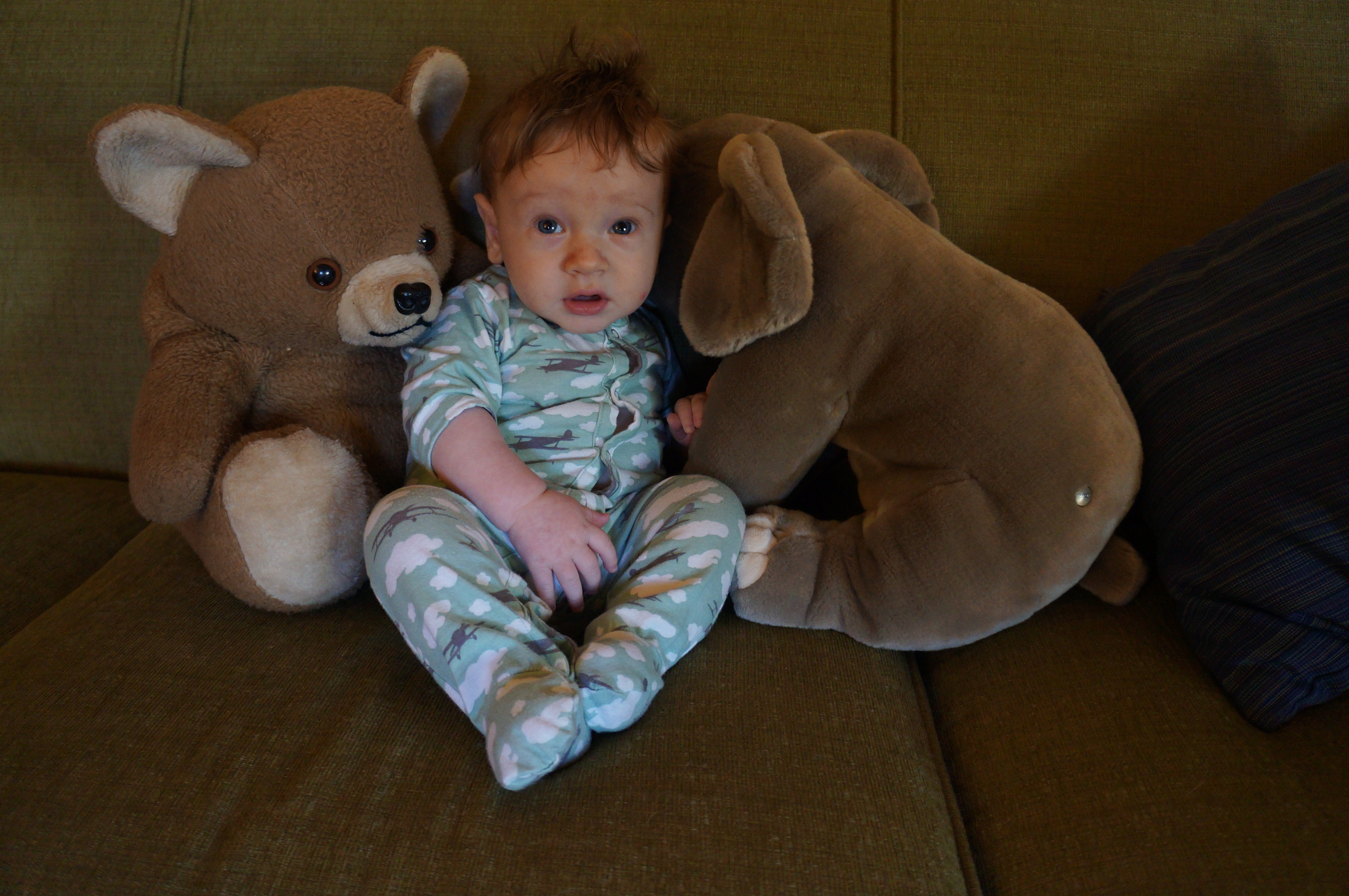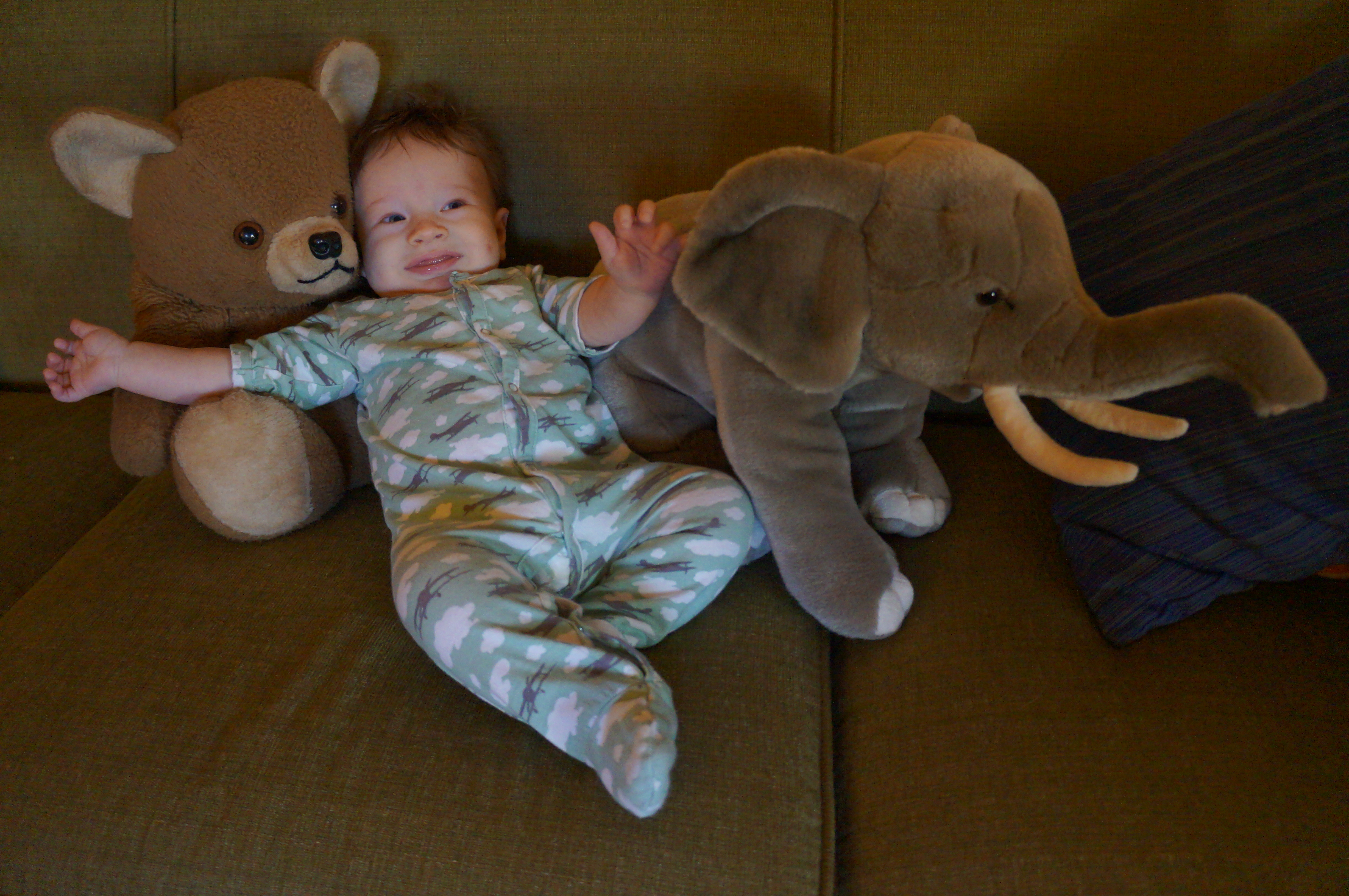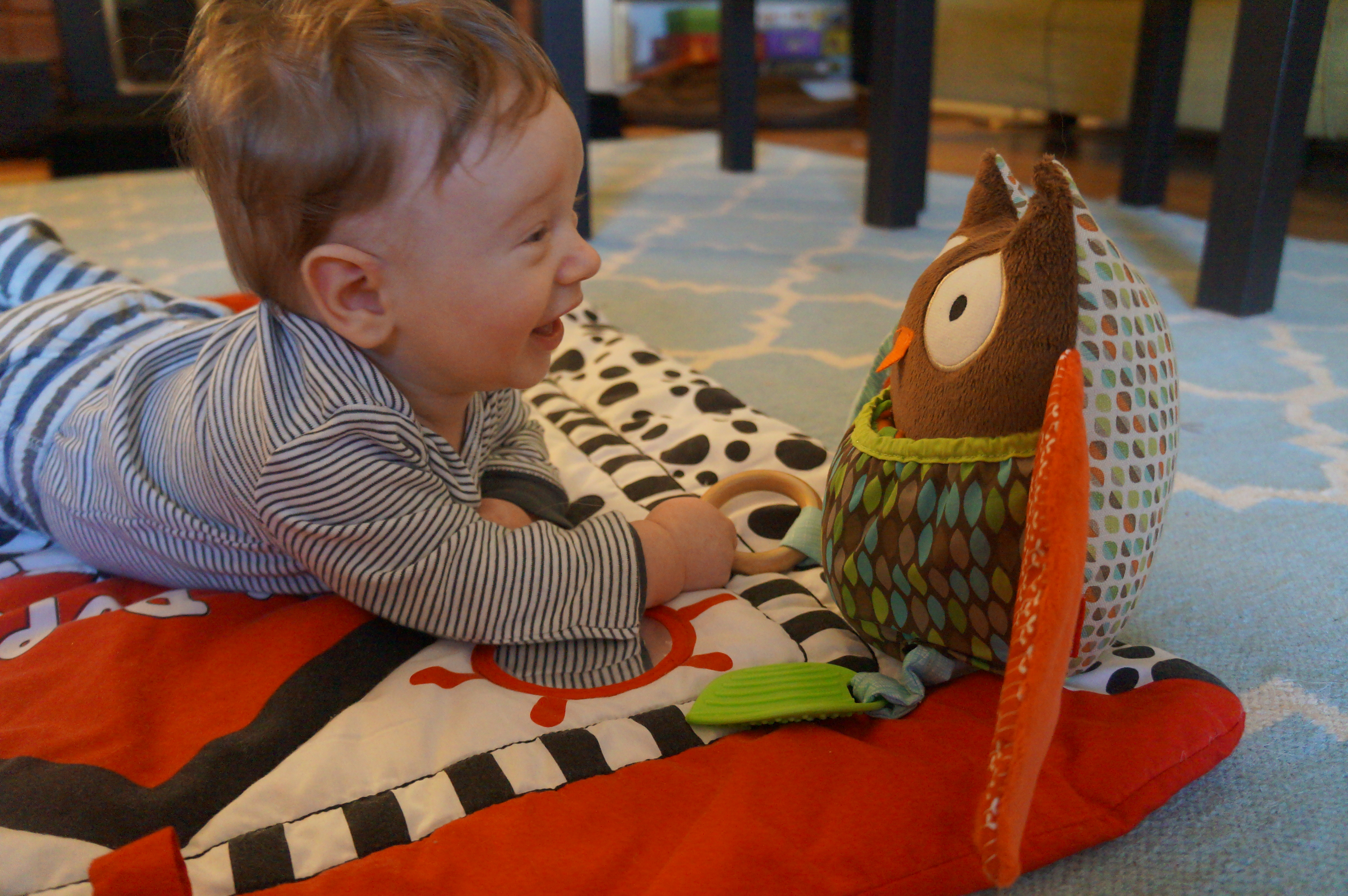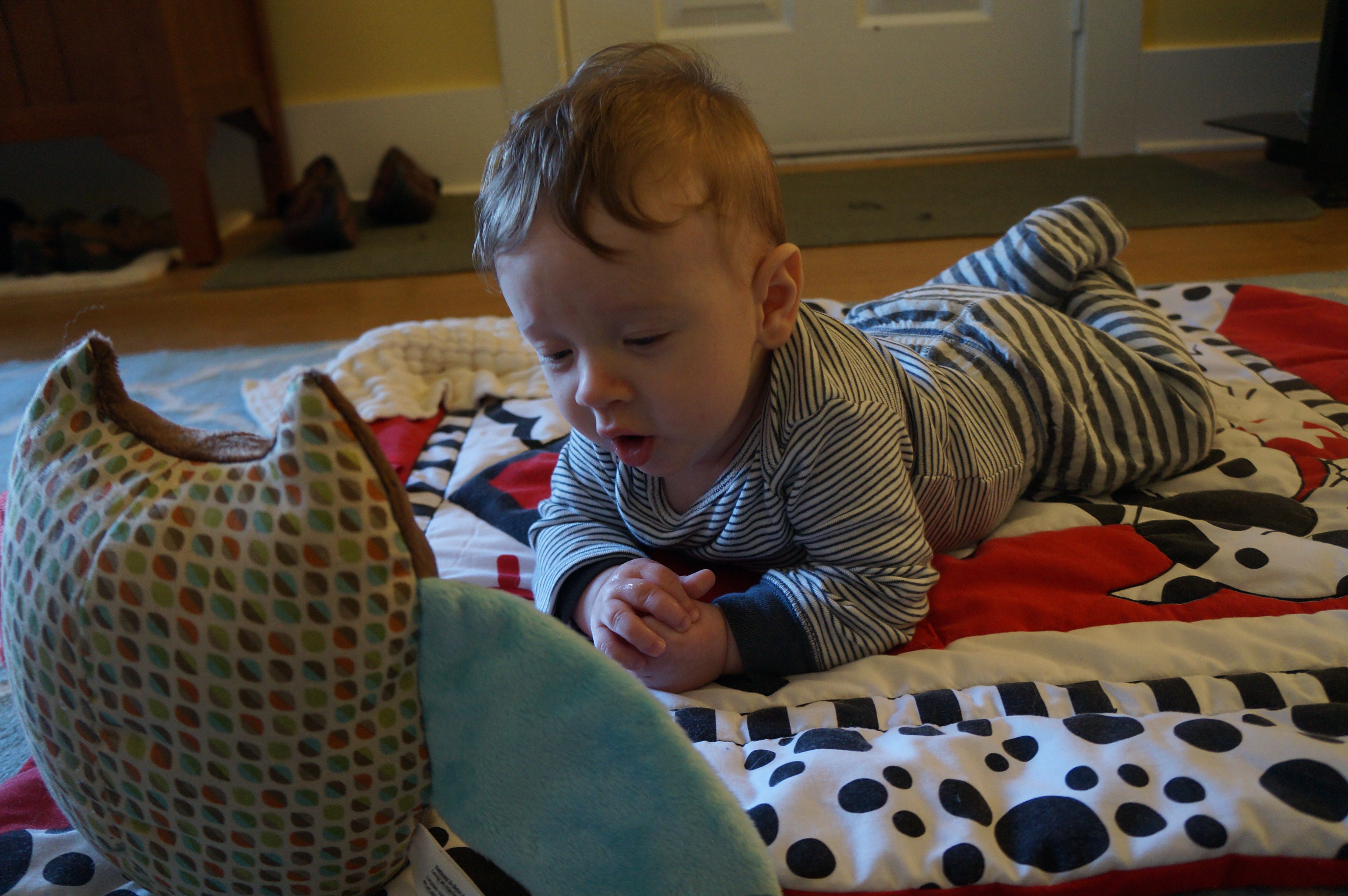 Here are some pictures of Ari getting his exercise/play time. Lately he is happy on his tummy for probably 10 minutes or so at a time; much longer than he used to be. He’s also more interested in looking at things, reaching and grabbing, and bringing things to his mouth. He makes scooting motions and can move an inch or two forward or back. Also, he’s been rolling from his front to his back since he was 10 weeks old (but he doesn’t do it as reliably now that he’s happier on his tummy!), and now he will roll from his back to his side if he’s reaching for something. He weighs about 14 pounds now, so he’s basically doubled his birth weight, and he fits 3-6–month size clothing. He’s almost four months old! I love him so much!