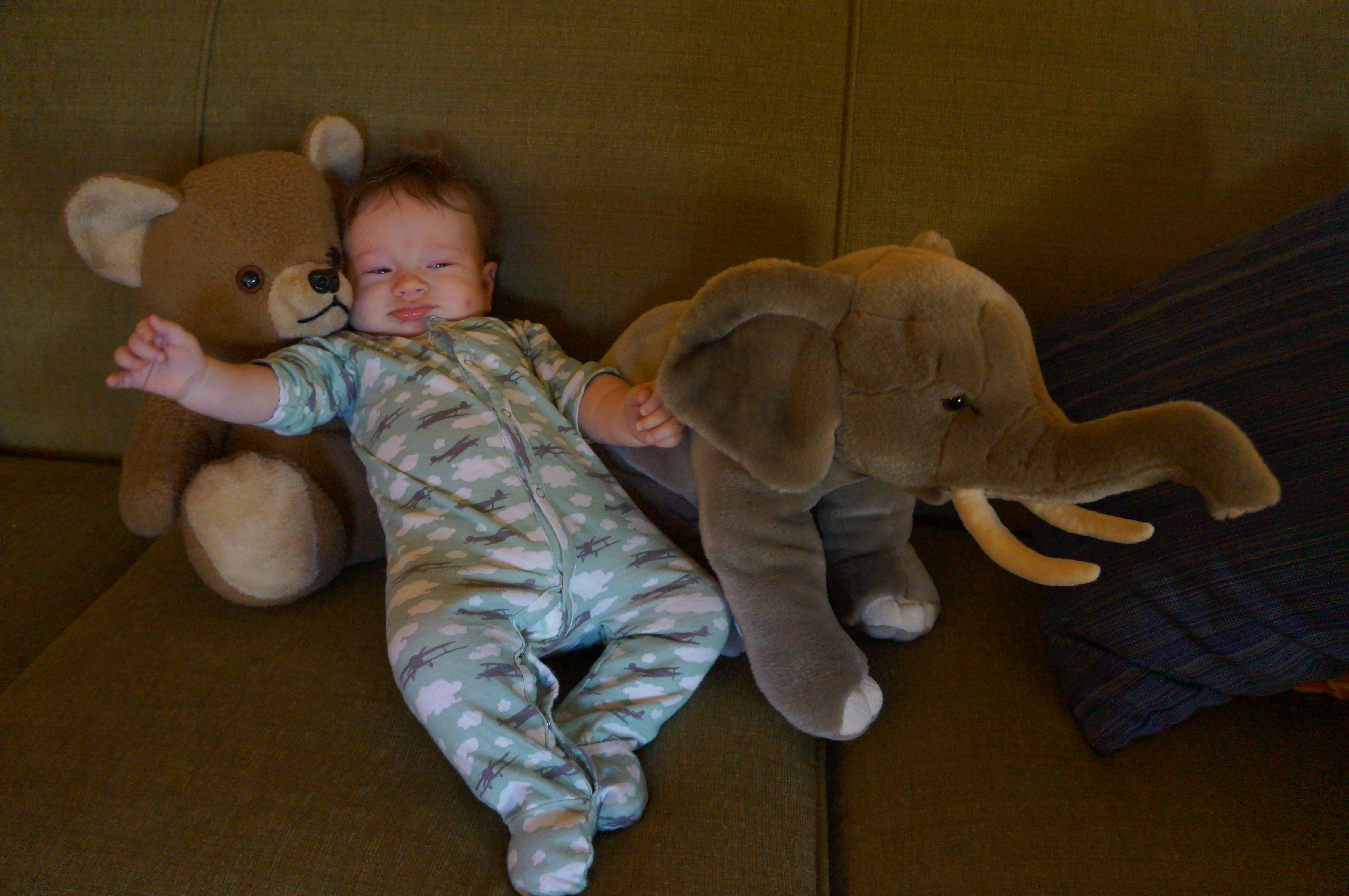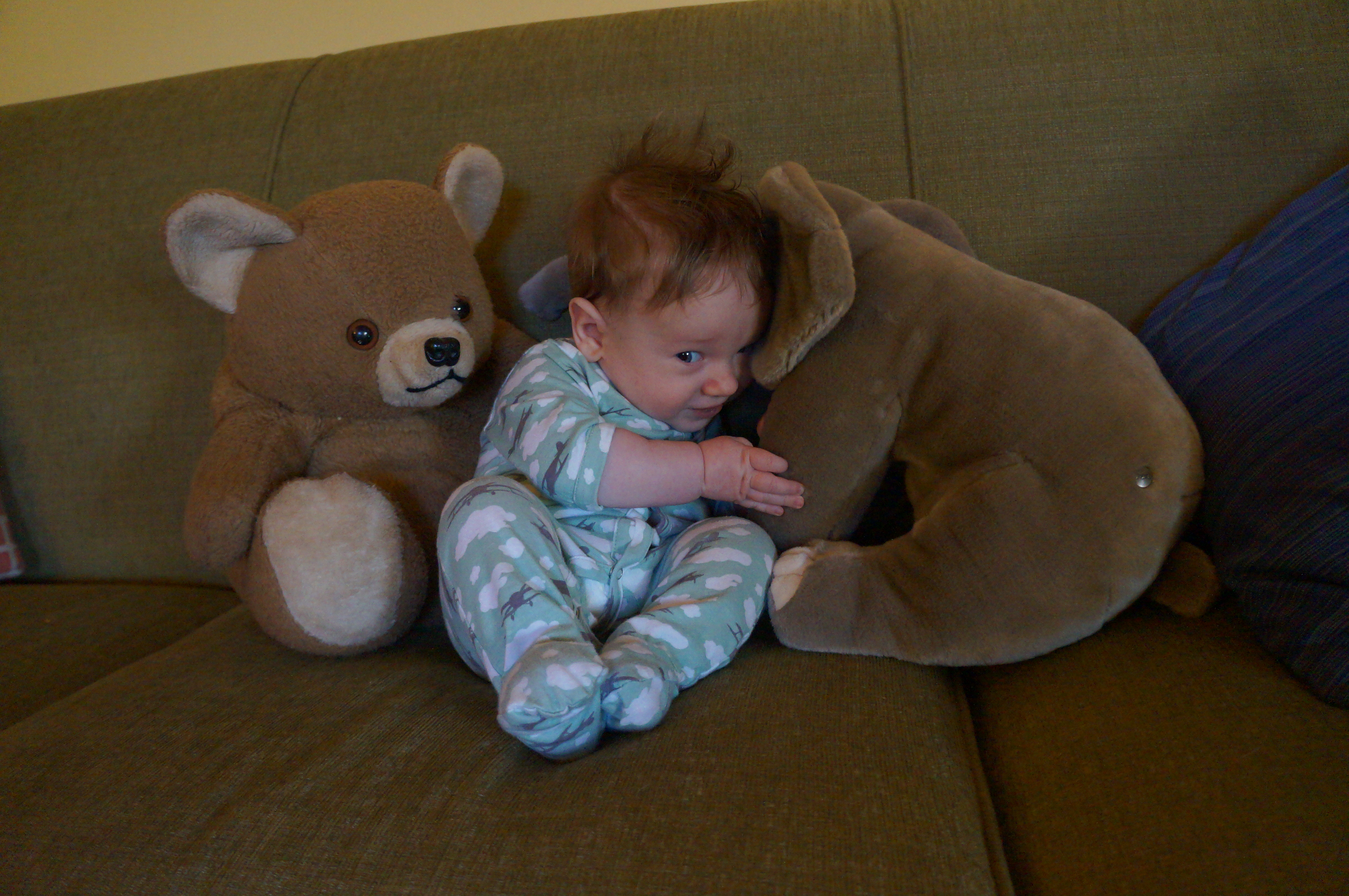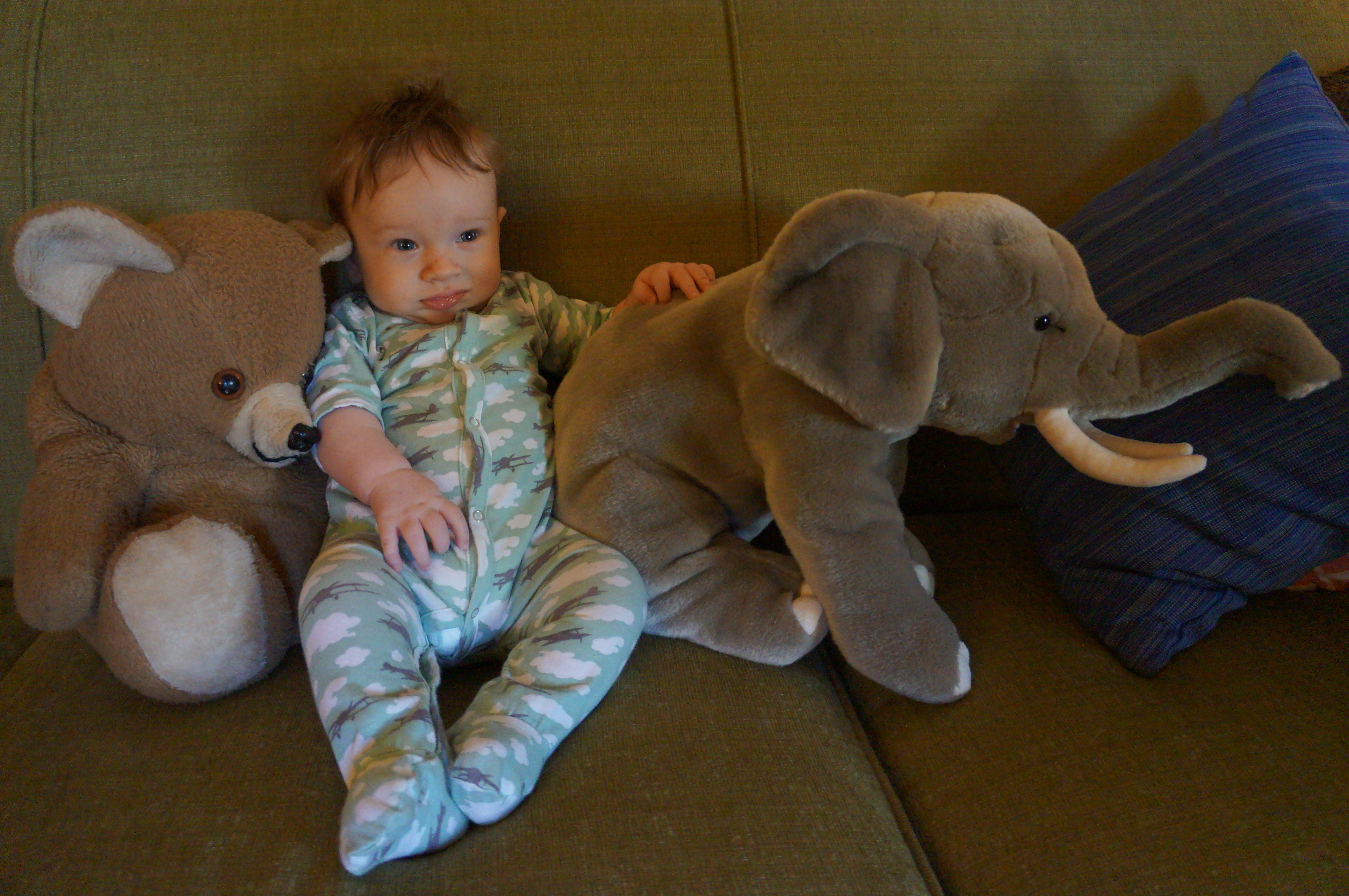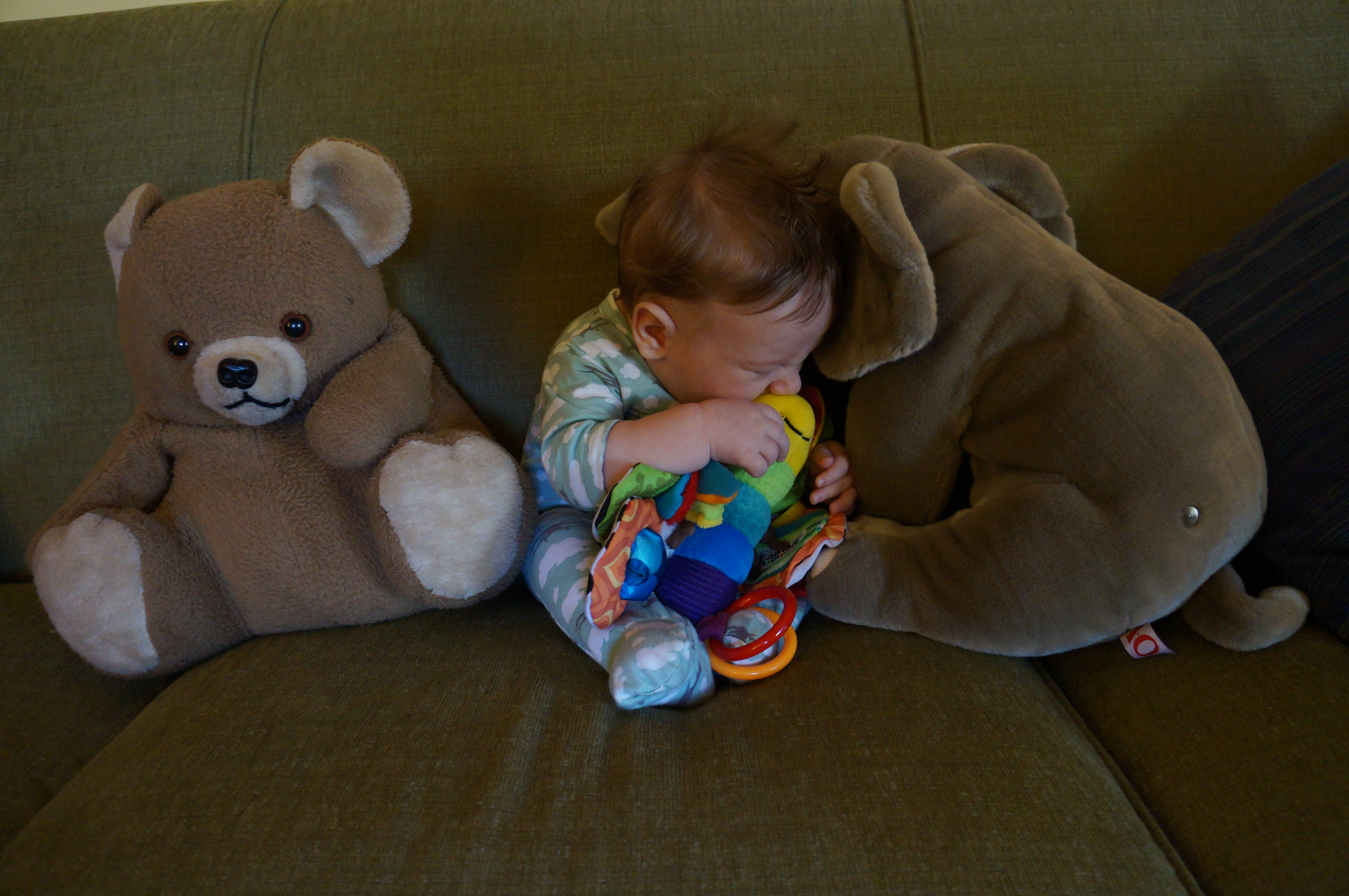 Here are some pictures of Ari getting his exercise/play time. Lately he is happy on his tummy for probably 10 minutes or so at a time; much longer than he used to be. He’s also more interested in looking at things, reaching and grabbing, and bringing things to his mouth. He makes scooting motions and can move an inch or two forward or back. Also, he’s been rolling from his front to his back since he was 10 weeks old (but he doesn’t do it as reliably now that he’s happier on his tummy!), and now he will roll from his back to his side if he’s reaching for something. He weighs about 14 pounds now, so he’s basically doubled his birth weight, and he fits 3-6–month size clothing. He’s almost four months old! I love him so much!