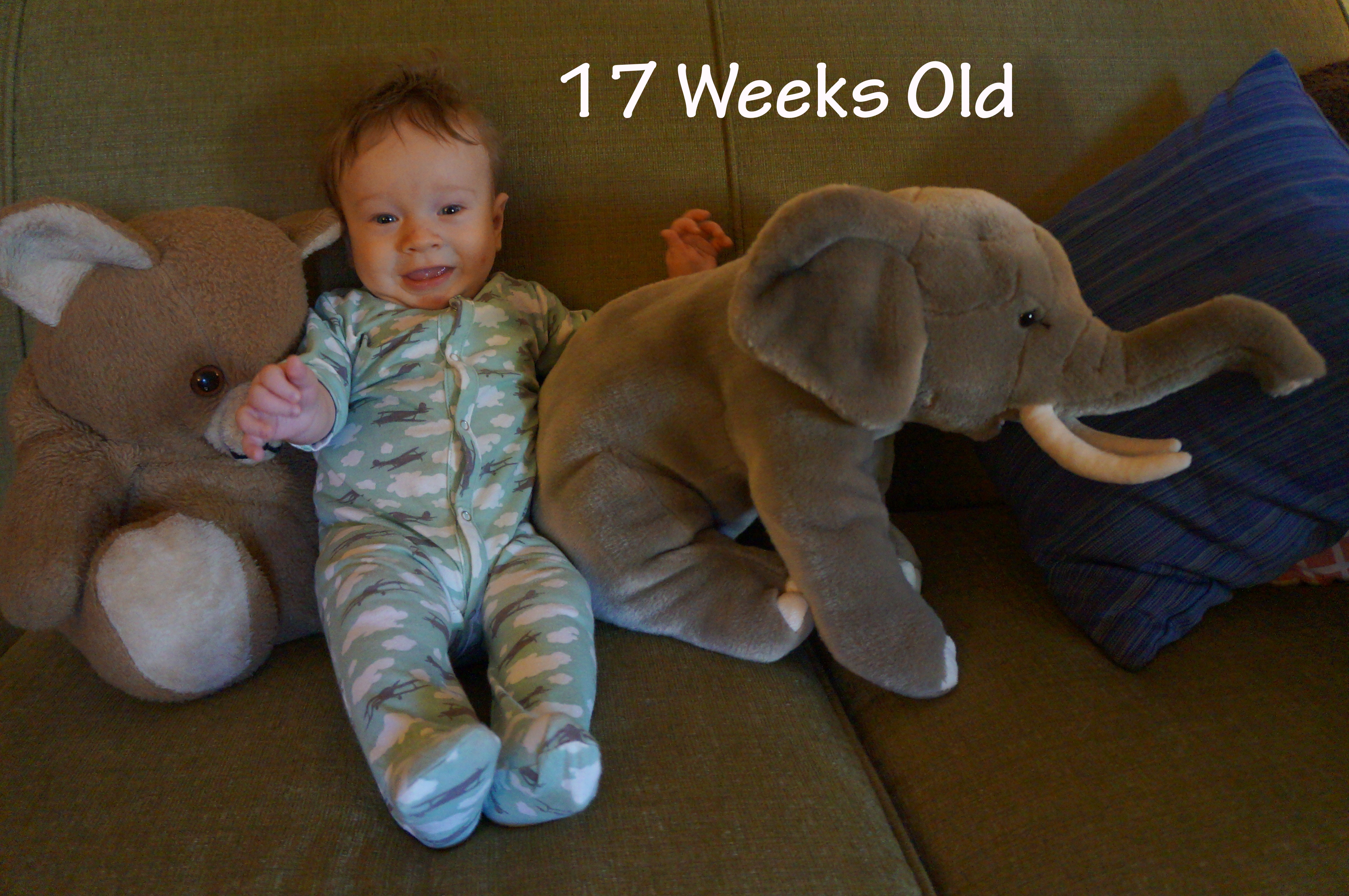 Here are pictures from my 17-week photo session. Ari kept scooting down. Also he just wanted to chew on something. I finally gave him a toy and it went right in his mouth!