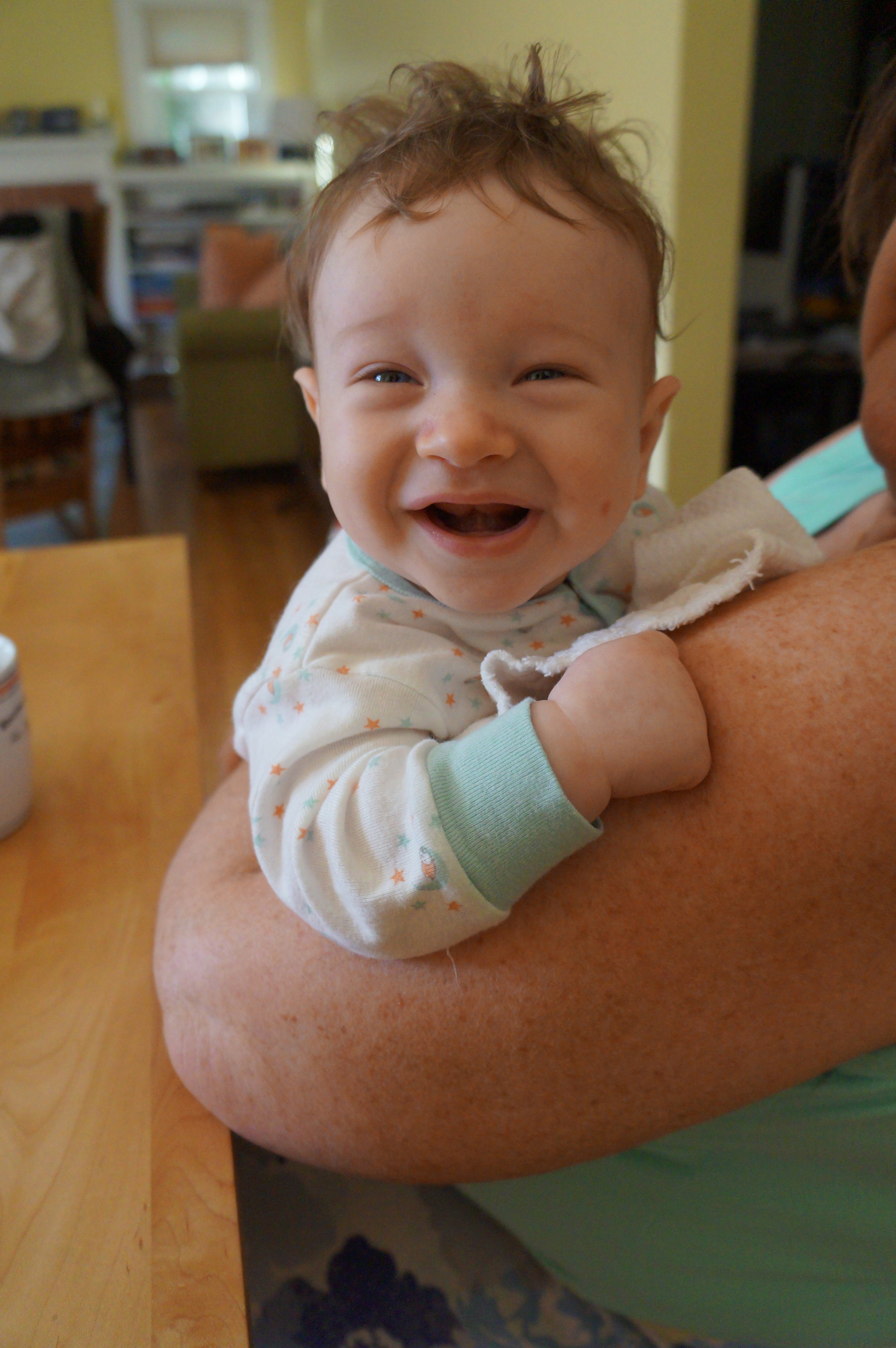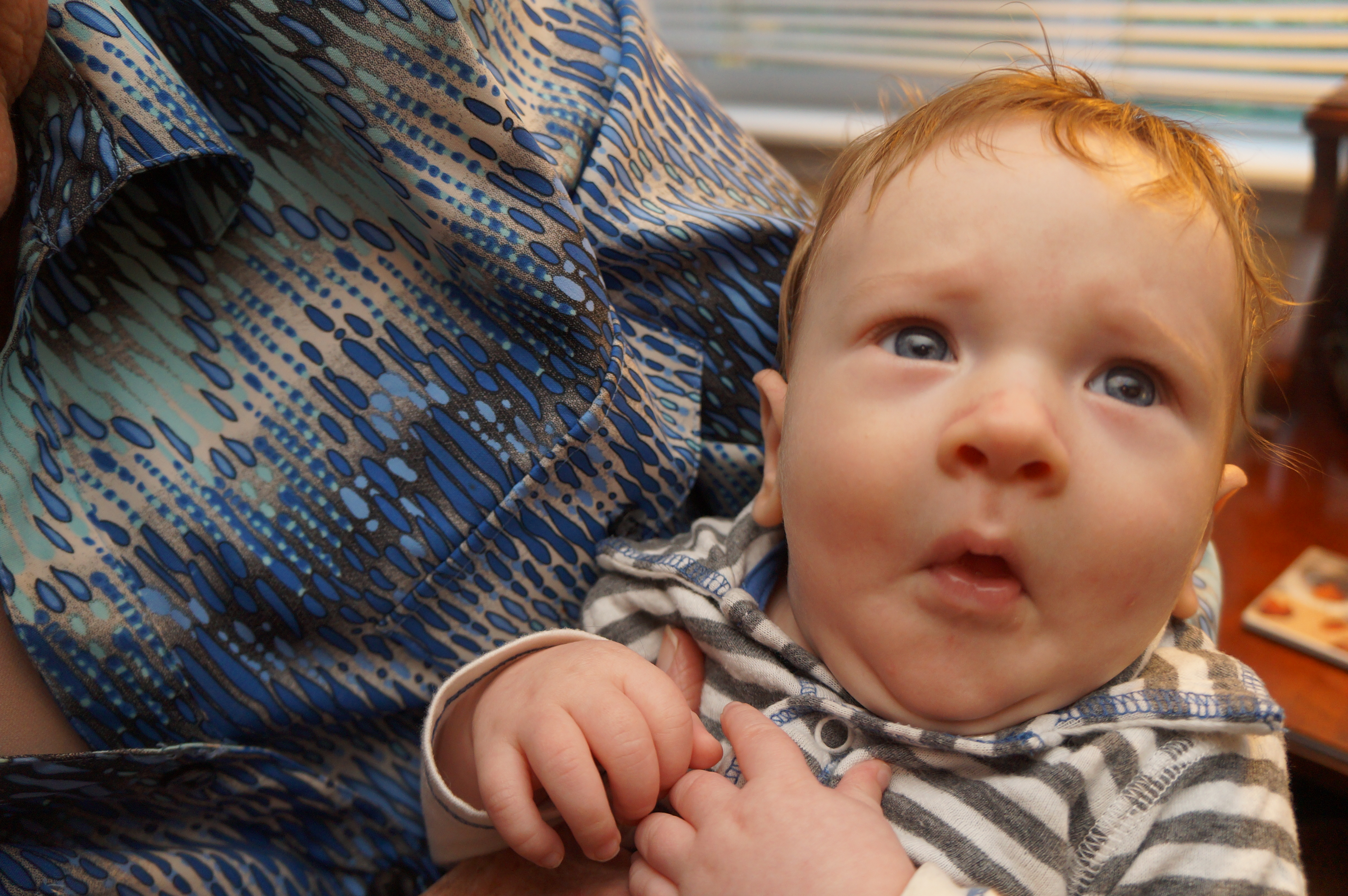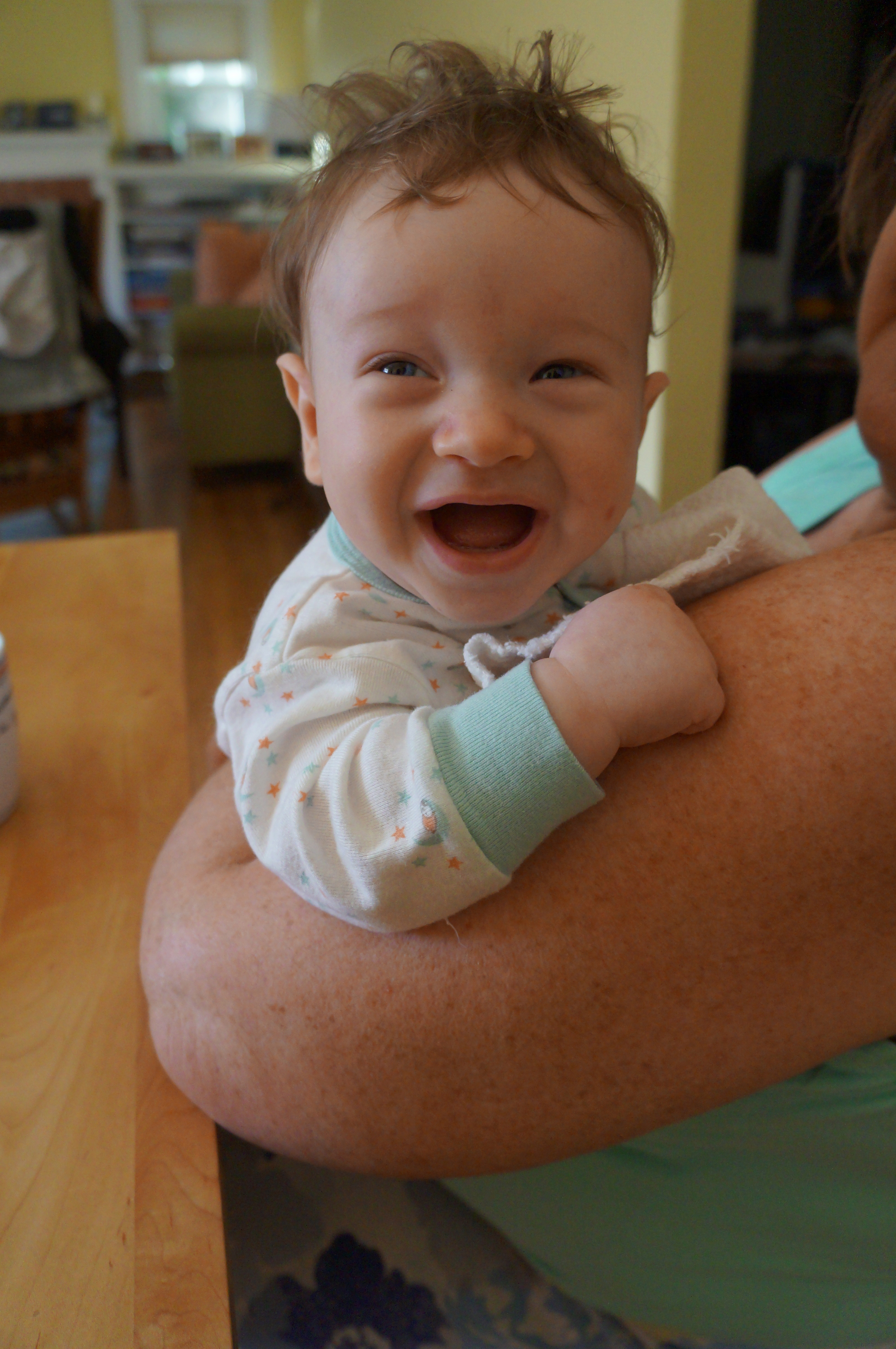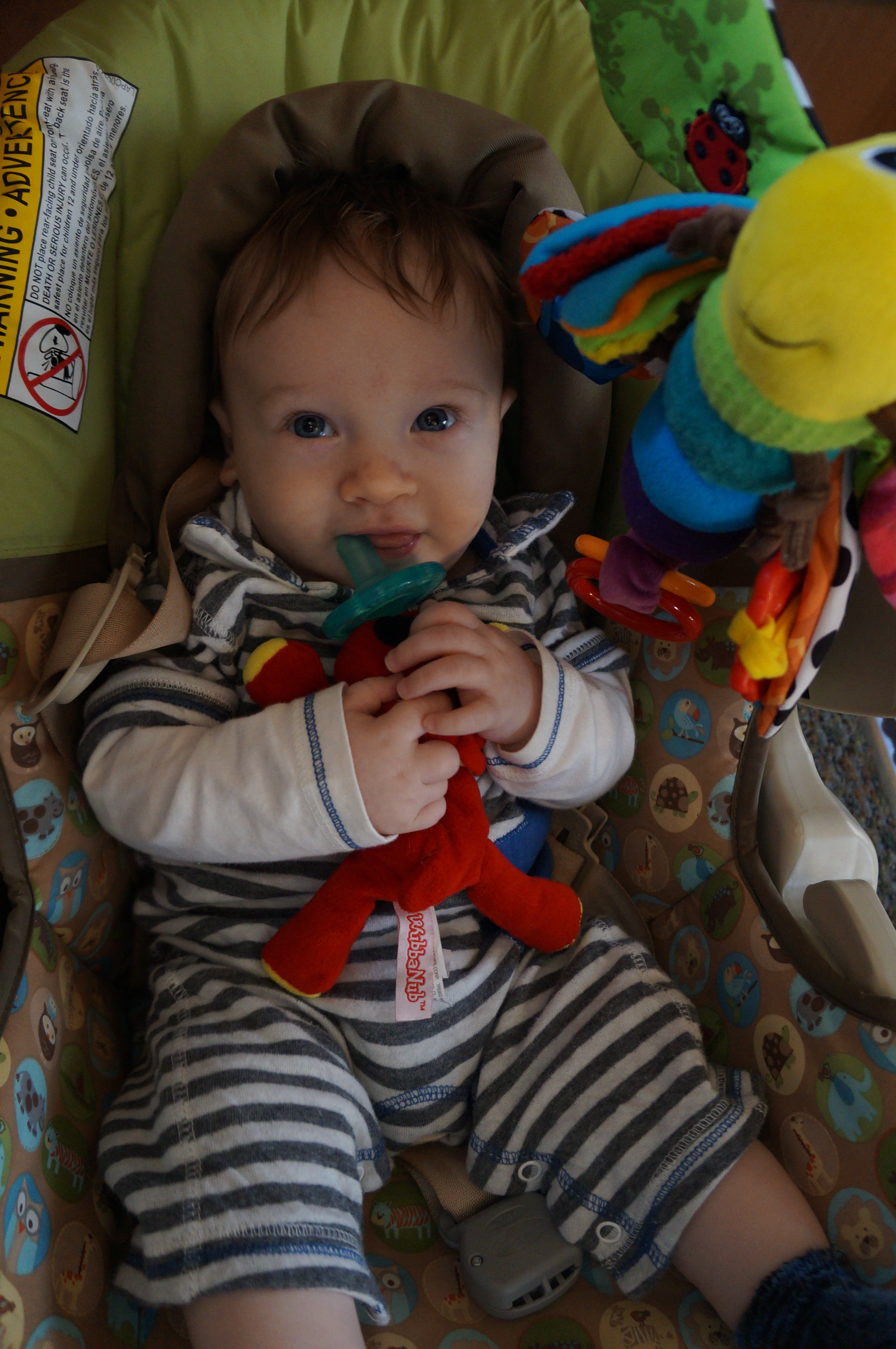 Ari was fun this week. He’s been more smiley and giggly and interactive. He entertained my family for quite a while when we went to Olympia. He loves blowing raspberries and having raspberries blown at him. He’s figured out how to suck his thumb and often prefers that to the pacifiers now. It’s usually his left thumb; maybe he’ll be left-handed? He’s also gotten more interested in his Sophie the Giraffe and better at holding onto it/her. Andrew’s interested in Sophie too, but he doesn’t try to take her!
