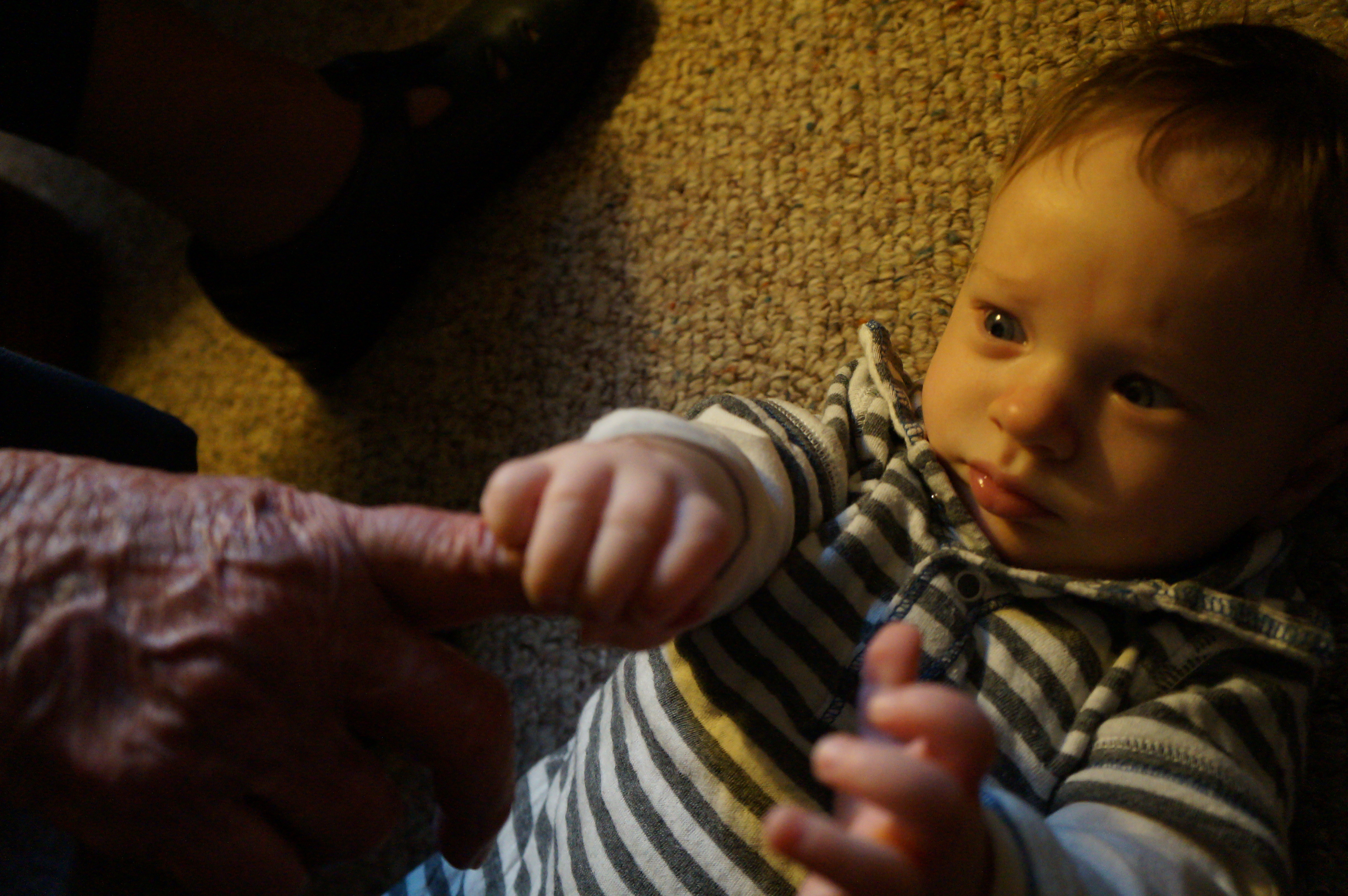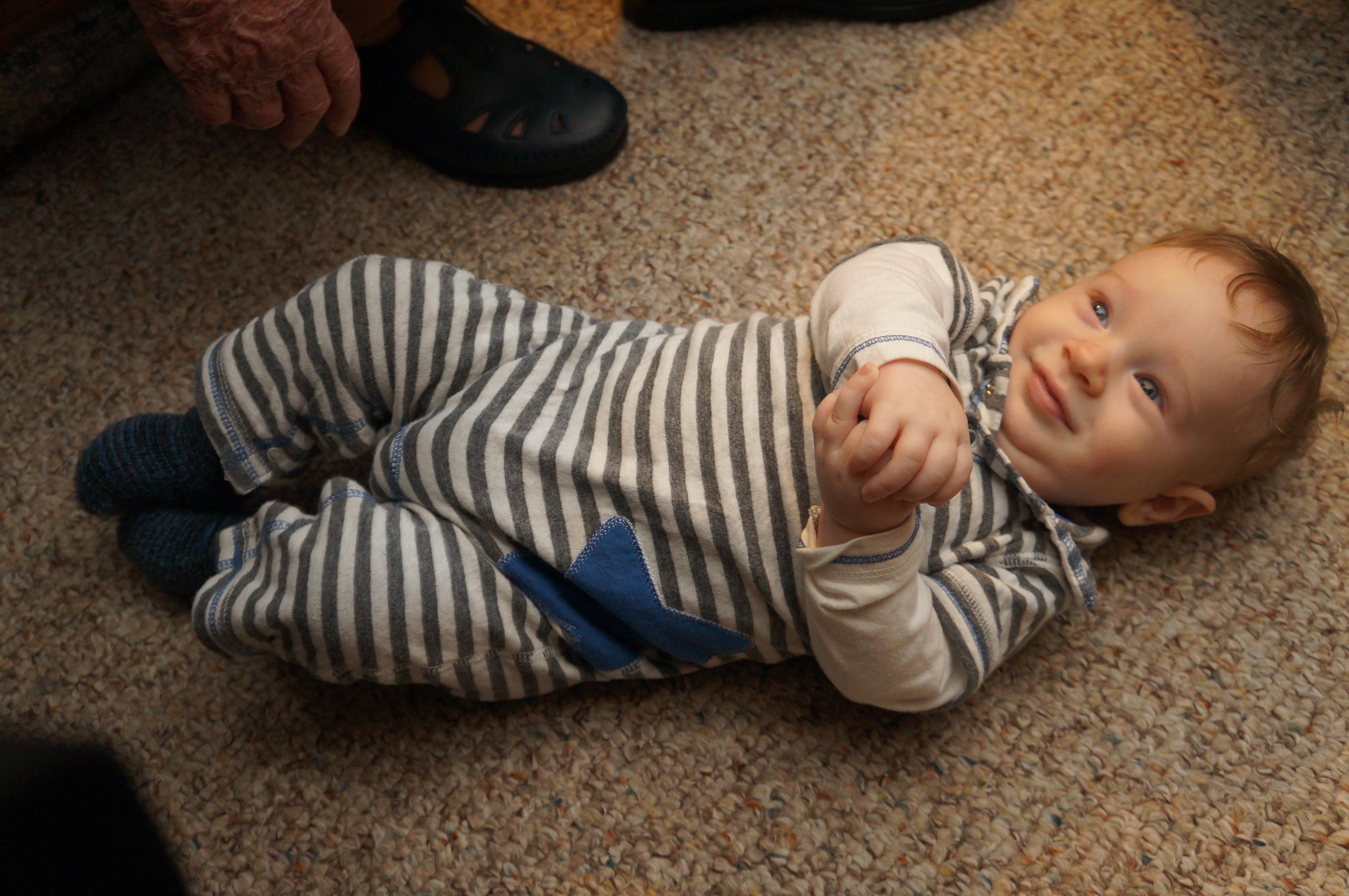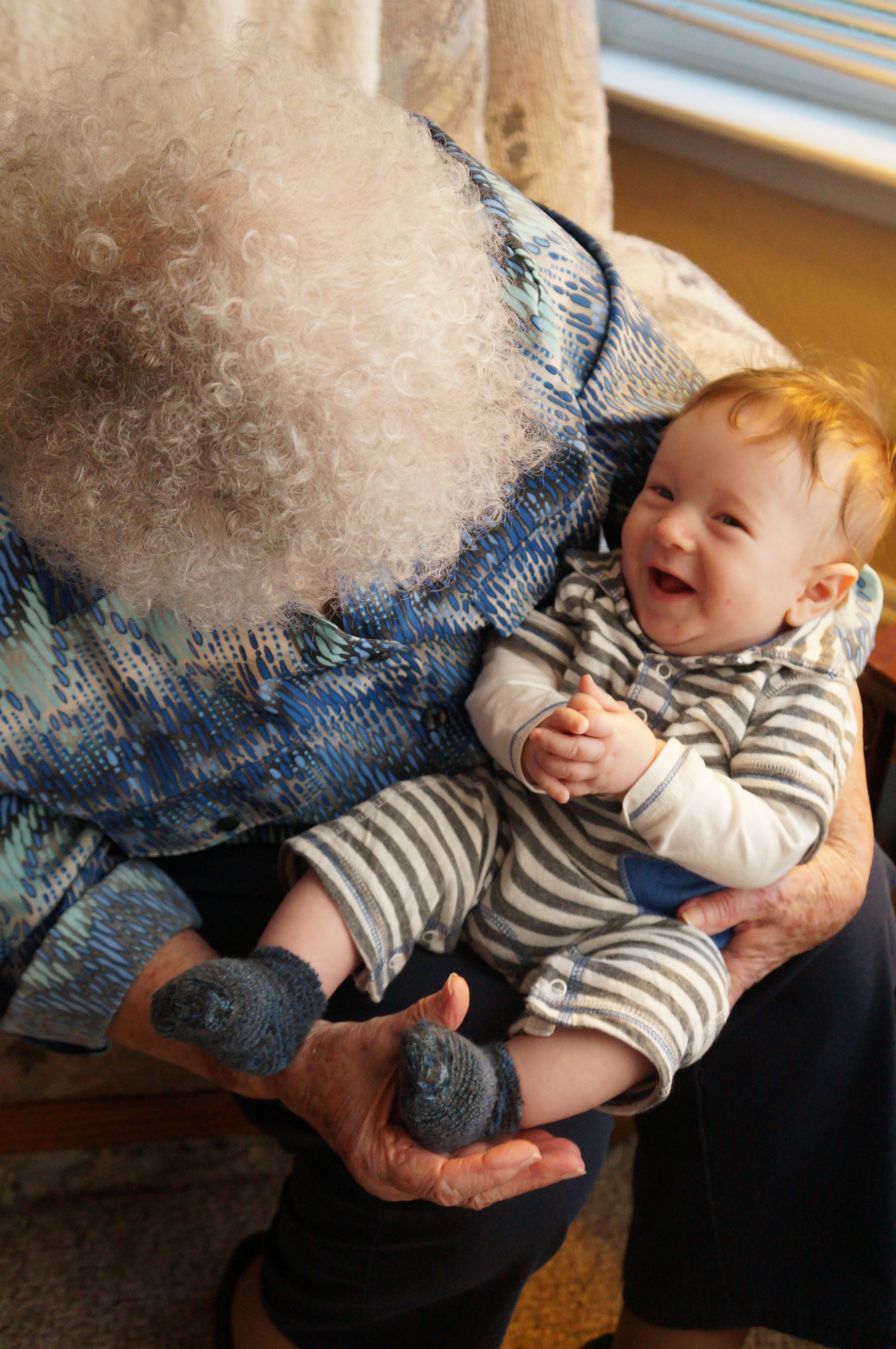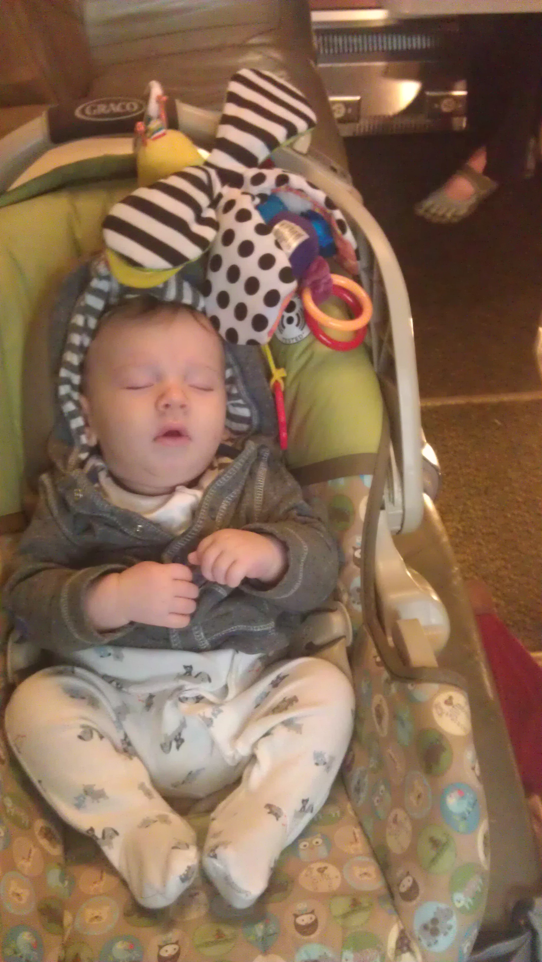 Ari was fun this week. He’s been more smiley and giggly and interactive. He entertained my family for quite a while when we went to Olympia. He loves blowing raspberries and having raspberries blown at him. He’s figured out how to suck his thumb and often prefers that to the pacifiers now. It’s usually his left thumb; maybe he’ll be left-handed? He’s also gotten more interested in his Sophie the Giraffe and better at holding onto it/her. Andrew’s interested in Sophie too, but he doesn’t try to take her!
