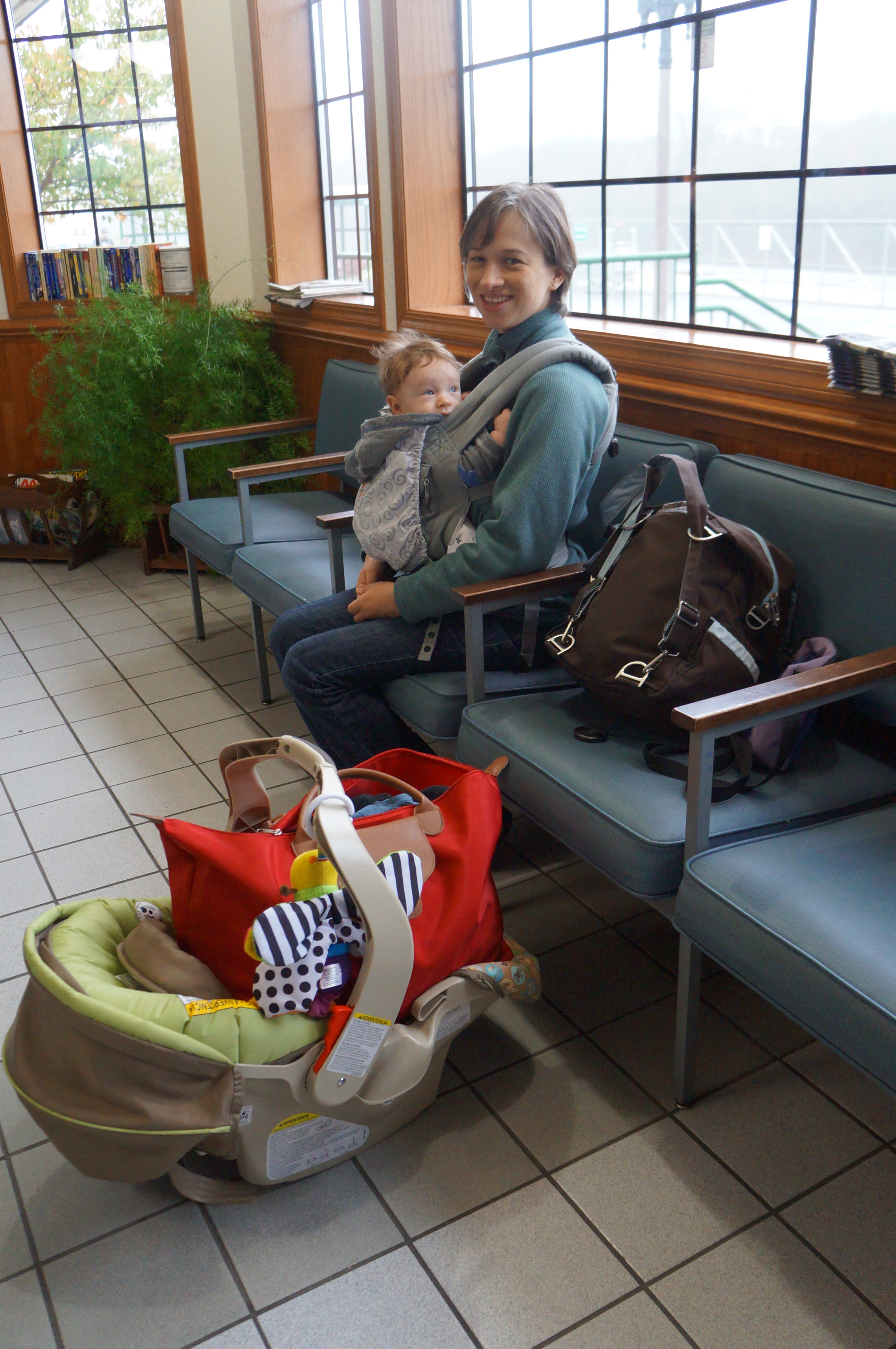 In the middle of the week, Ari and I took Amtrak to meet up with my family in Olympia for dinner and to stay overnight at my aunt and uncle’s house. I didn’t want to do four hours of driving by myself with Ari in the backseat with no one to entertain him. The train worked out great! If you’re traveling with a baby you’re allowed to bring more than the two-bag carry-on limit. I was going to take the stroller with the car seat attached so I could put our bags in the bottom of it, but when I parked at the station ($9 overnight parking!), I realized I didn’t have the attachment piece to put the car seat on the stroller. Fortunately I had the Ergo carrier, so I put Ari in the carrier, put my purse and the diaper bag over one shoulder, and carried the car seat with the other bag in it with my other hand.