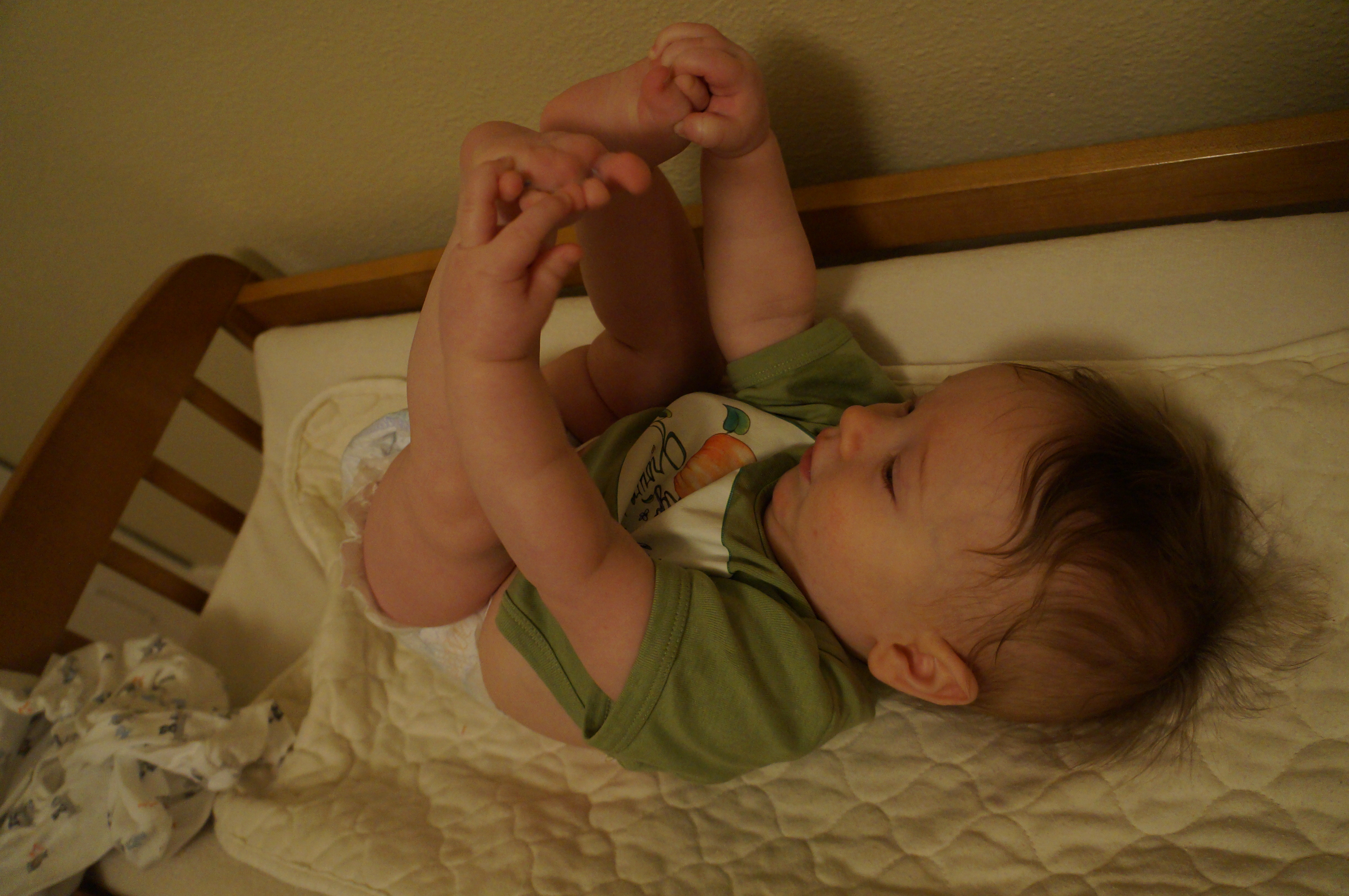 He also did his first back-to-front roll this week! (Front to back already happened.) That was a couple of days ago, and today he’s rolling himself around like it’s nothing. I finally took him to mama-baby yoga today and he happily rolled back and forth on a blanket in front of me.