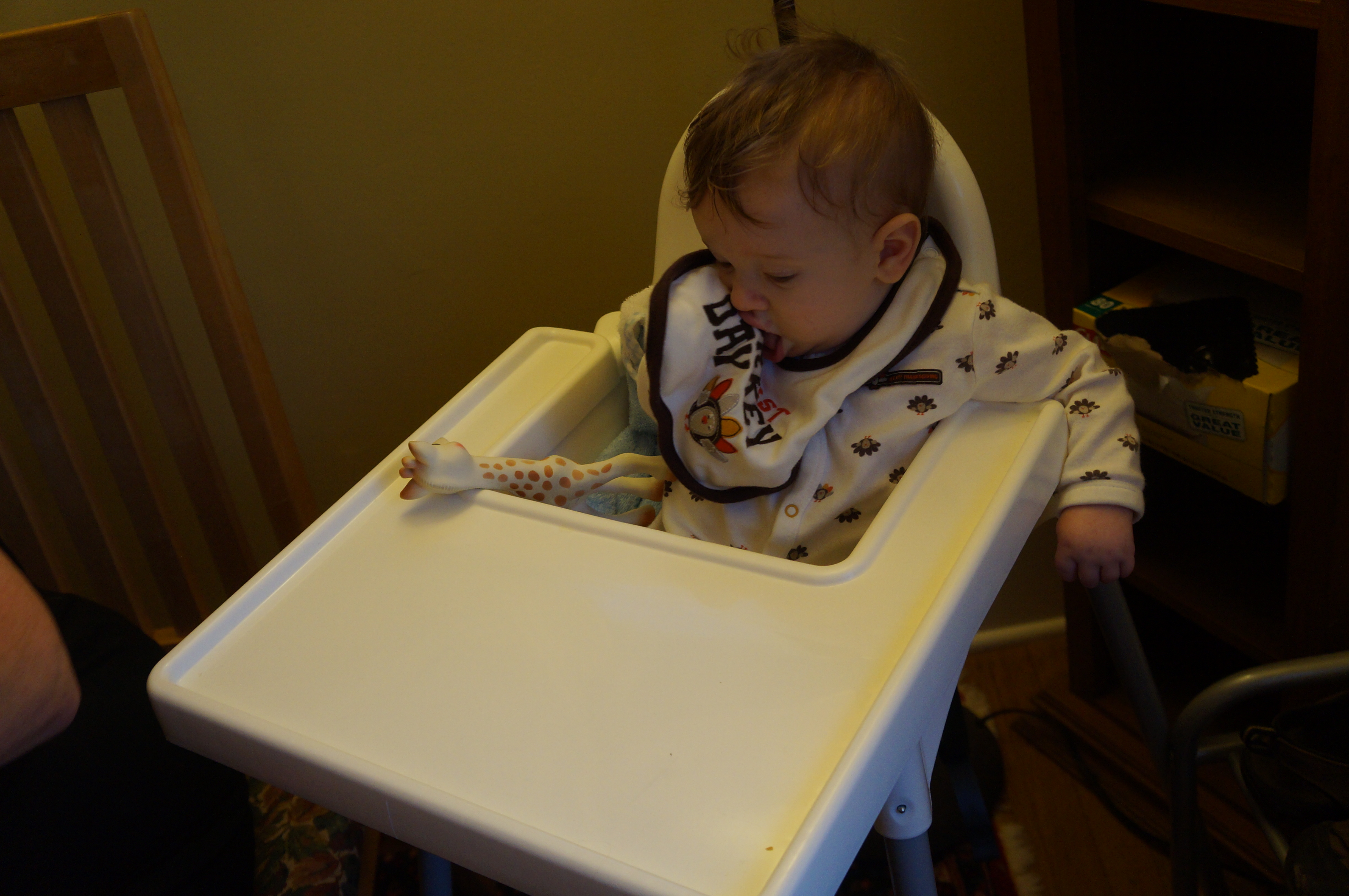 Oh, man. We’re starting to have our hands full here! All of a sudden, at 5 1/2 months old, Ari seems to be able to see much better than before. And – right on cue – he can reach and grab better, too. When we go out to eat he wants the silverware (or chopsticks), then it goes on the floor. He wants to grab my menu and sweep it back and forth and throw it on the floor. He can see small objects and he wants them, too! Now I have to think about what is within his reach! He also likes to sit in his high chair and play with toys on the tray, and he’s constantly dropping them on the floor.