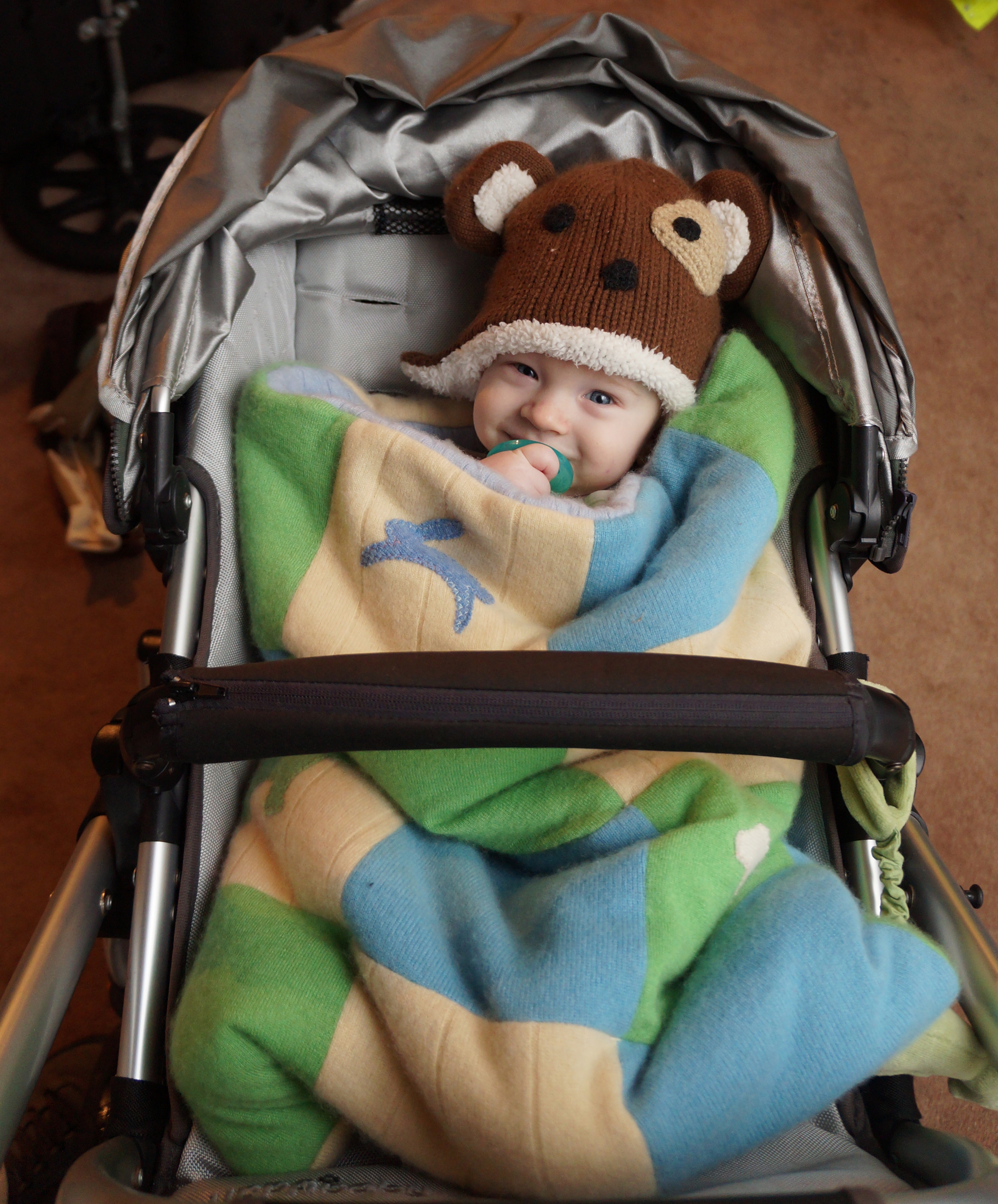 Here is Ari ready for a walk in the cold, in the little sleeping bag my friend’s mom made: