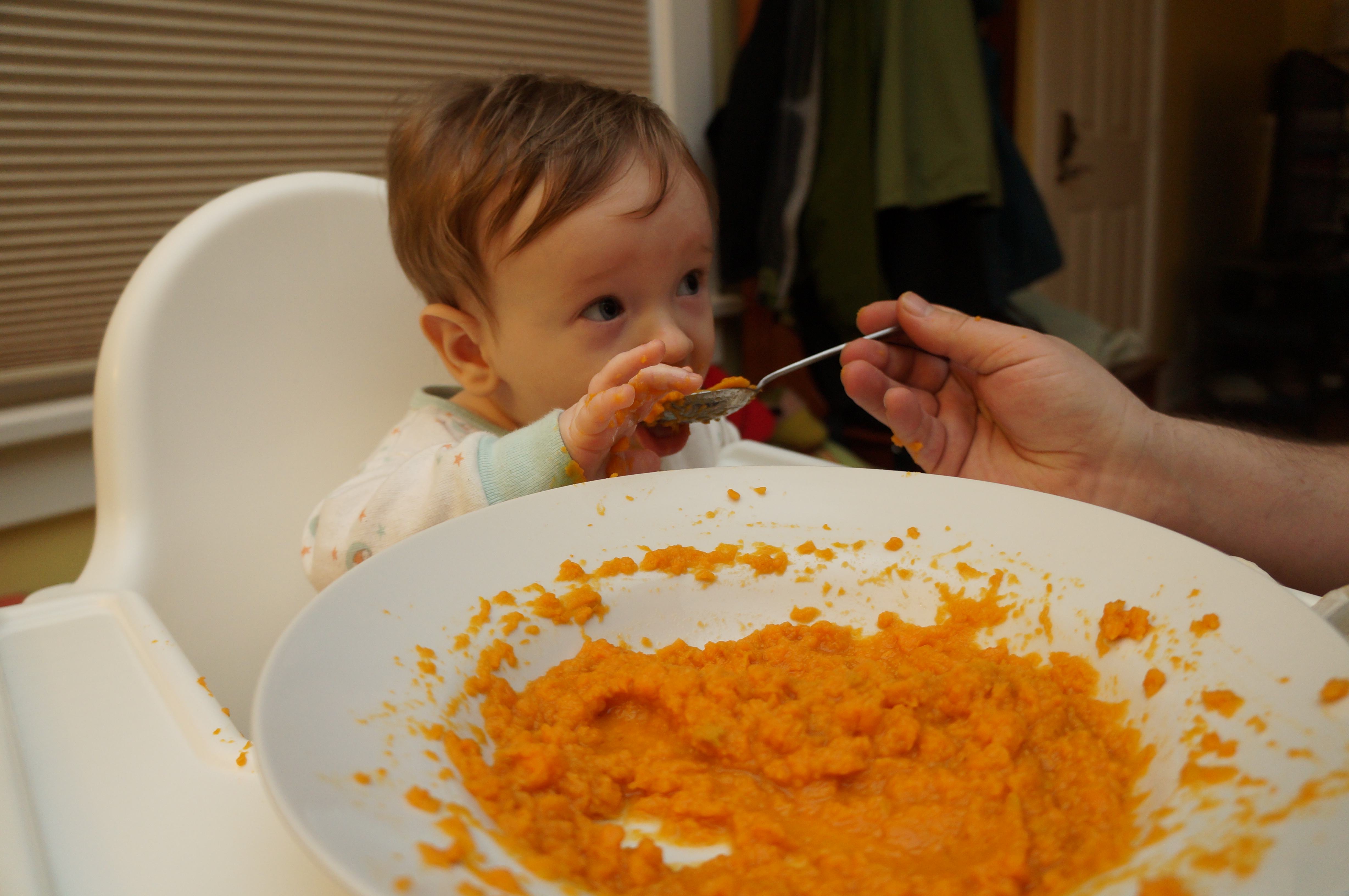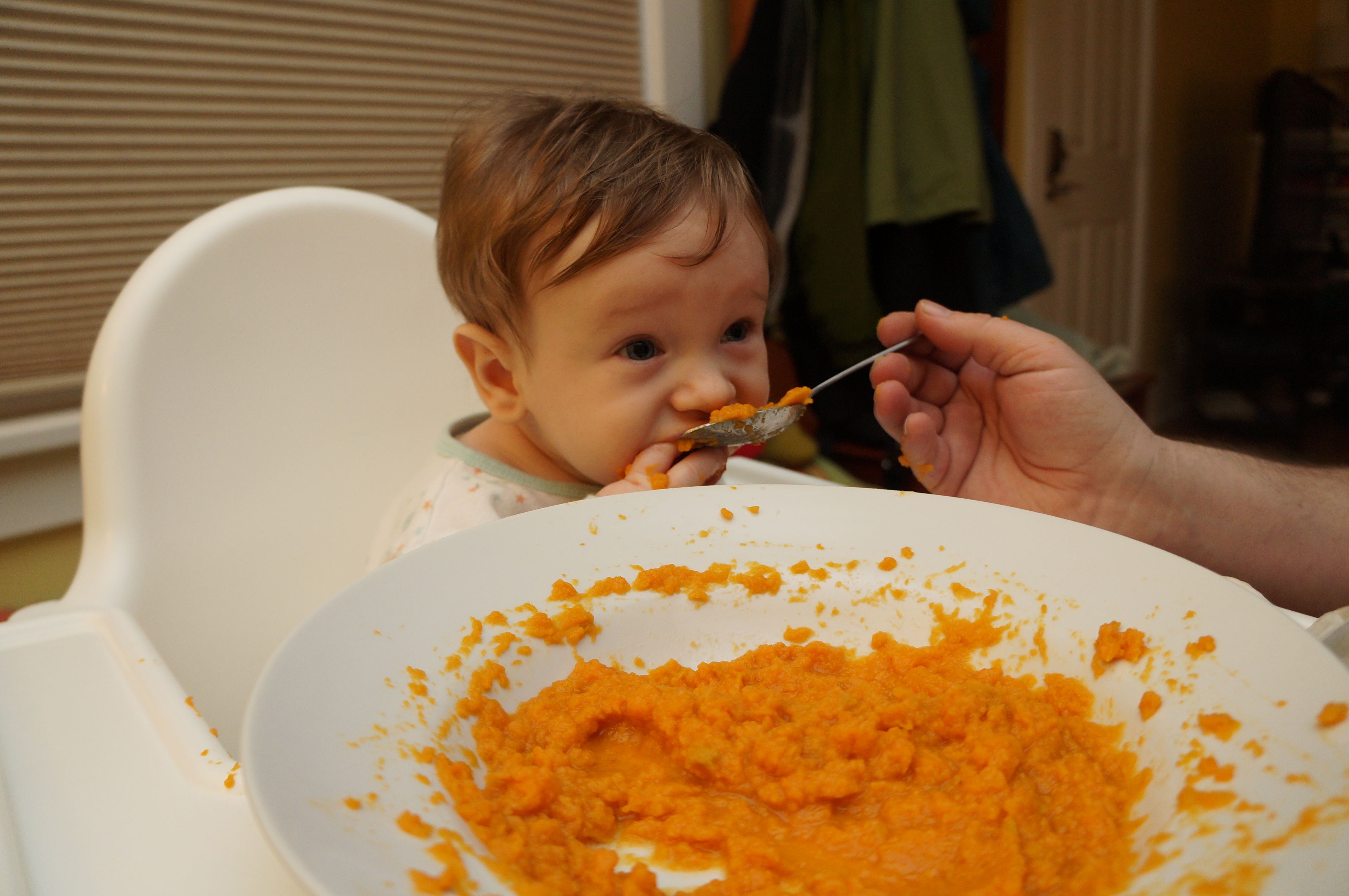We have a big bag of organic sweet potatoes, so we started with those! I went ahead and cooked and mashed some, thinned out with water, and we spoon-fed it to him. This is not the baby-led weaning approach – I think I’ve been getting a little too excited about getting new foods into him! But he grabbed the spoon and shoved it in his mouth sometimes, and stuck his fingers in it and sucked on them. I think he actually swallowed some! I had to remind myself that he should only have a teaspoon or two at first so he doesn’t fill up. There’s something about having a dish of mashed food in front of me that makes me want to keep spooning it into his mouth until it’s gone!