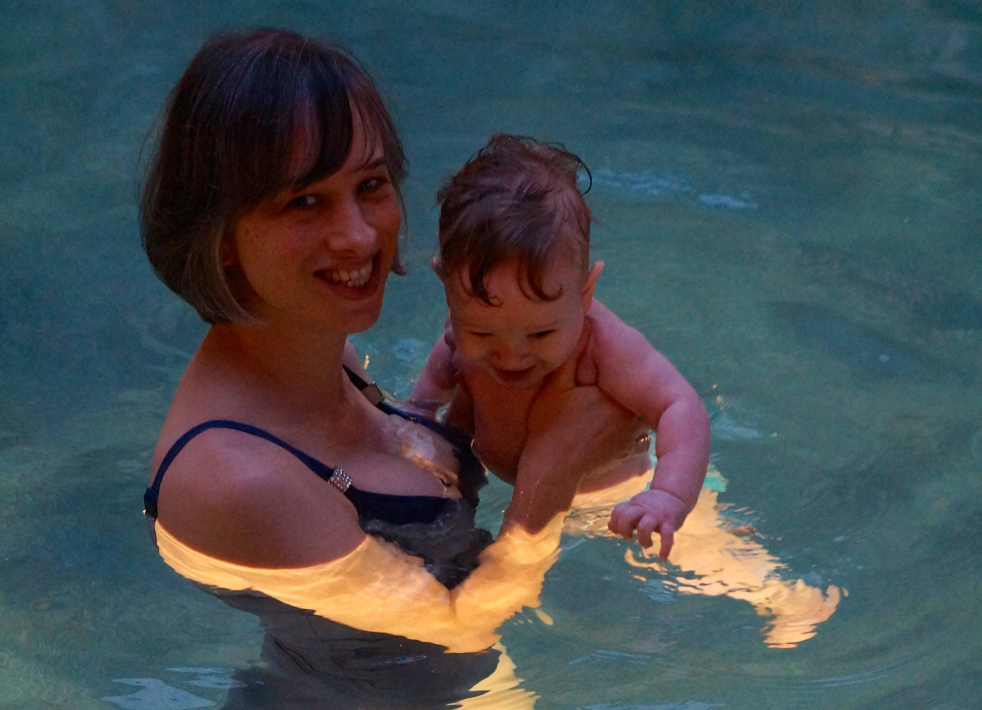 We had so much fun in the pool we just took him to a local community center with a very cool, shallow family pool (with a water slide!). The whole process took forever, especially having to be in separate changing rooms so we couldn’t help each other with Ari. But we discovered afterwards they have a family changing room, so maybe next time will be easier! We signed up for a series of 10 baby swimming classes for 6- to 18-month-olds, yippee! I will have to miss some due to my work schedule, but A. should be able to take him every week.