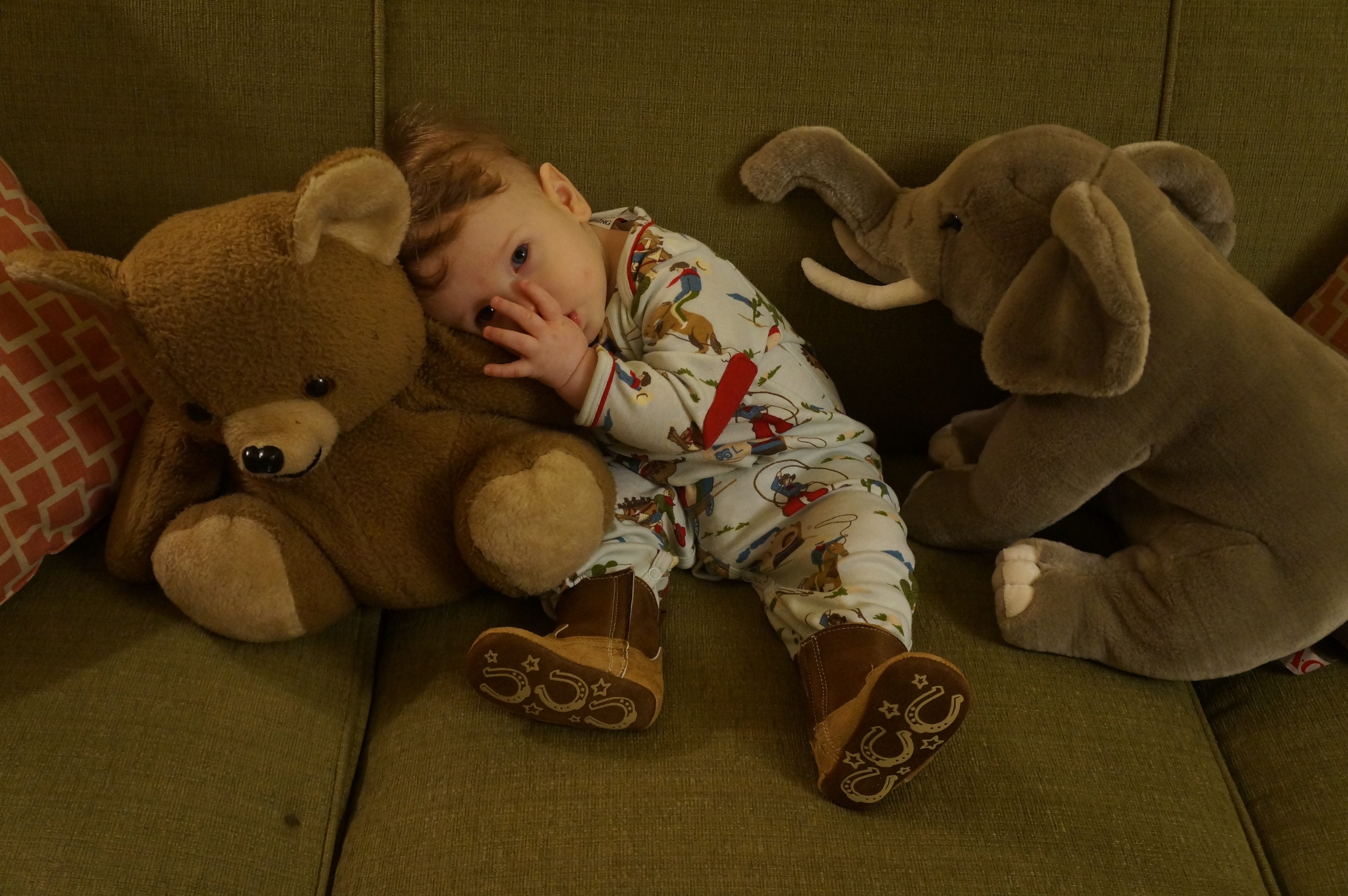 I’m posting earlier than normal because I’m going to use this 6-month mark to transition out of trying to photograph and post on the same day every week. It hasn’t really been happening on schedule since I went back to work, anyway. I think I want to do at least a monthly picture with the bear and elephant, and other posts based on events or topics I want to write about rather than each week. I did weekly photos for about six months of my pregnancy, too, so it’s kind of like a year of weekly photos of Ari’s development. 🙂