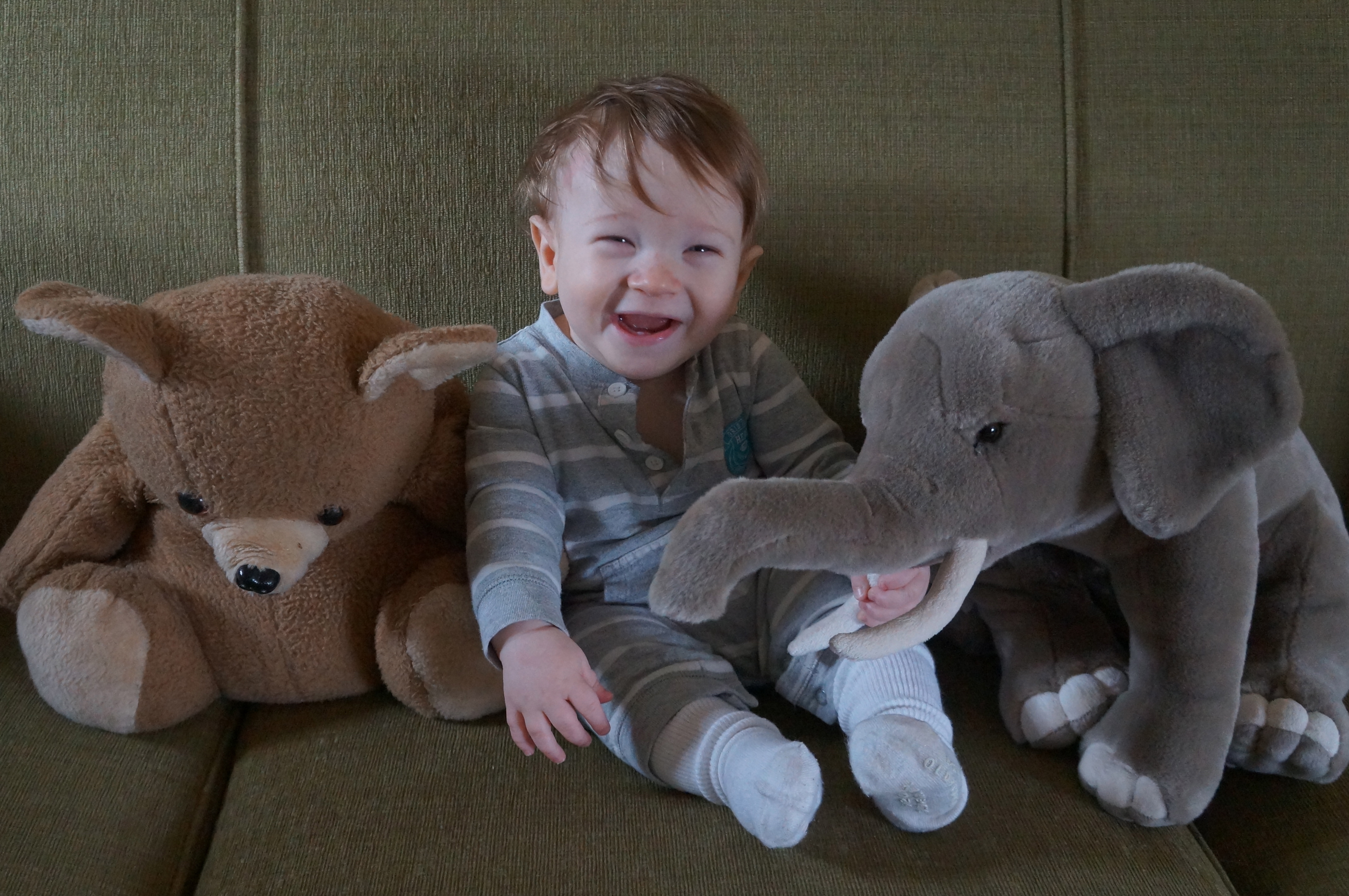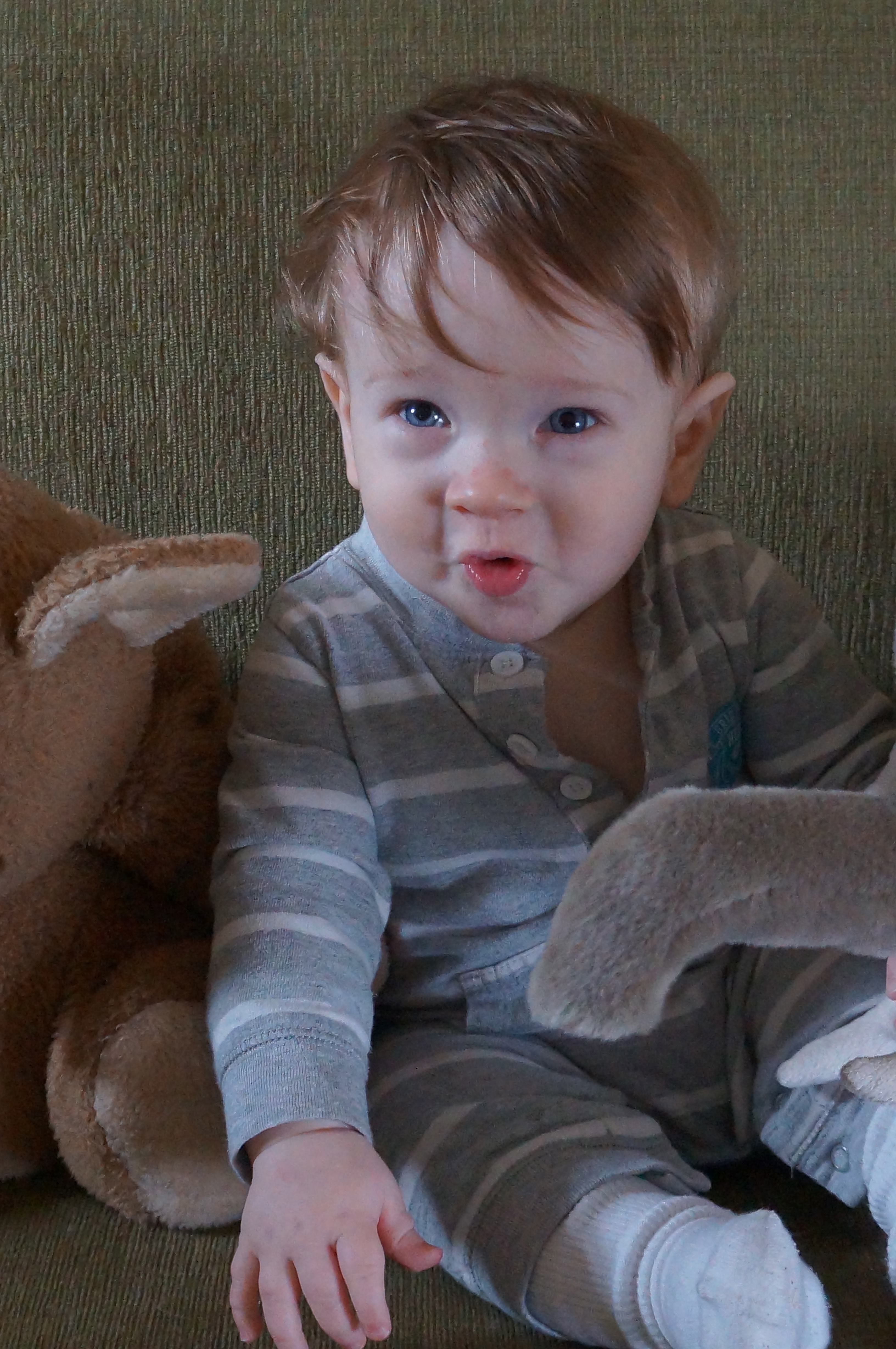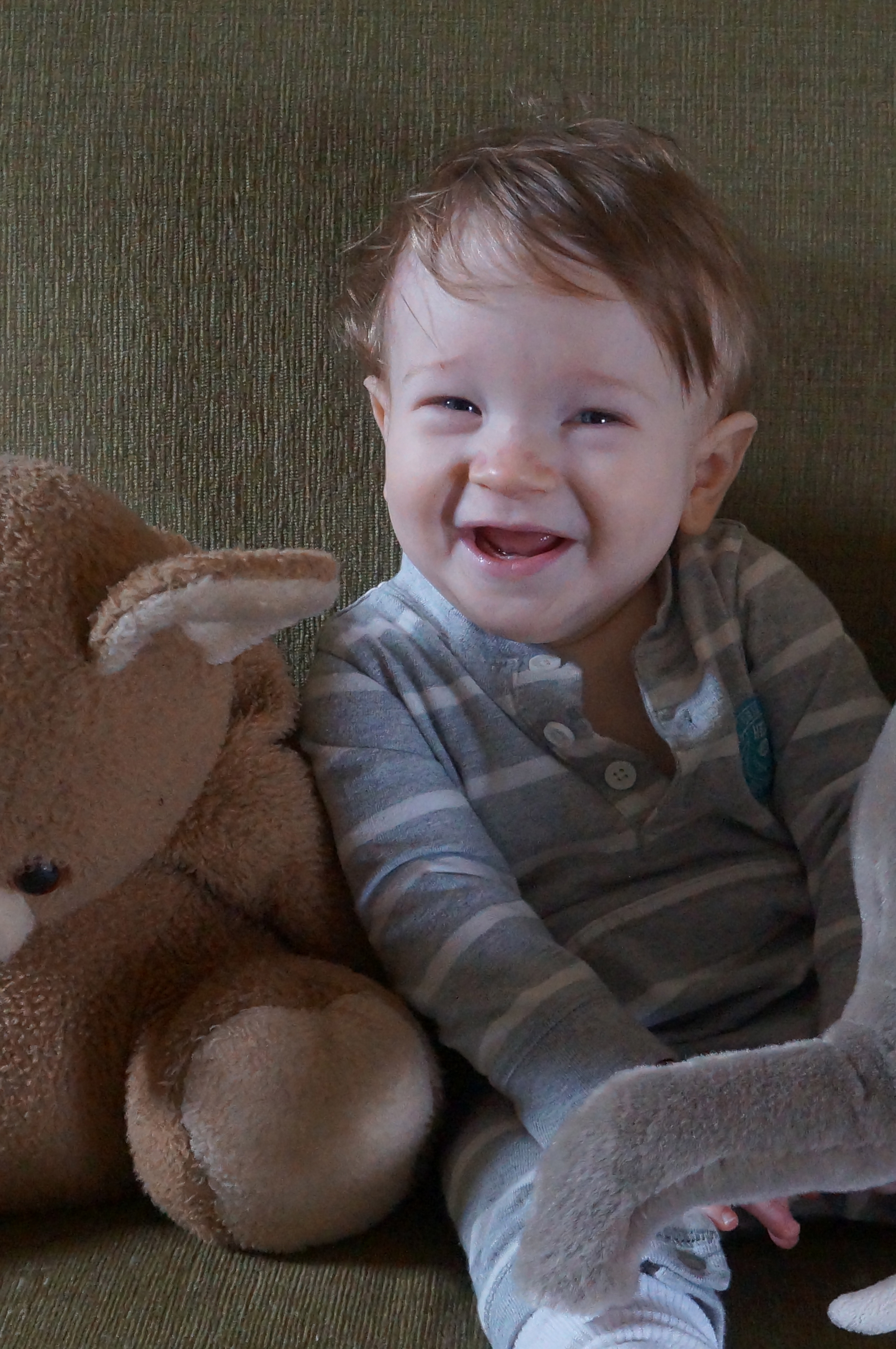 What are his developmental milestones now? Well, he army crawls, sits up by himself, stands up if he’s holding on to something, picks up small objects and transfers objects from one hand to another, eats purees and cereal, babbles “b,” “d,” “g,” and “k” sounds, and blows raspberries, and he has two tooth buds! He smiles a LOT and laughs quite a bit, too. He loves people and gets very excited in social settings. He’s really a happy guy! We’re very lucky.