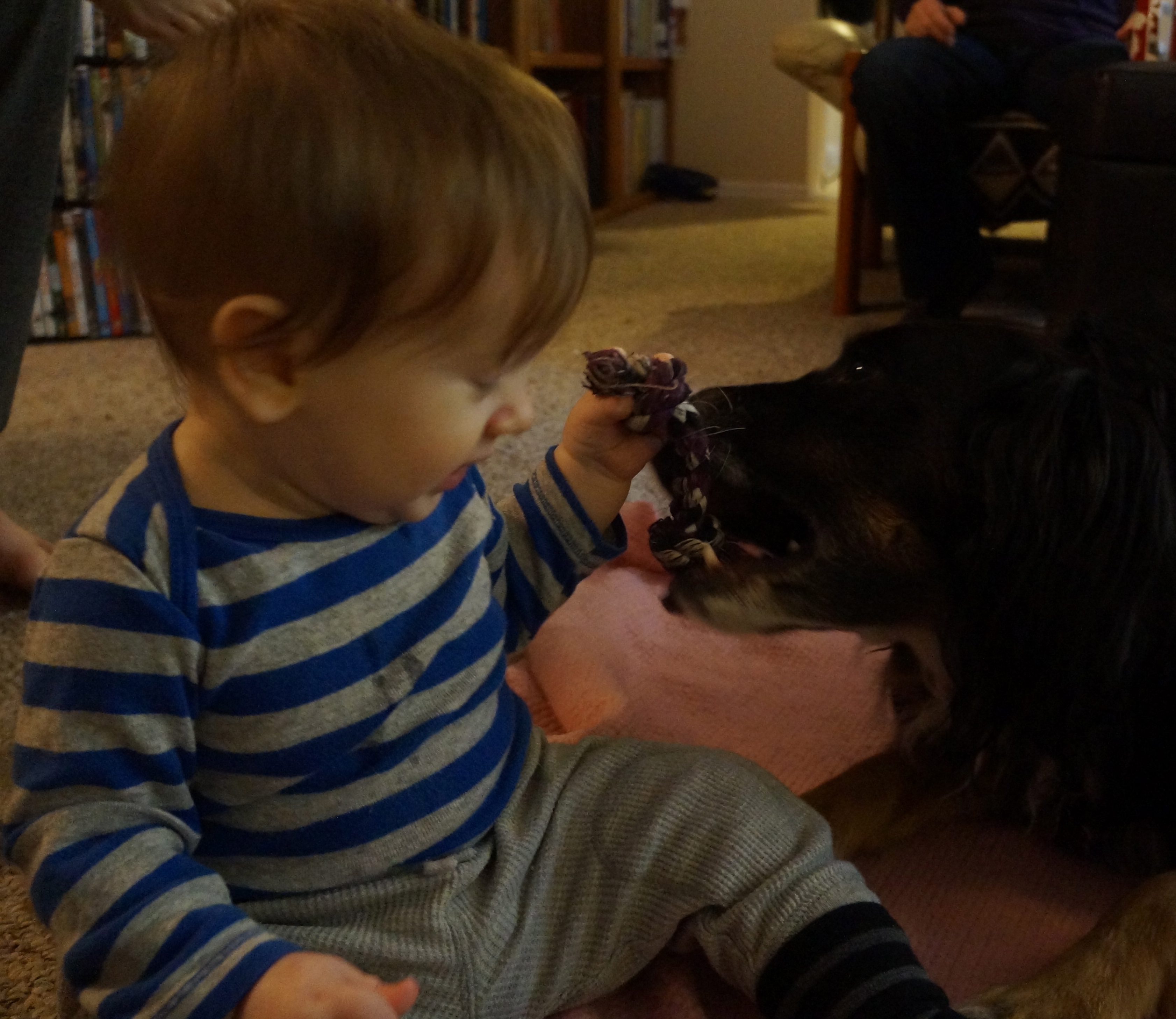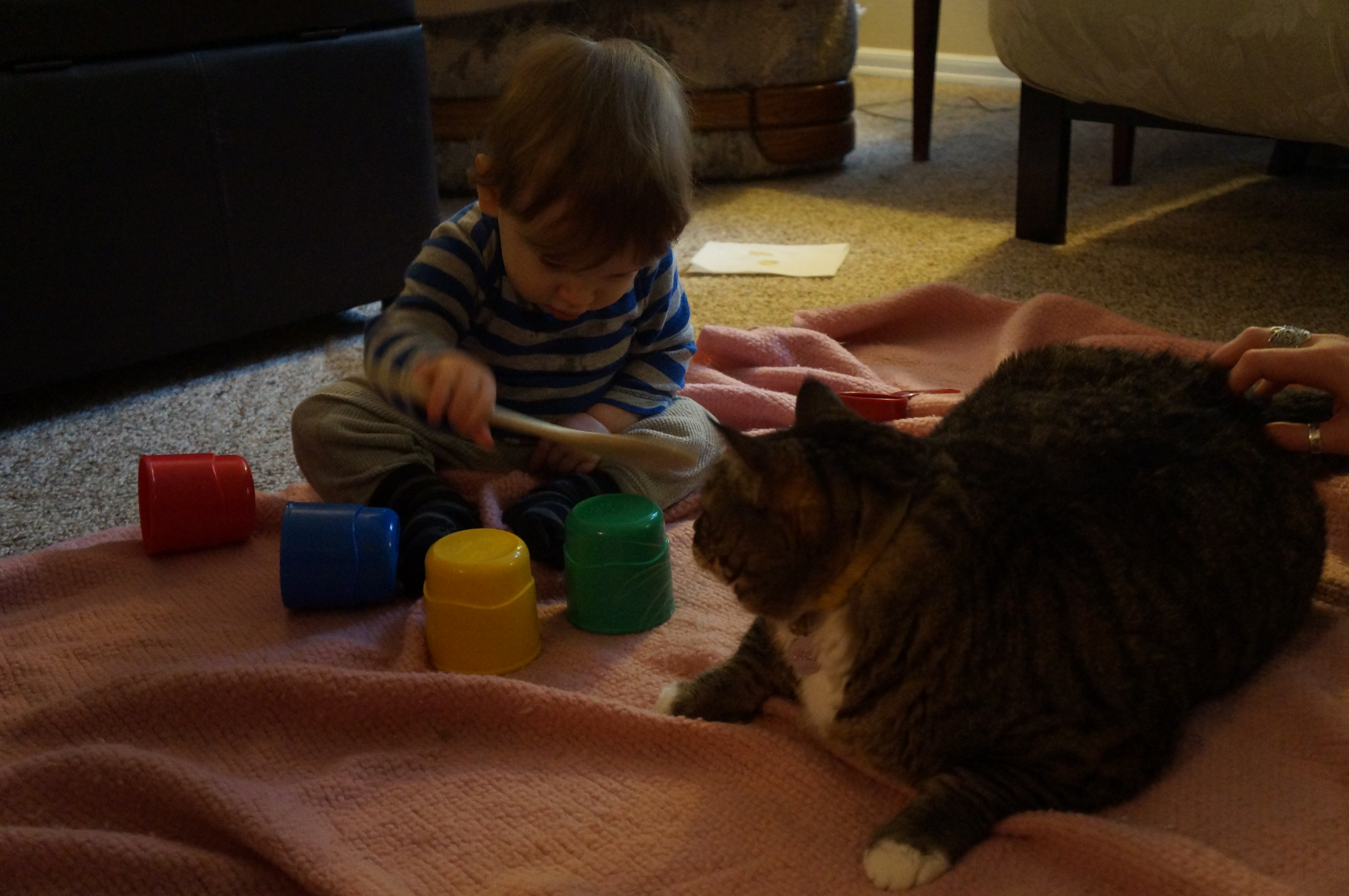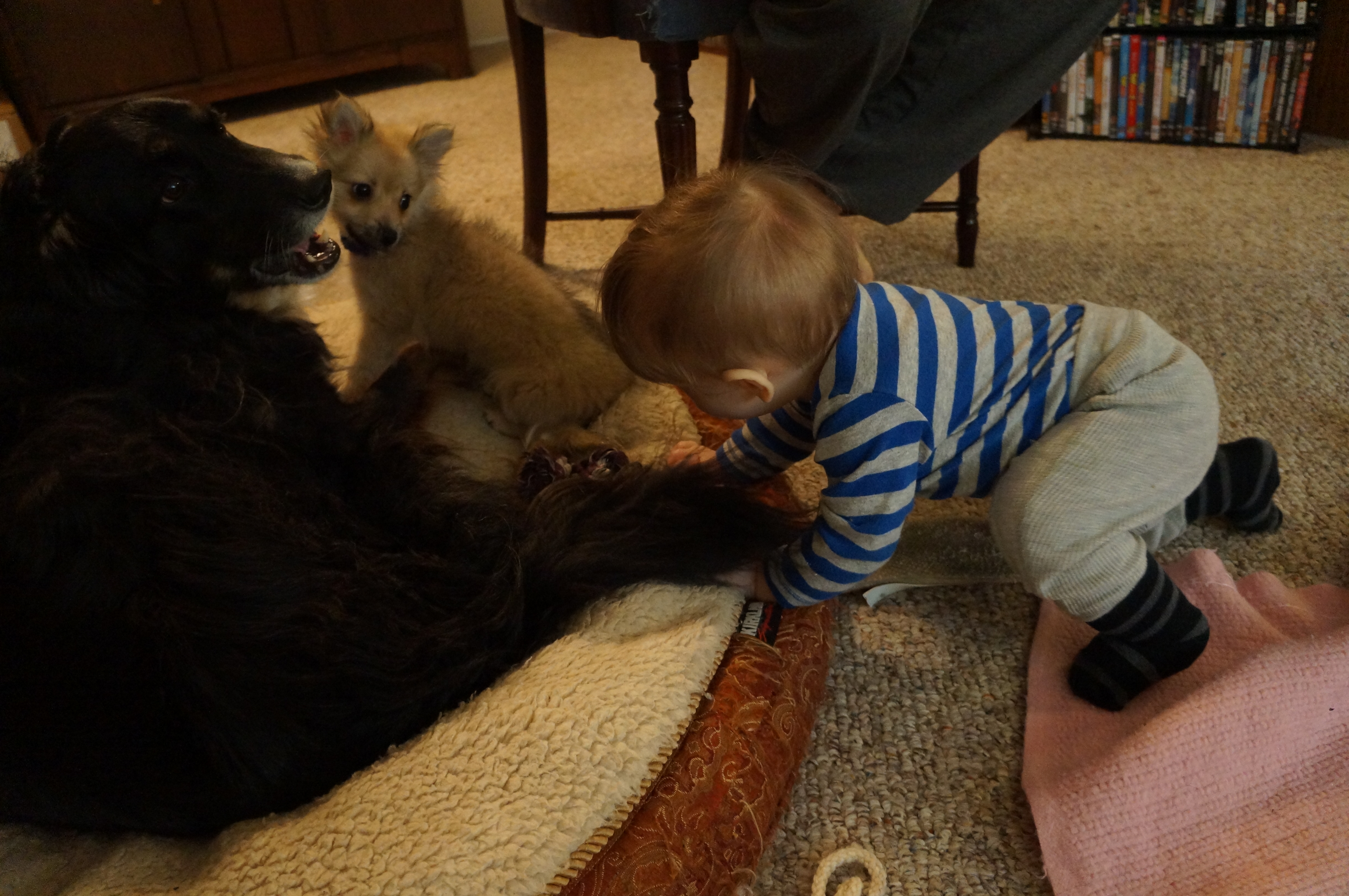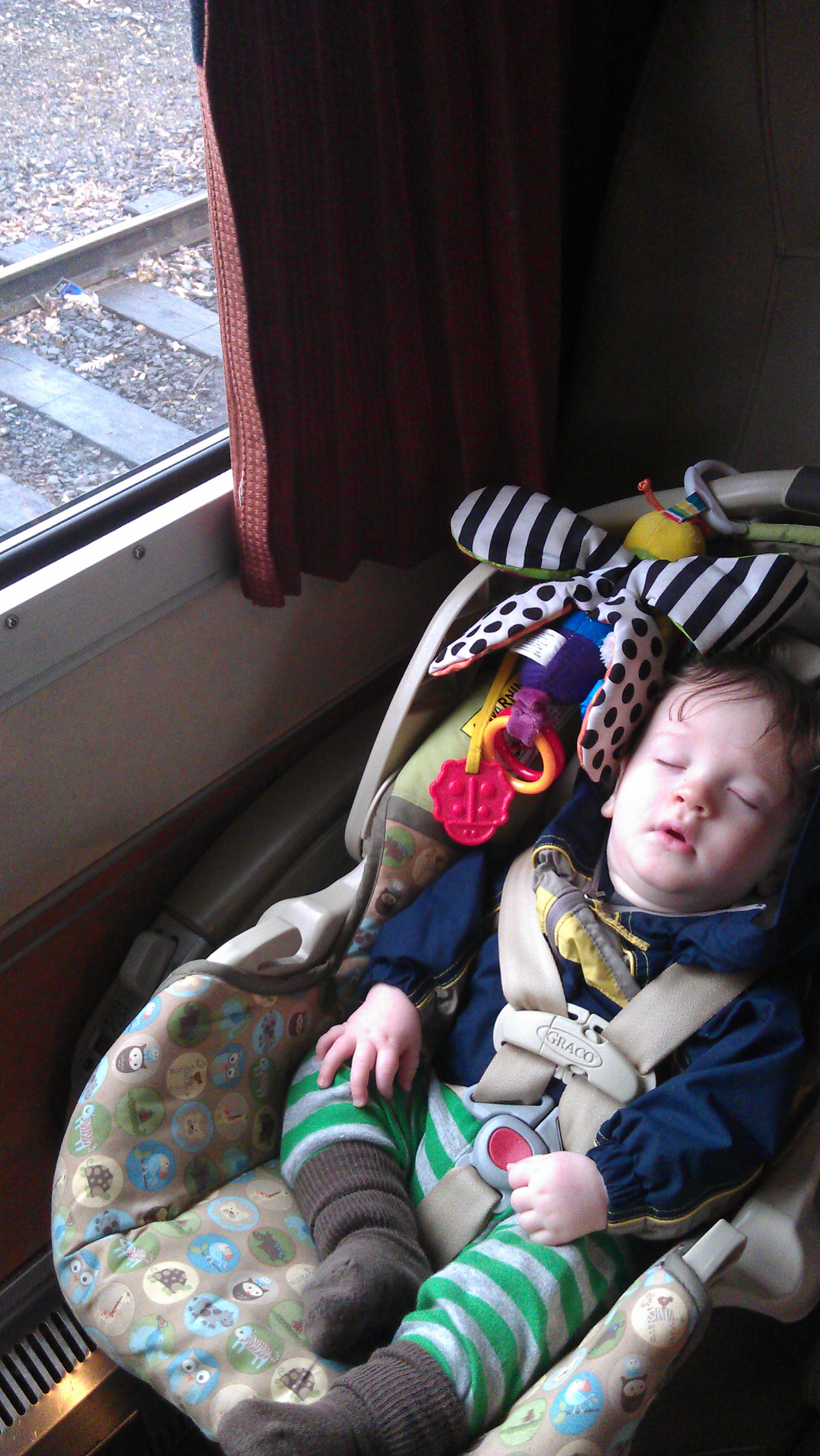Last weekend we took the train to Olympia to spend the night with my aunt and visit my other aunt and uncle and my cousin and her boyfriend and my aunt and uncle’s dog and cats and tiny new puppy! It was Ari’s second train trip and it worked out great again – most of the way there he slept in his car seat on the seat across from me, and most of the way back he slept in his car seat on the seat next to me.