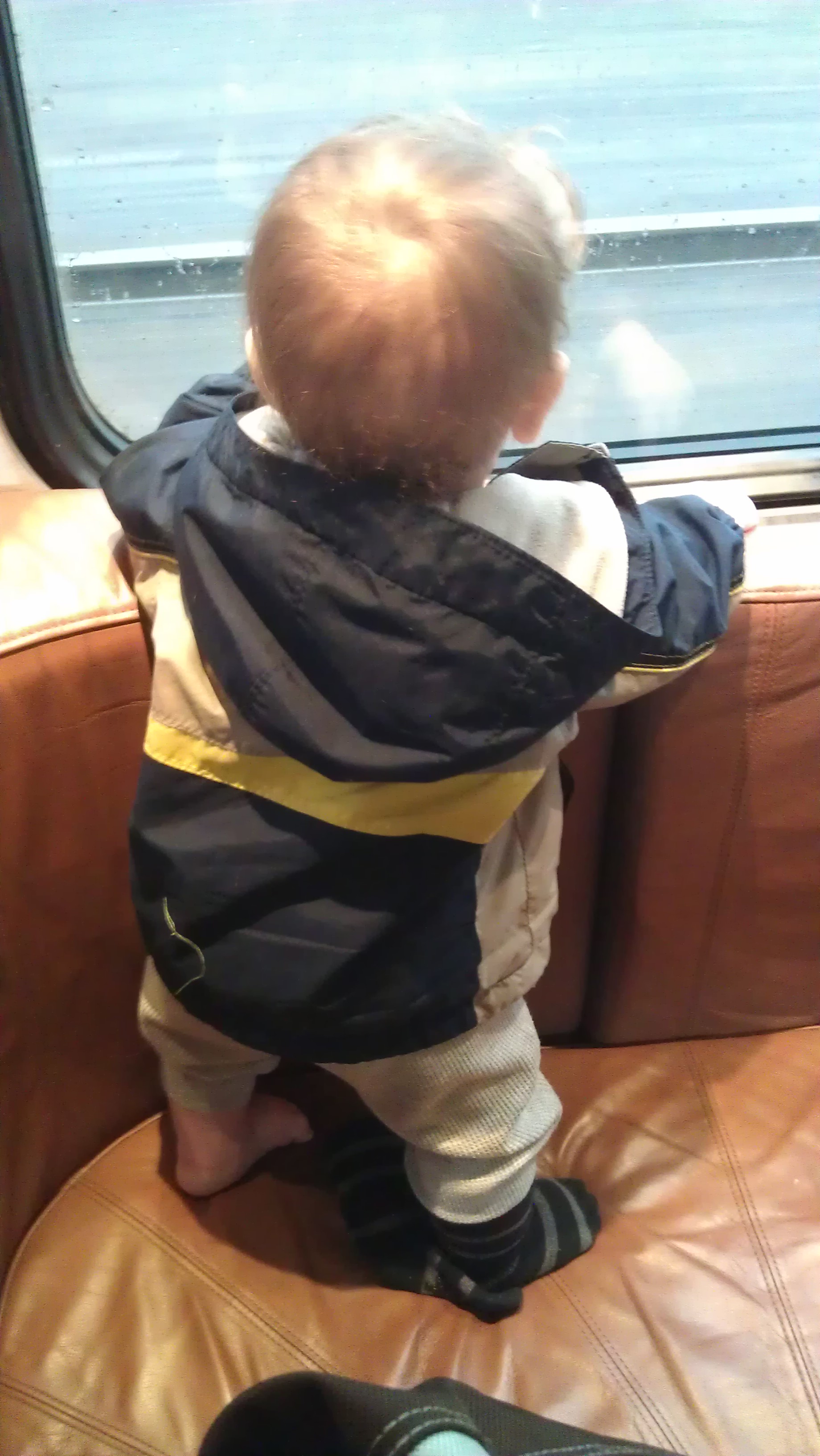 And on the way back, after he woke up, in the dining car – he stepped on one of his socks and pulled it off:
