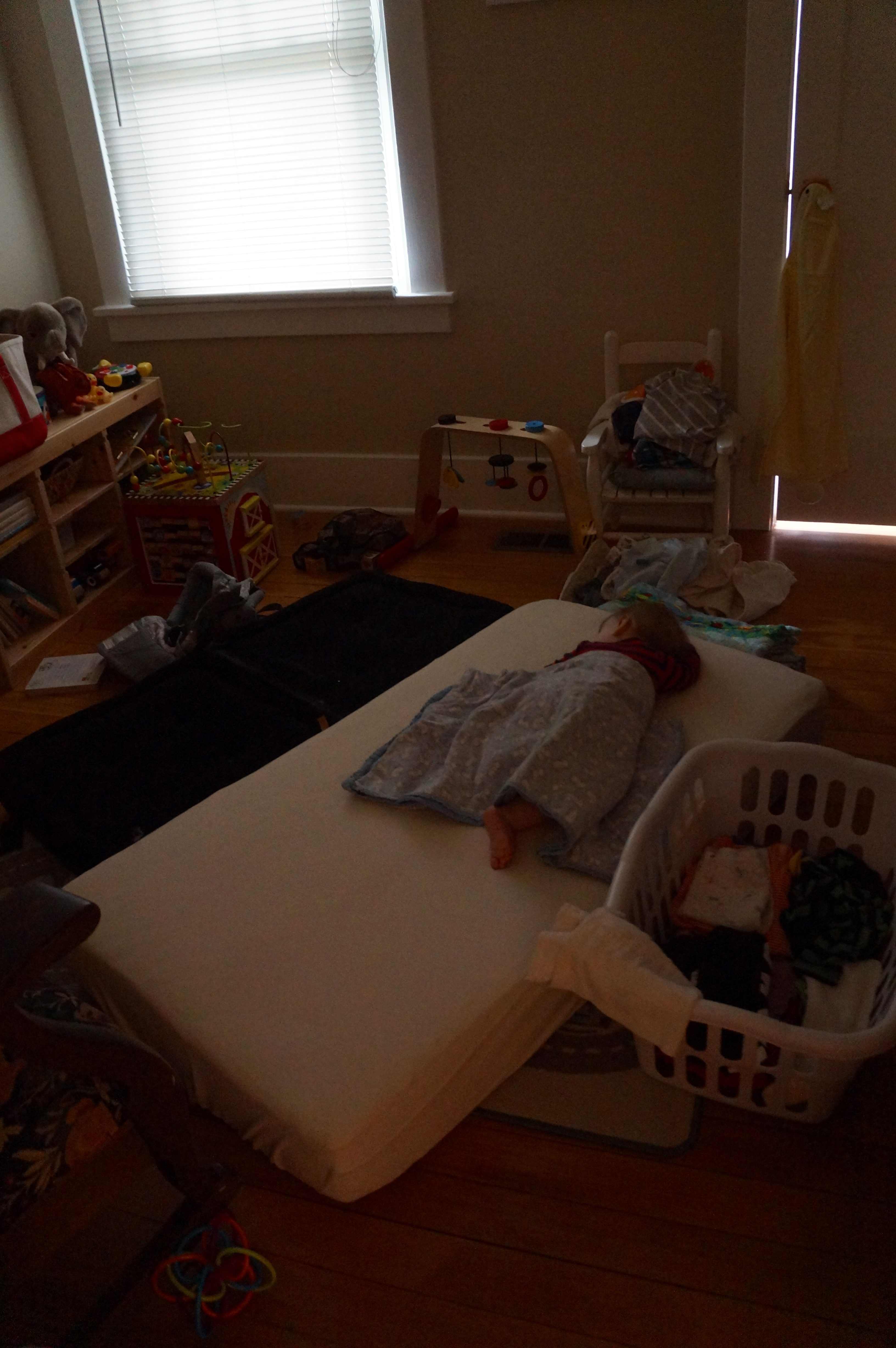 Before he was born, I was interested in what I called “Montessori floor beds”. I first learned about it here, and you can read more about the concept here. I recently read this blog entry and thought maybe I should try it now. I didn’t spend any time creating a good set-up, which would require taking his crib out of his room, but I just put the mattress on the floor and put some cushions next to it. He did take some good naps on it when I was able to lie down with him and then get up and leave him there, but I wasn’t comfortable leaving him there at night, and he kind of hurt himself trying to crawl off of it a couple of times. So we put it back in the crib. I think the mattress might be too thick (7 inches) for a floor bed, although I’d be willing to try again with it in the corner where the crib is, with more cushions around it (and with a more baby-proofed room).