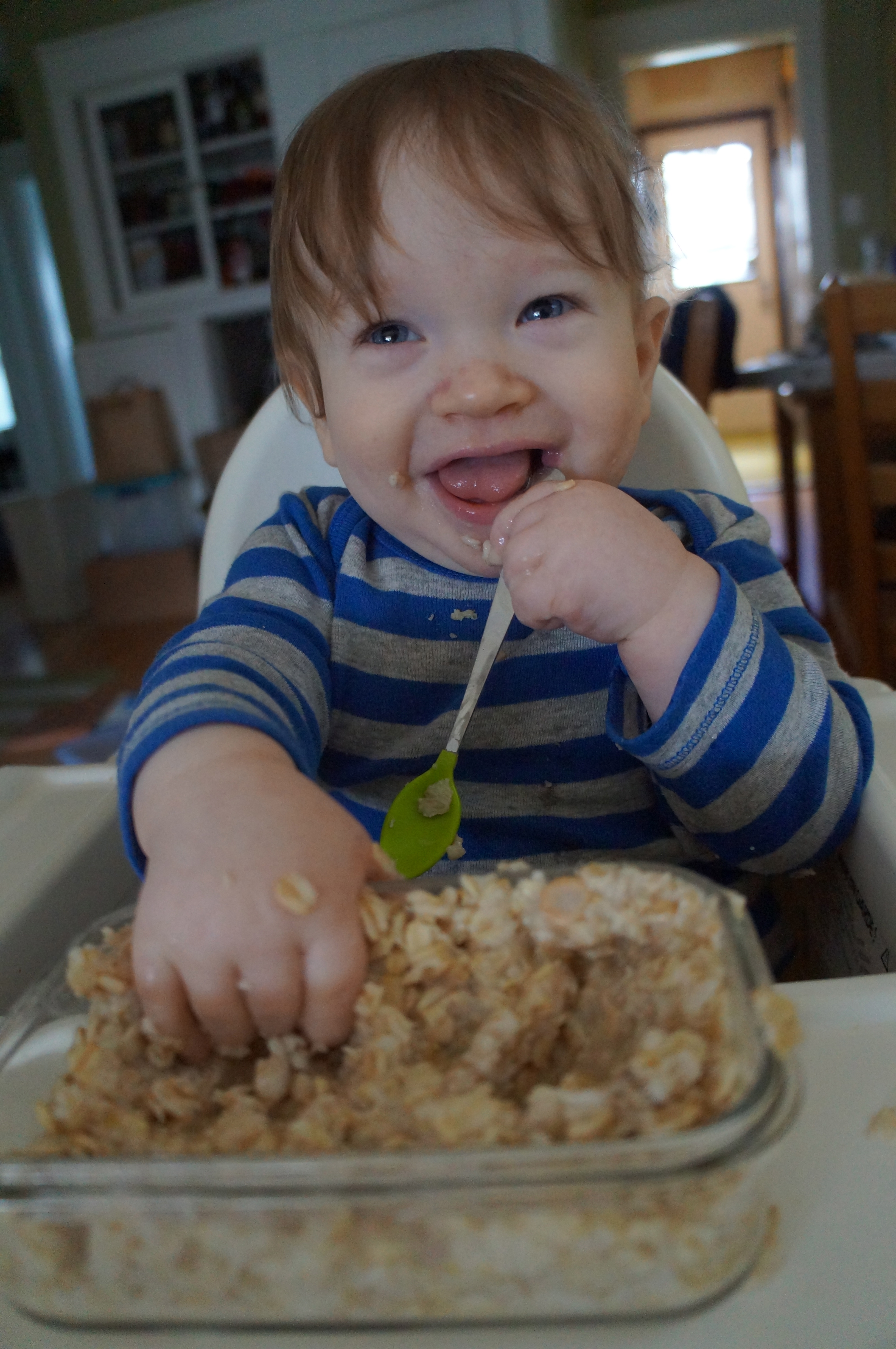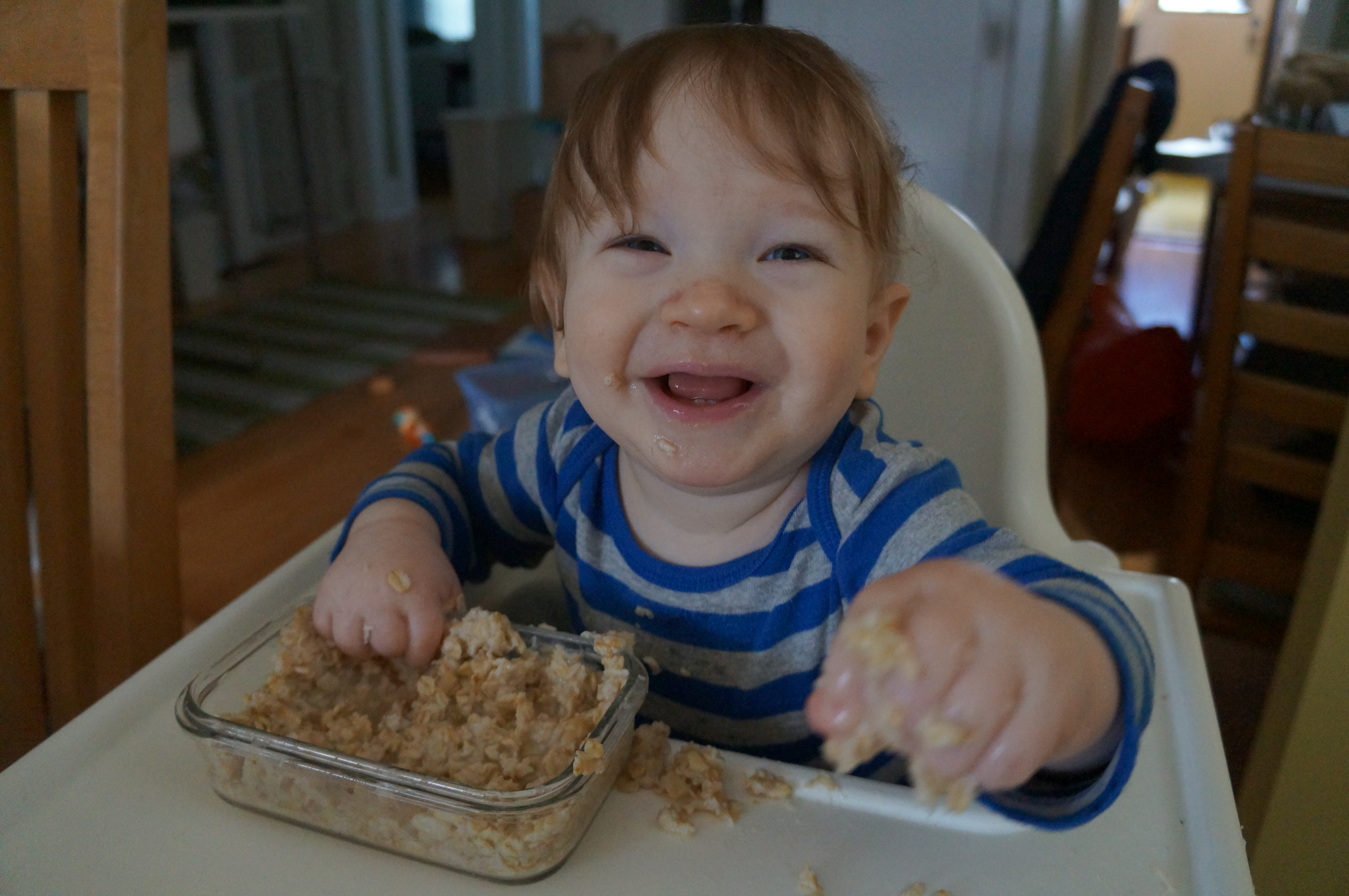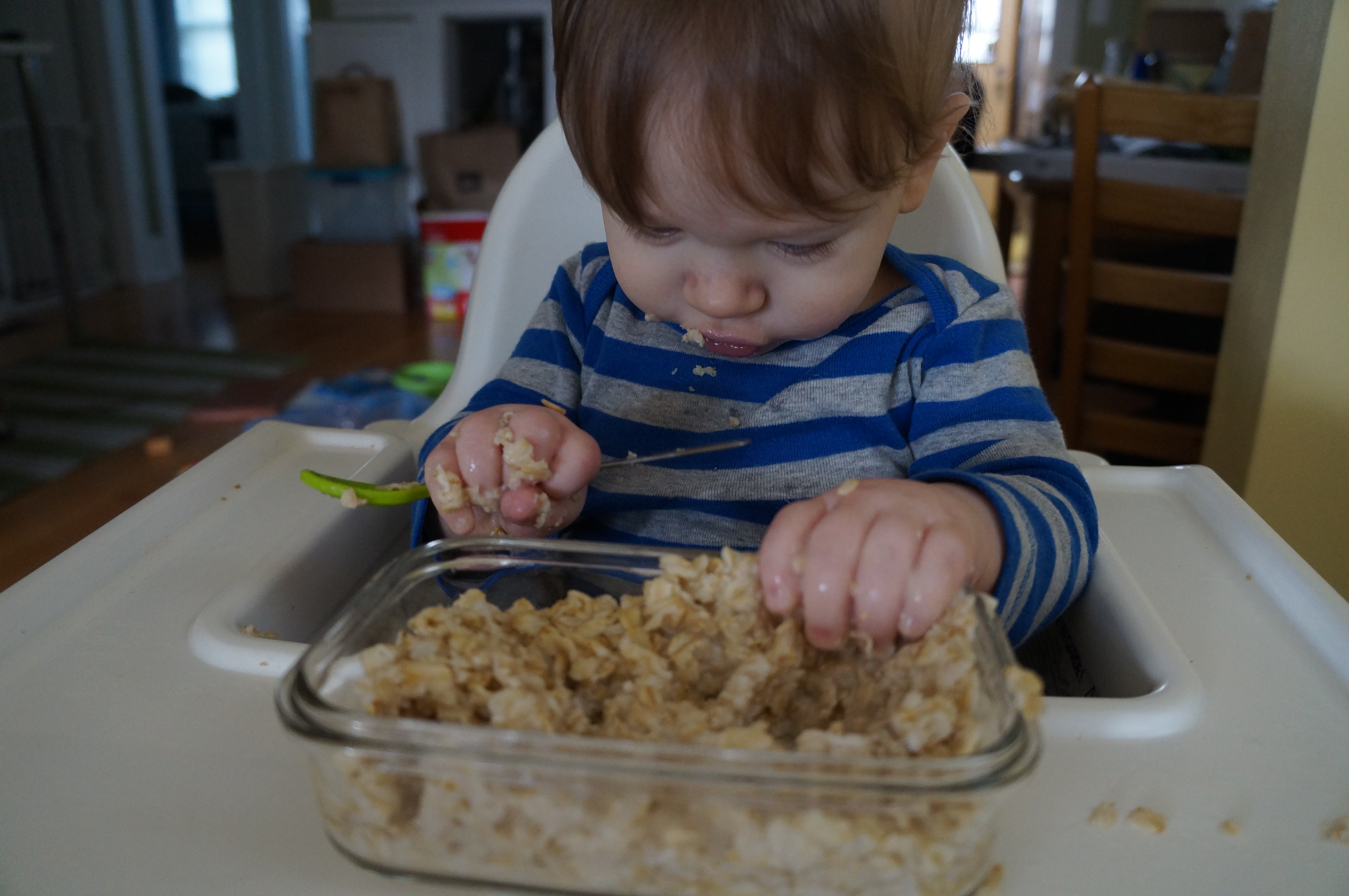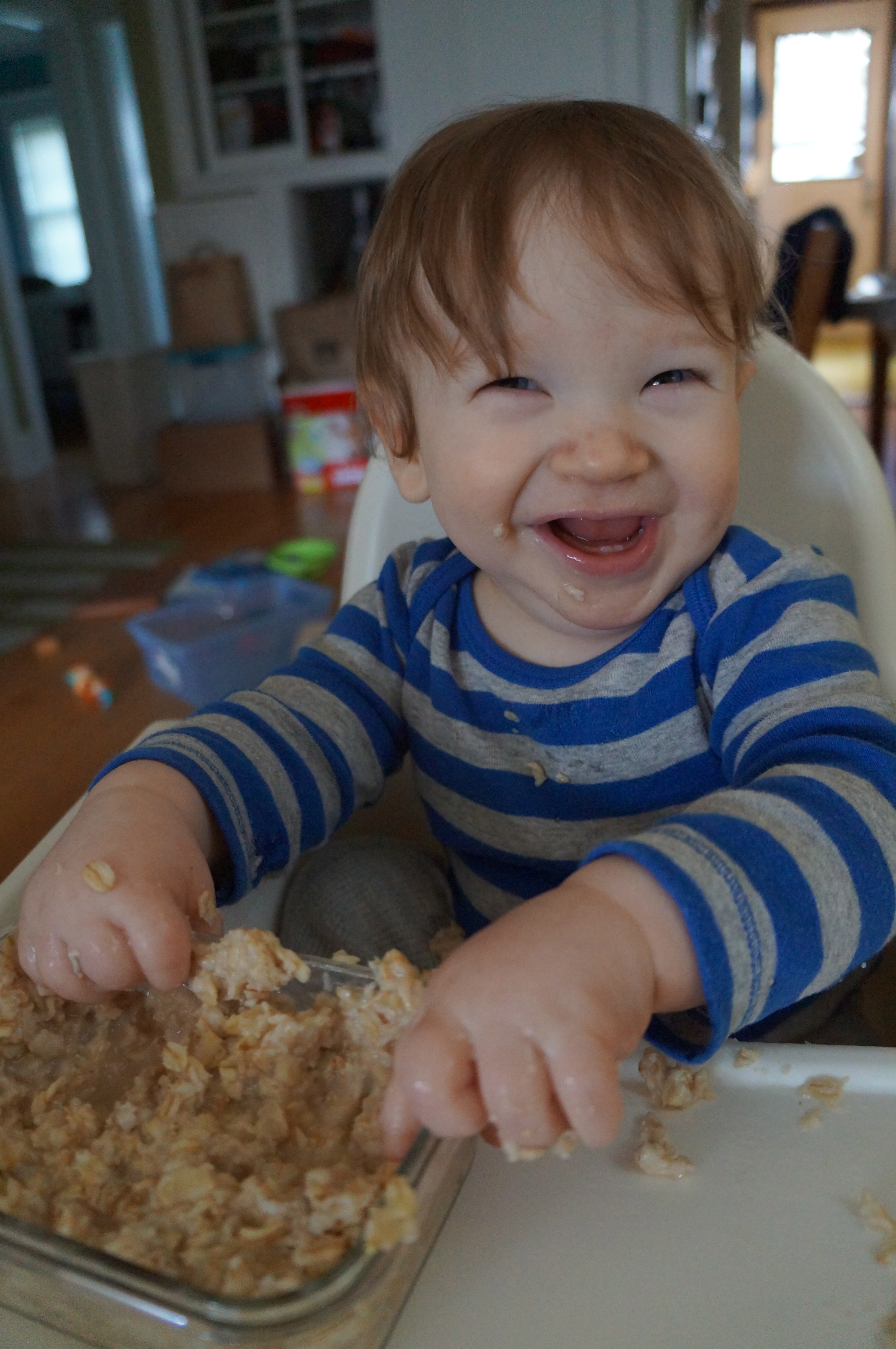 I have started giving him some of the oatmeal or Bob’s Red Mill multigrain hot cereal I eat in the morning, minus the brown sugar and almonds. These pictures are from the first day I shared my oatmeal, and he seemed pretty into it! He made a giant mess, too!