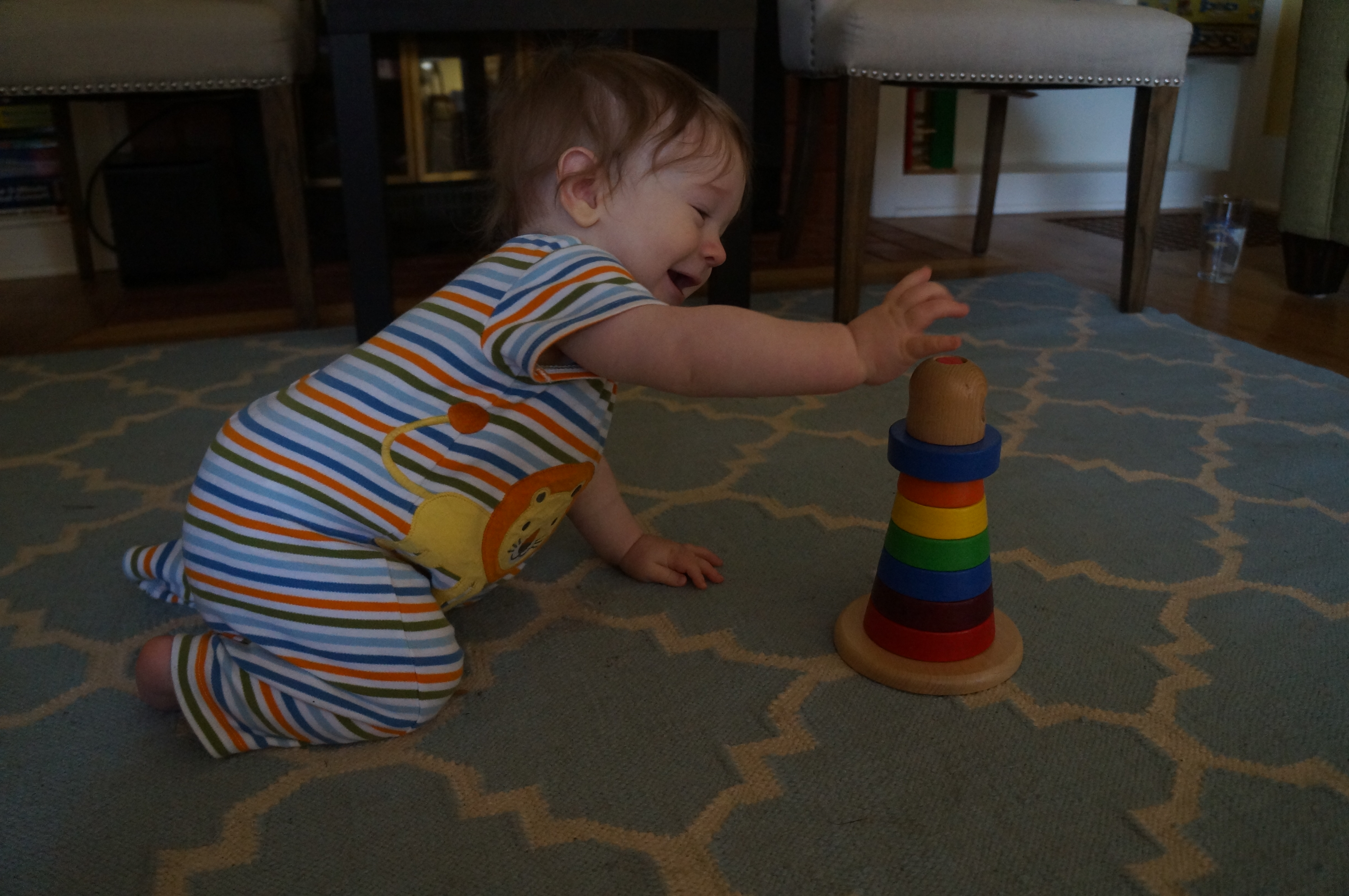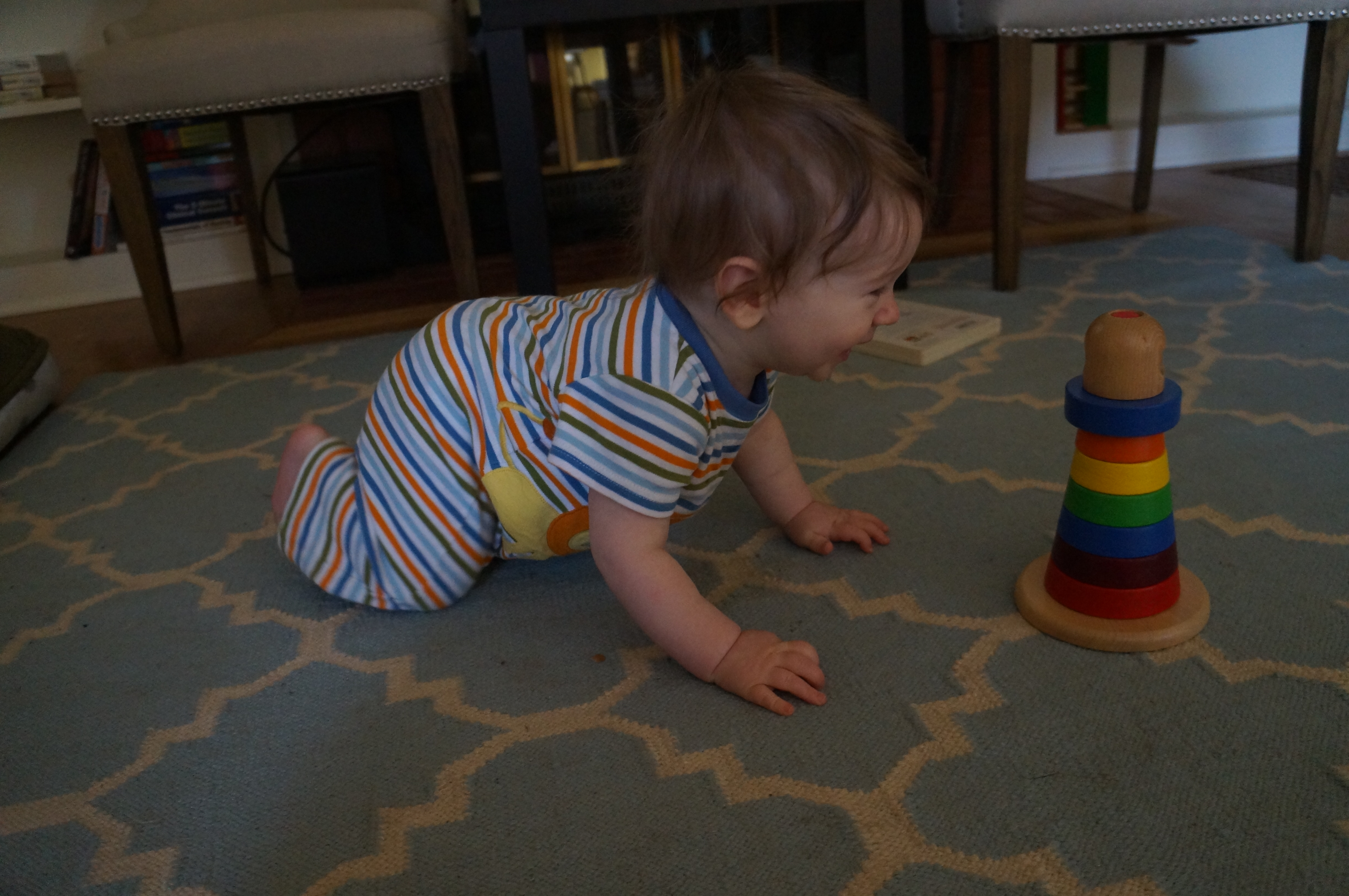 Ari has started crawling on his hands and knees! He’s also pulling up on the furniture, my legs, and whatever else he can reach. I took these pictures after he crawled over and took this toy off the shelf: