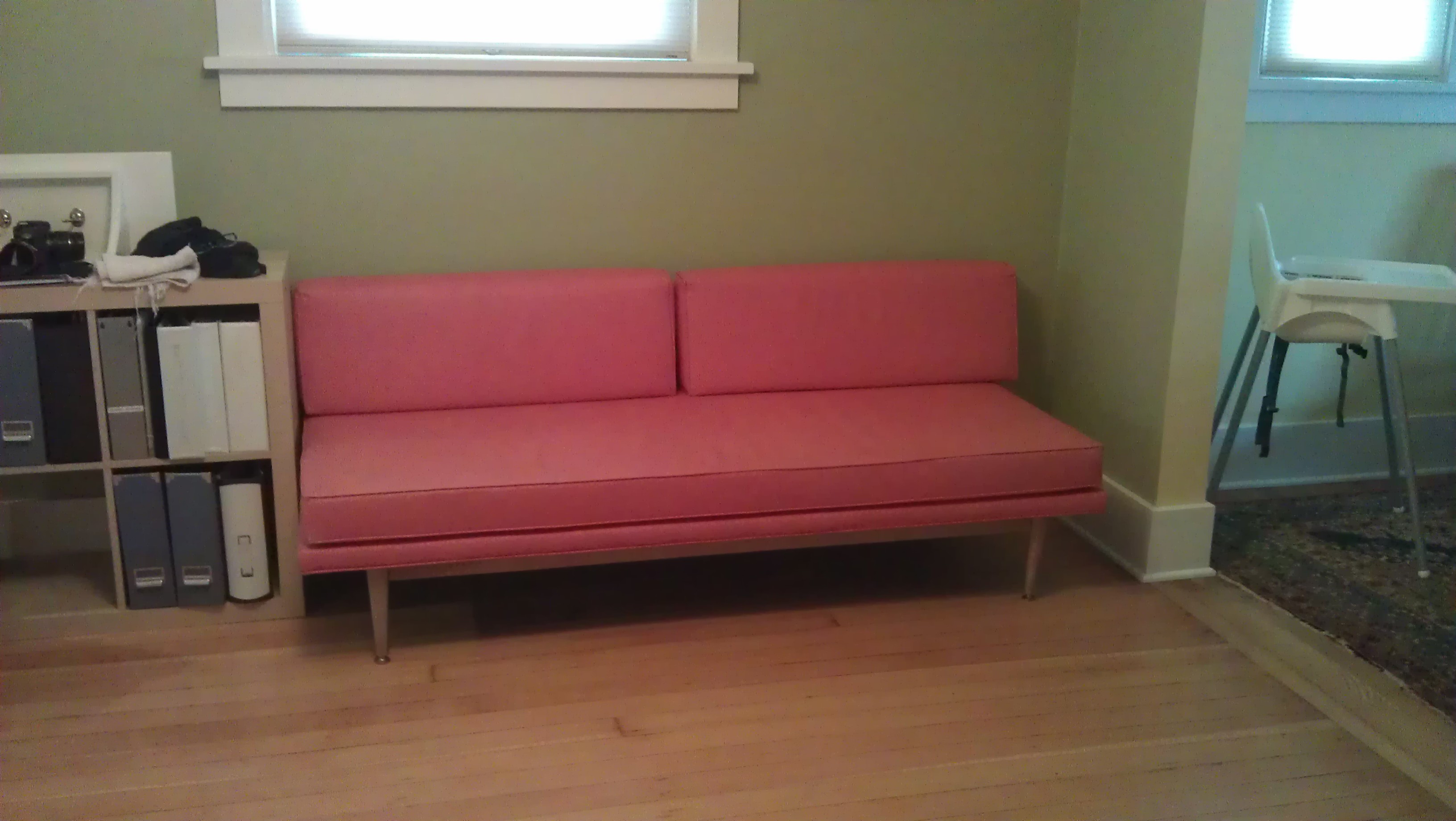 With my parents watching Ari while I was at work the next day, A. started working hard on getting our house cleaned up and organized. We continued working on it over the past week, and it’s looking a lot better! When we’re all finished I’ll do some posts on our new set-ups and systems, or at least I hope to. But for now I do want to show off this 1940s day bed we got through Craig’s List: