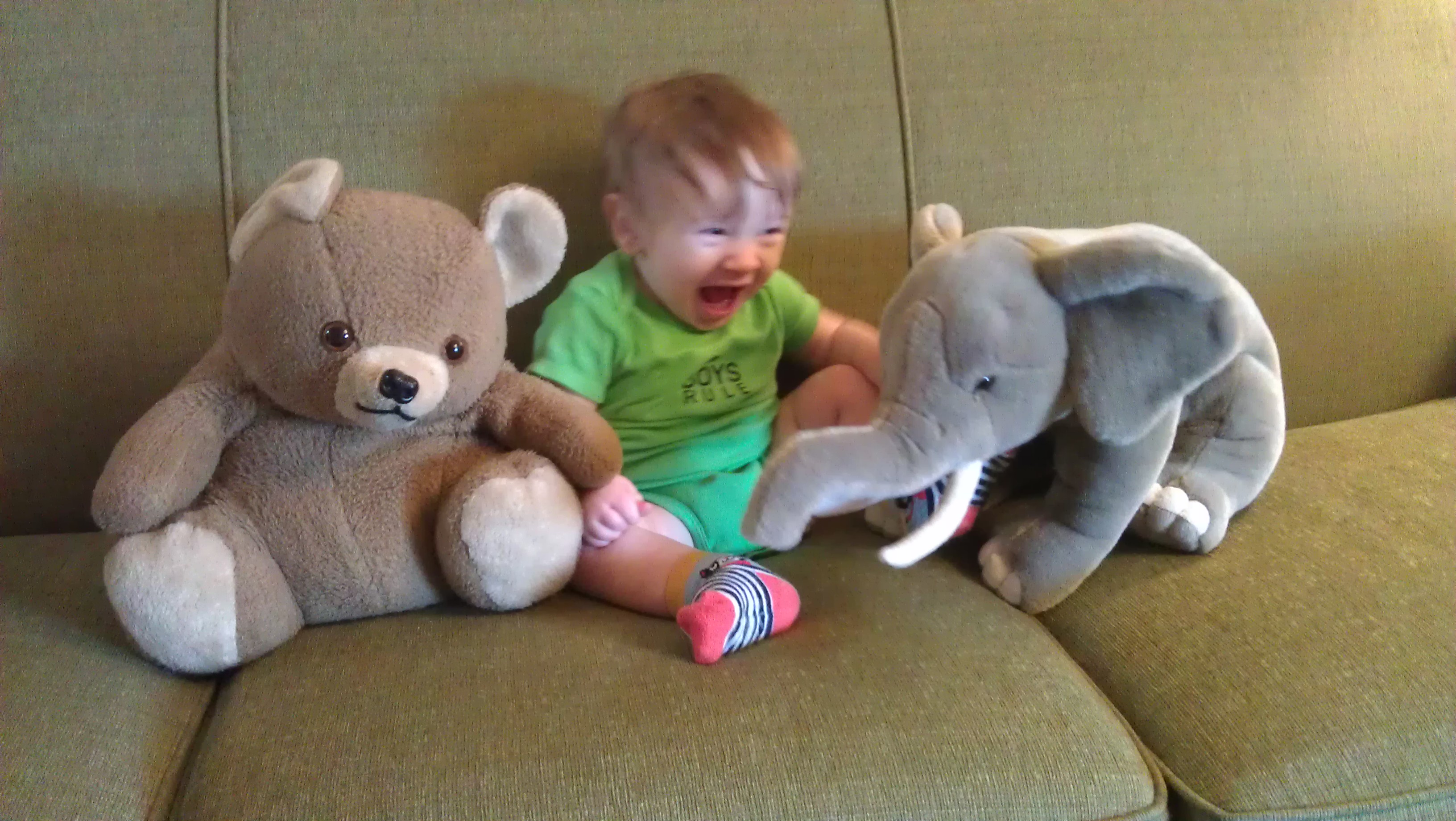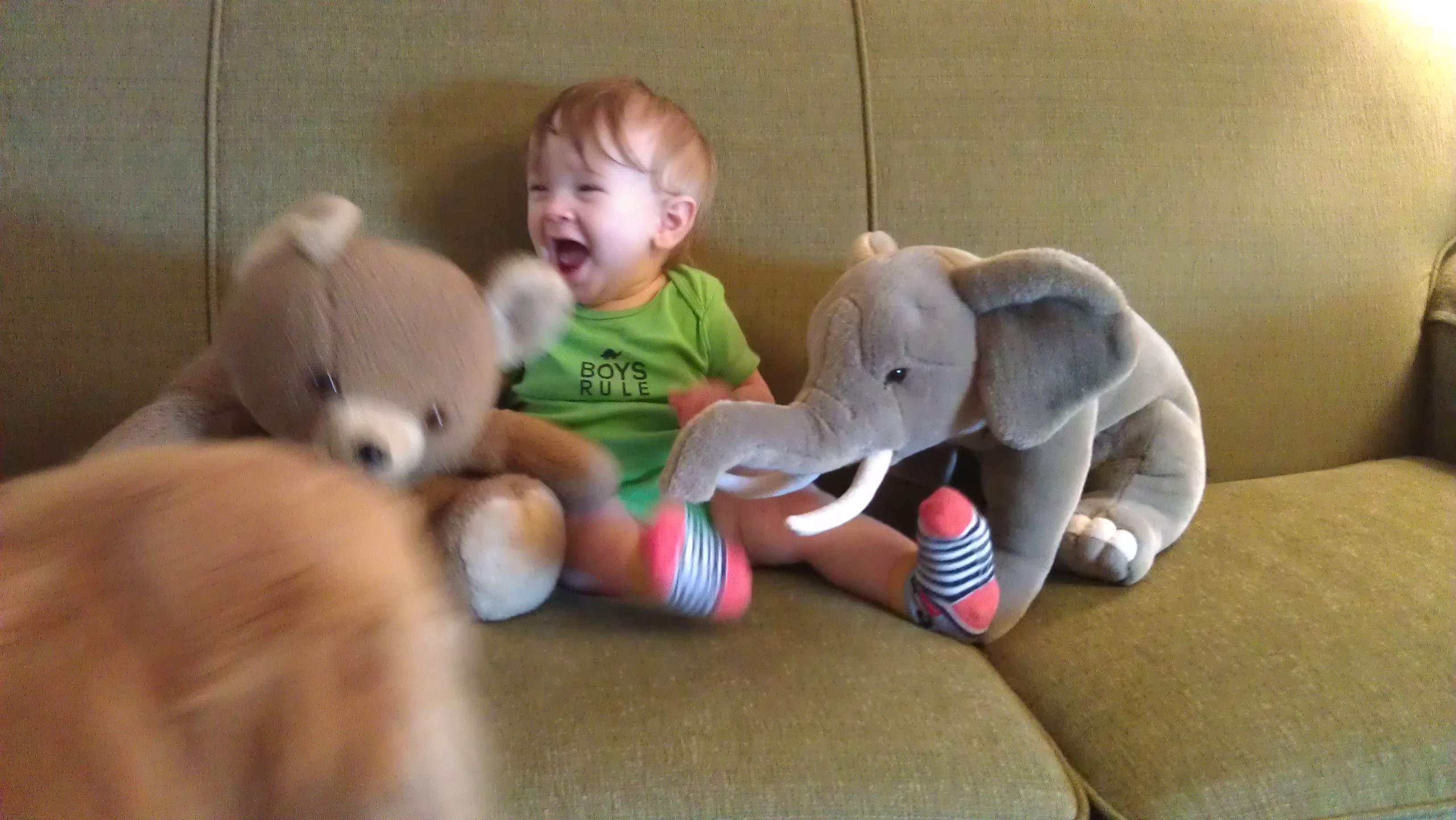 Here are some pictures from our 9-month photo shoot. I had to use my cell phone because my camera battery isn’t working right now. He loves being set down with these stuffed animals! He gasps and dives at one of them. He loves to grab the bear and put the bear’s nose in his mouth!
