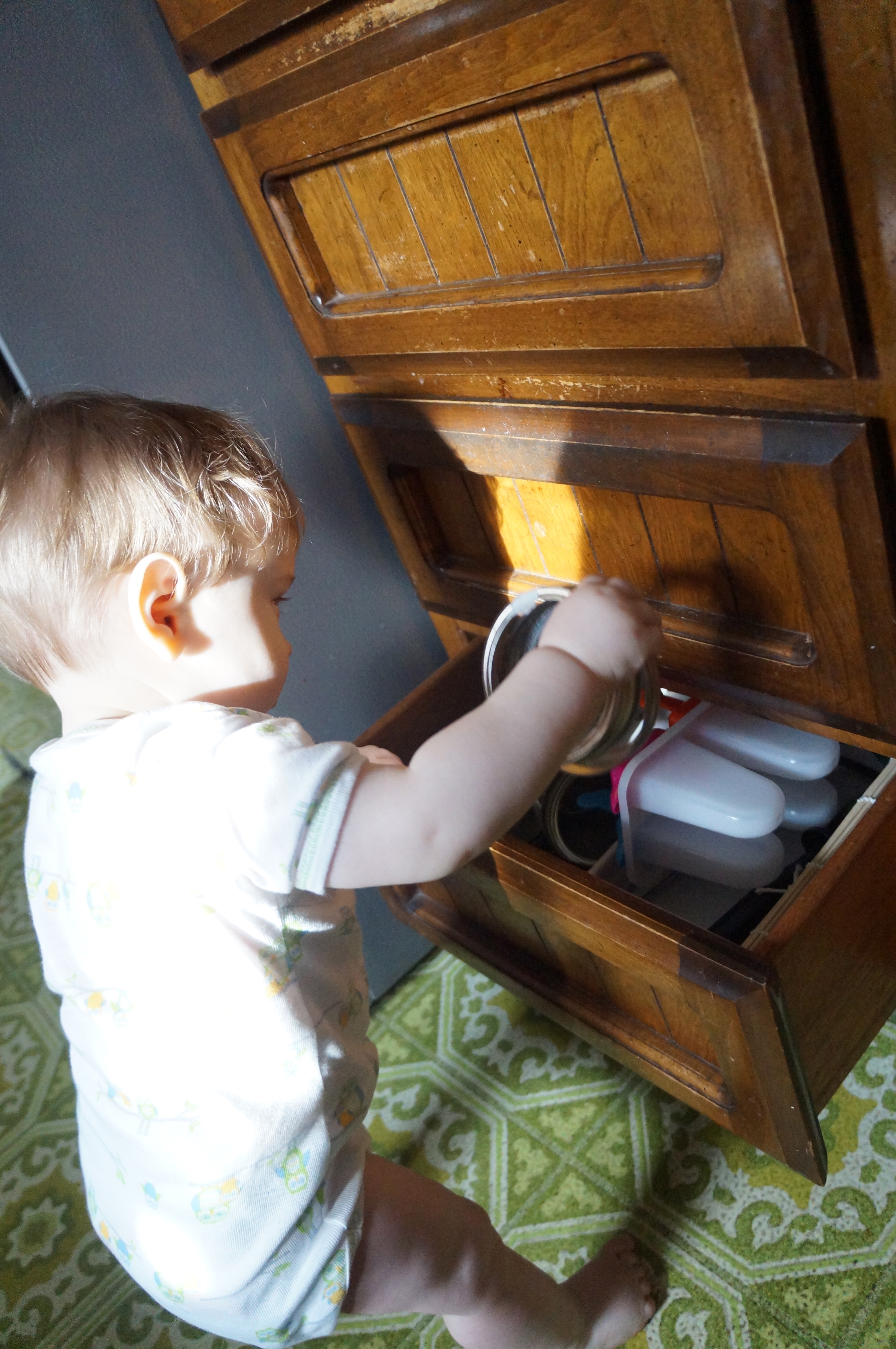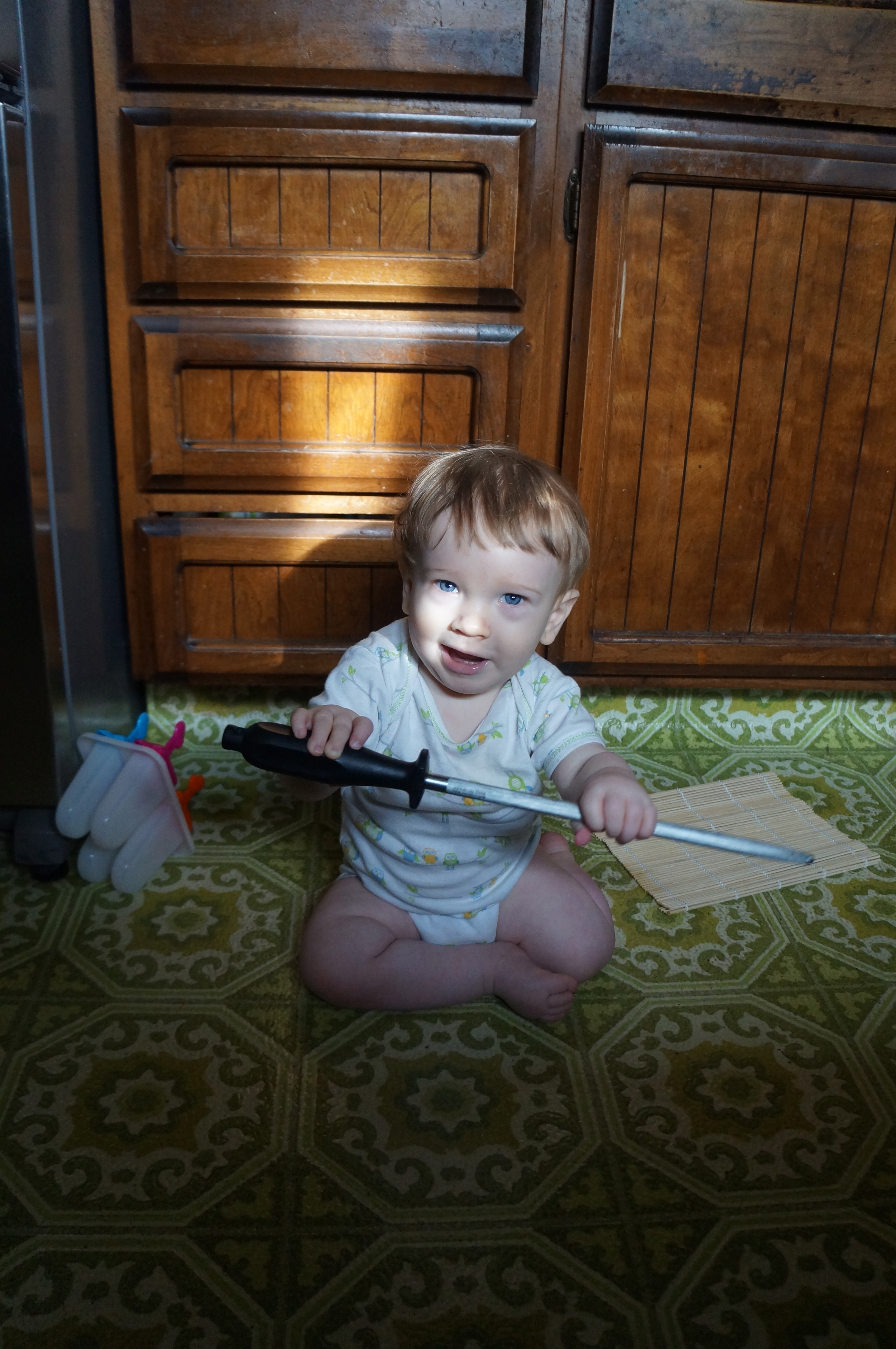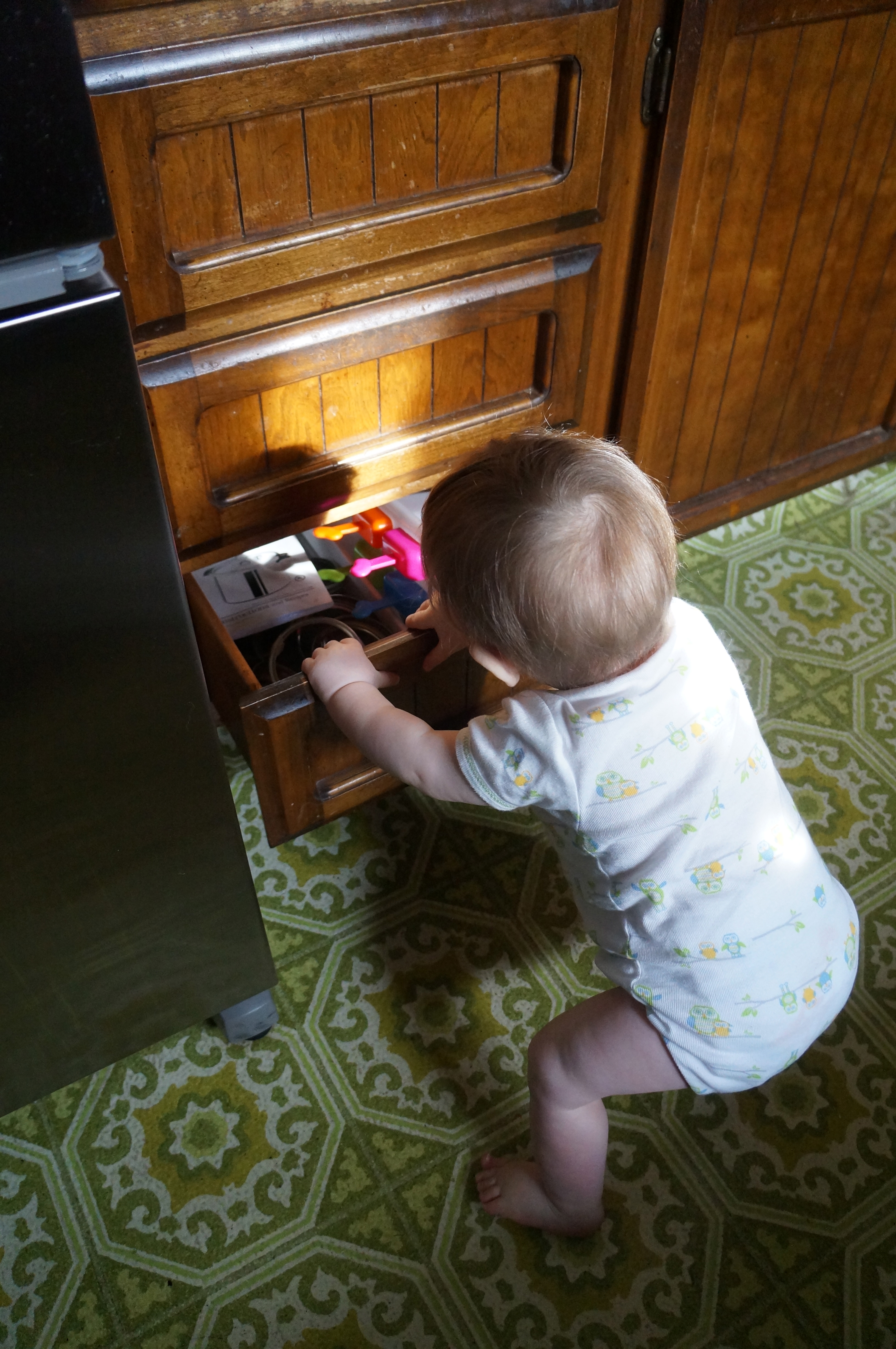 I’m glad I got a kitchen drawer set up for Ari because it really made my life easier this morning when I was trying to fix my oatmeal! The long metal thing is a knife sharpener but it’s not sharp itself, just heavy. He enjoyed the sound it made rubbing against the bumpy texture of the floor.