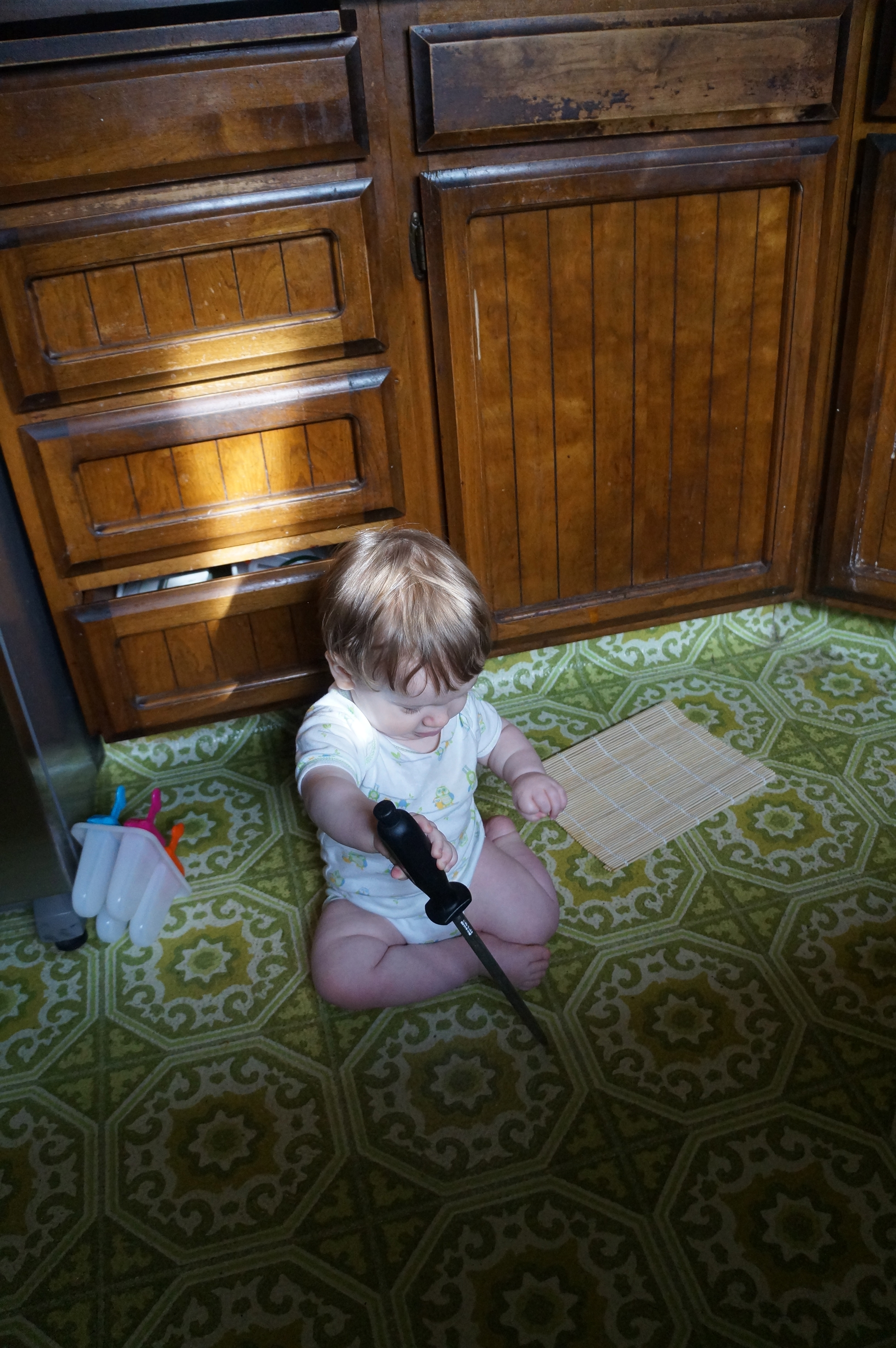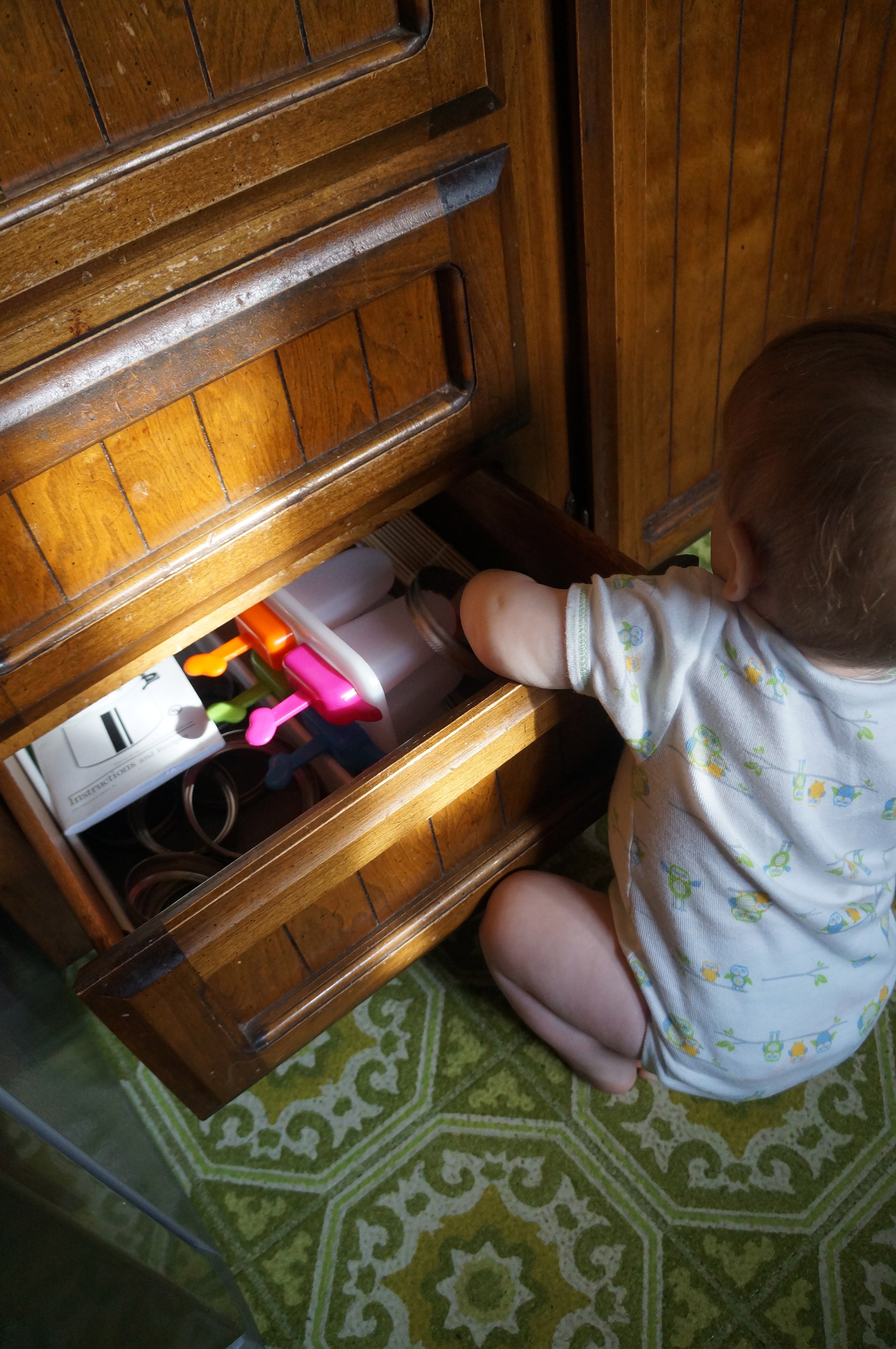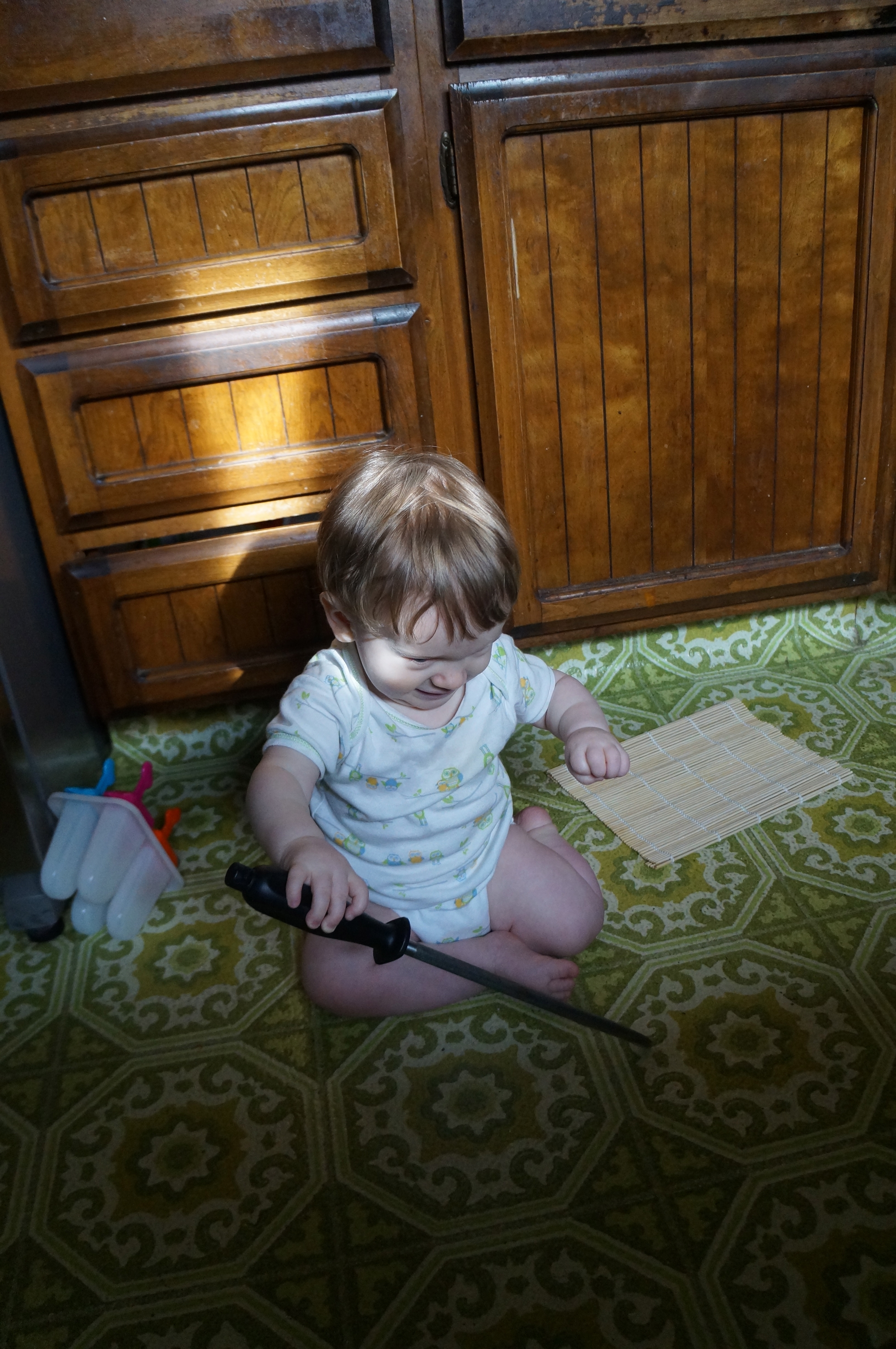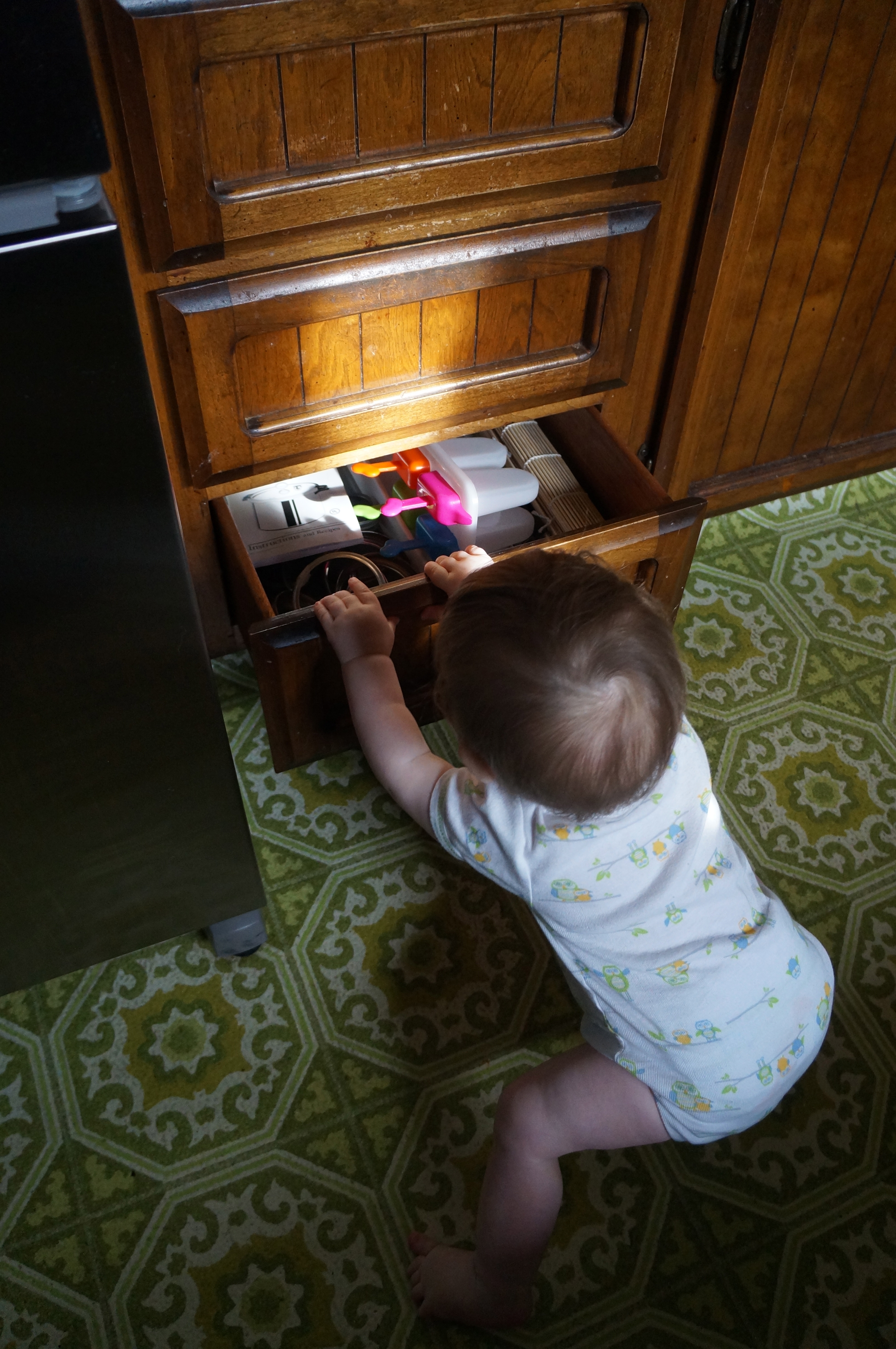 I’m glad I got a kitchen drawer set up for Ari because it really made my life easier this morning when I was trying to fix my oatmeal! The long metal thing is a knife sharpener but it’s not sharp itself, just heavy. He enjoyed the sound it made rubbing against the bumpy texture of the floor.