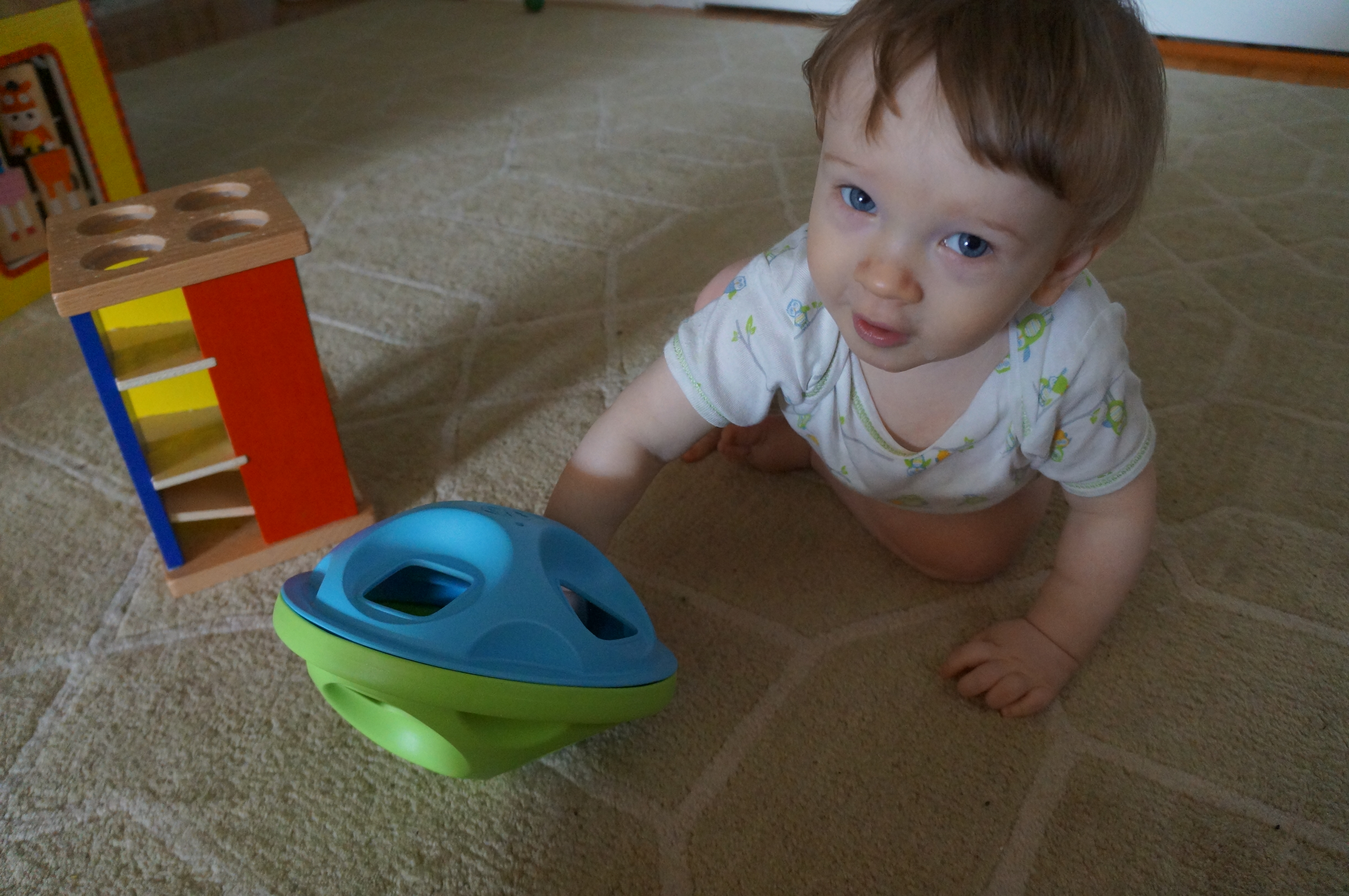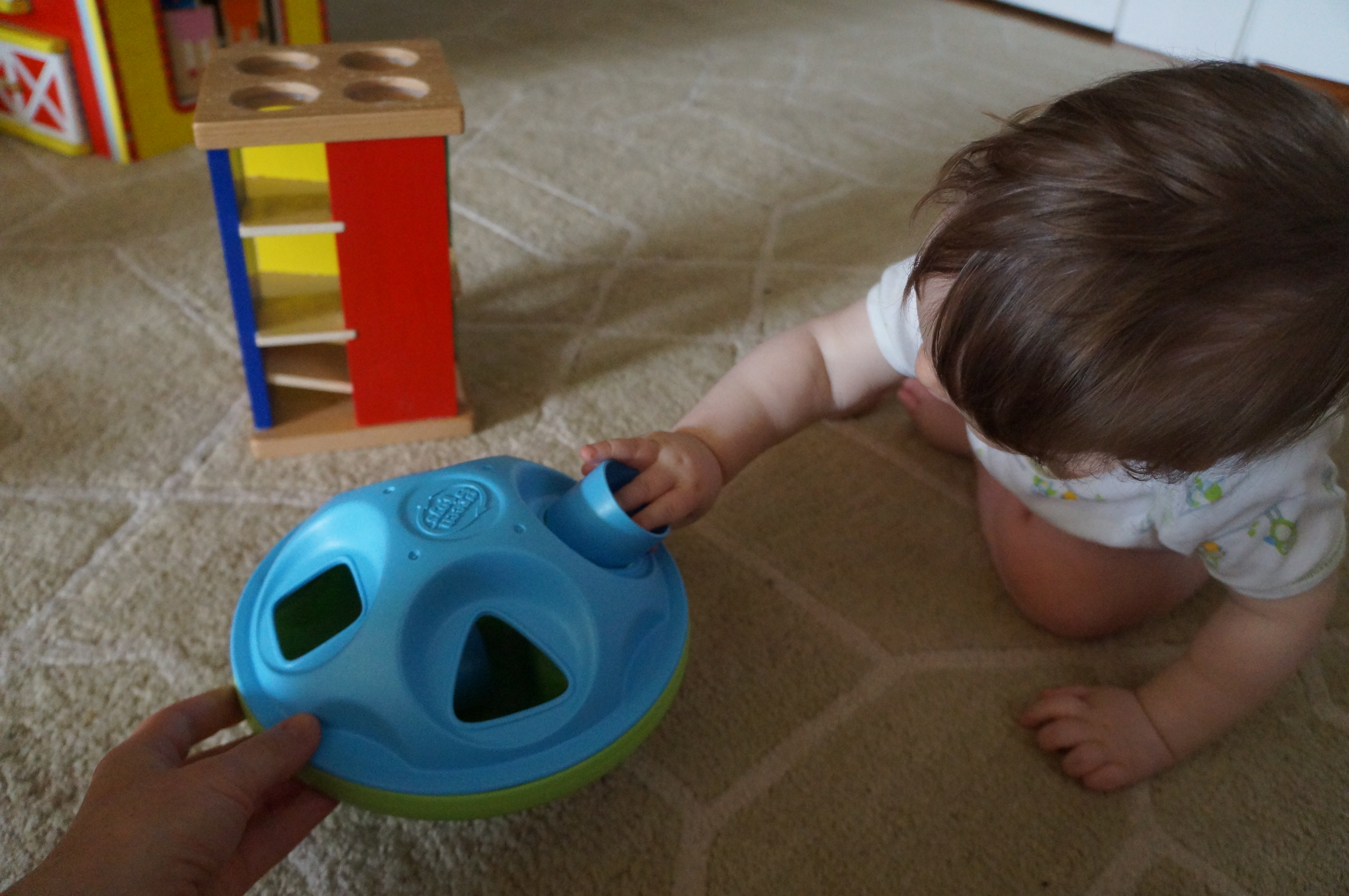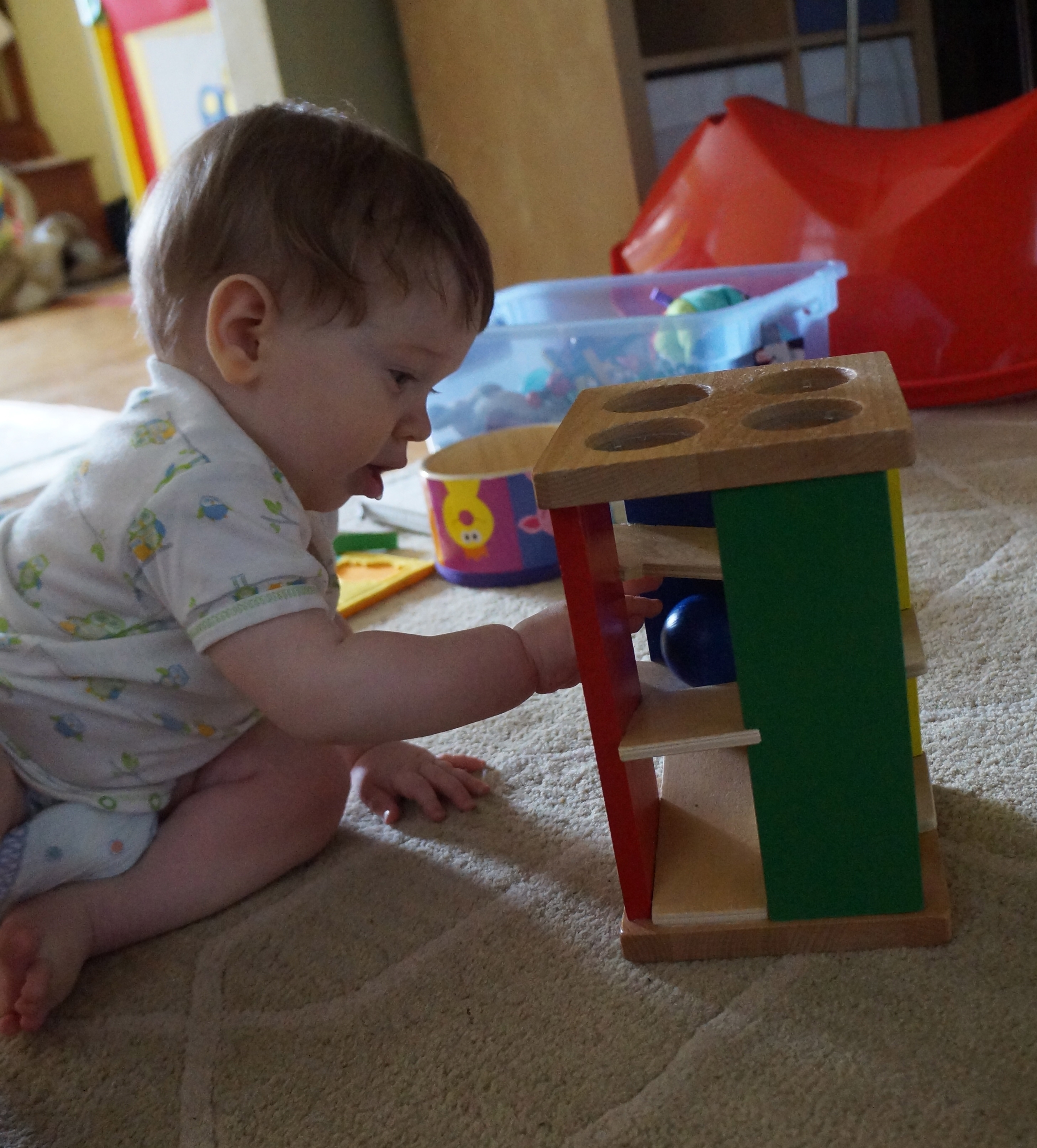 And here he is doing his “puzzles” this morning! For the past few days he’s been successfully putting the balls in his pound and roll toy (I got it at the consignment store) into it from the side (instead of pounding from above) and, more recently, getting the circles into this shape sorter if I show him first and then hold onto it.
