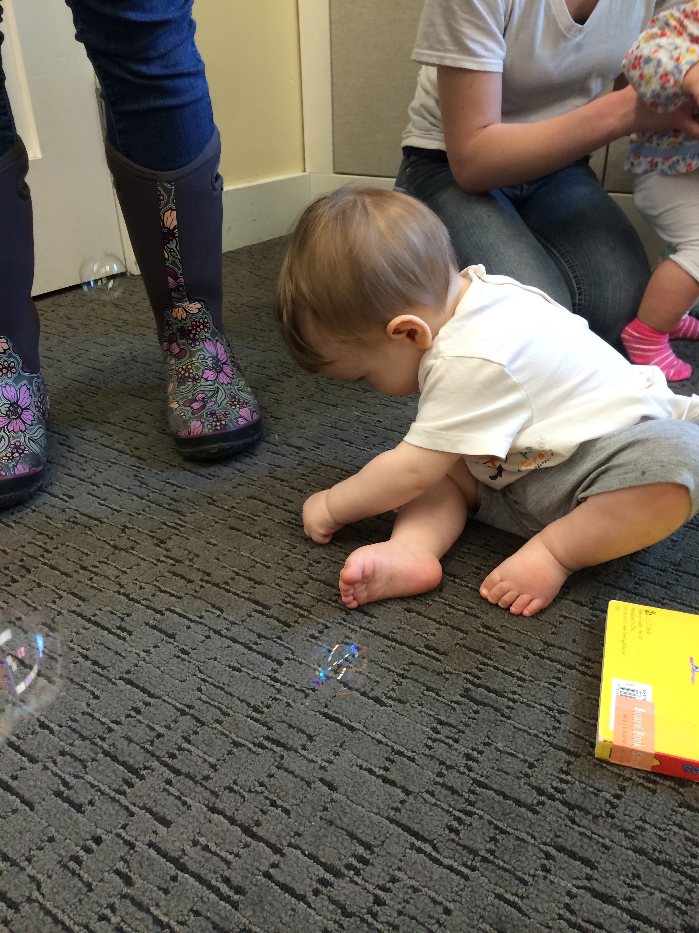 Yesterday we went to Book Babies and Ari had a BLAST. There were probably about 20 babies there and most of them were crawling, it seemed. We did songs and books, but Ari’s favorite things were the shakers, play time with toys, the parachute, and the bubbles. When we did the parachute he sat under it with his back to me just shrieking and laughing and flapping his arms up and down. During the bubbles, he crawled to the other side of the room and sat there trying to catch bubbles with a few other babies. Afterwards, he dug through the bin of books.