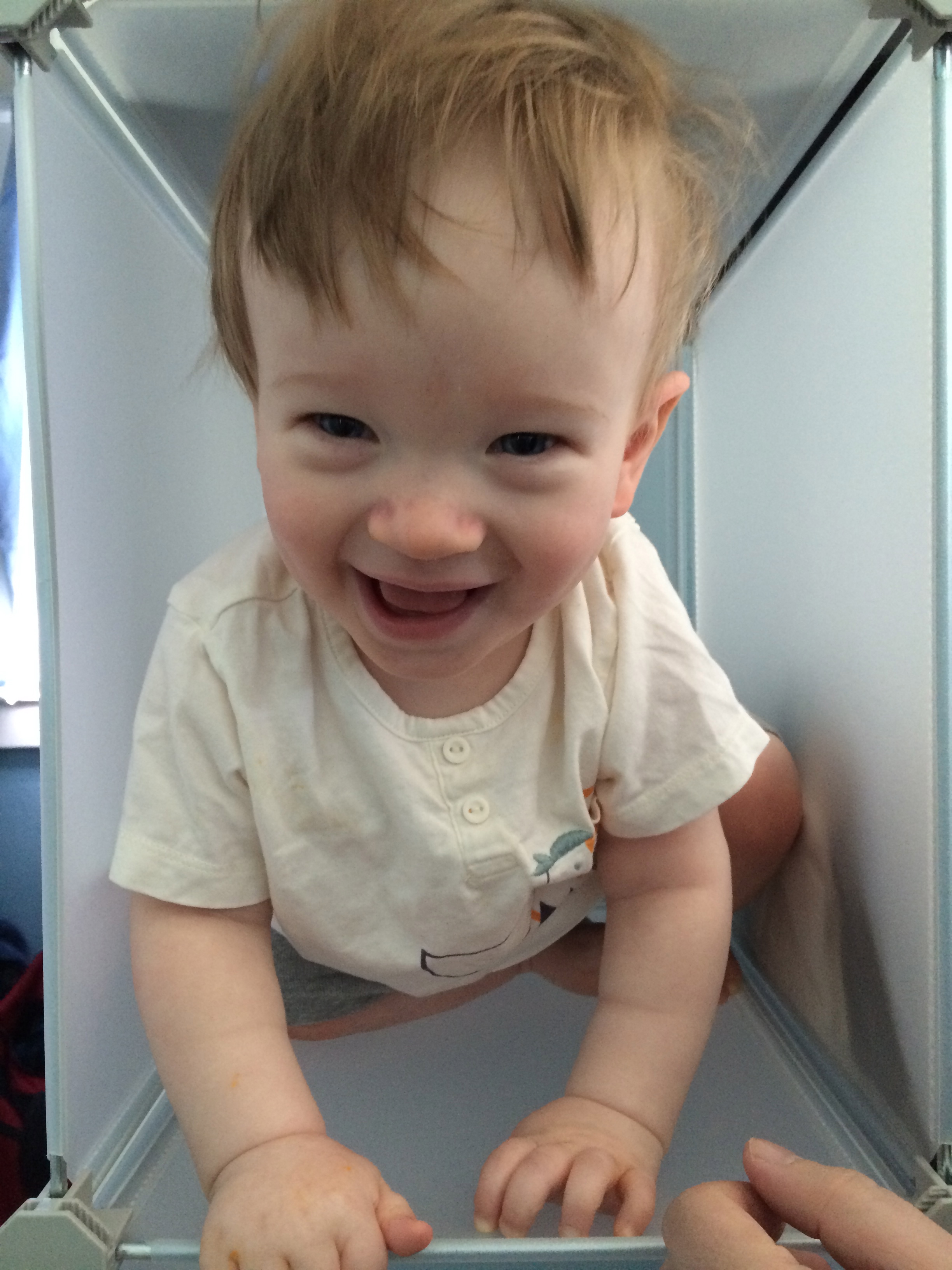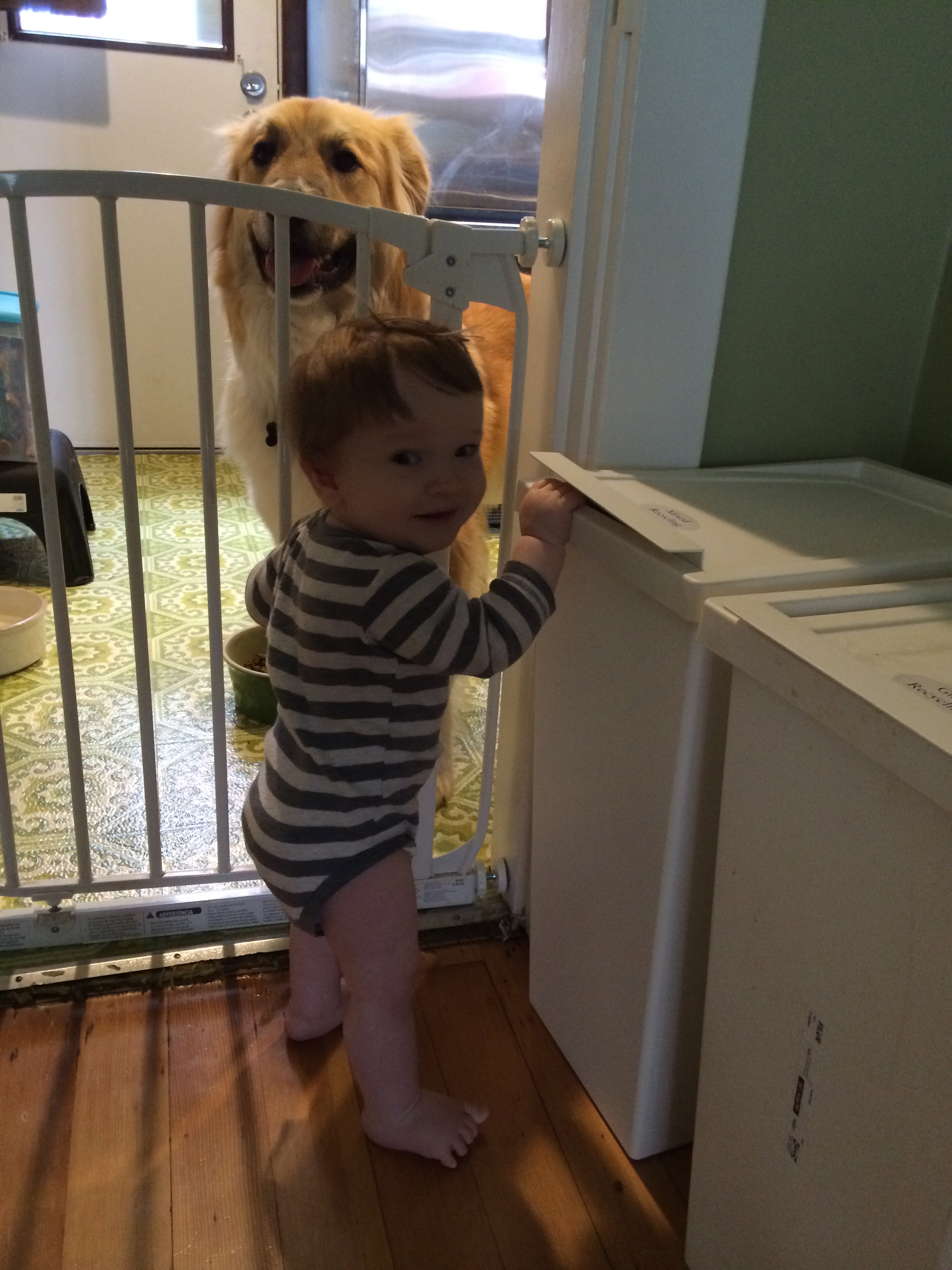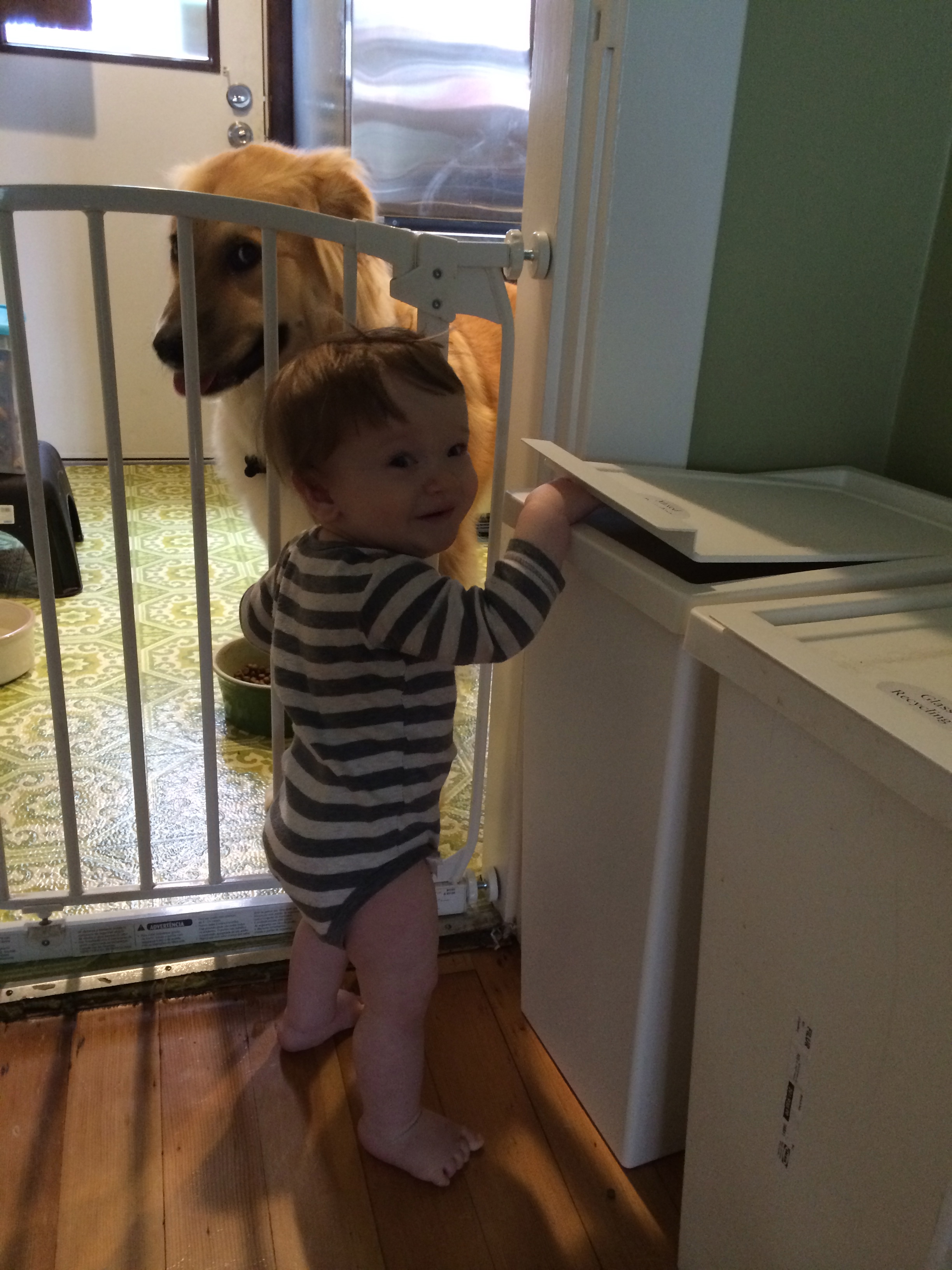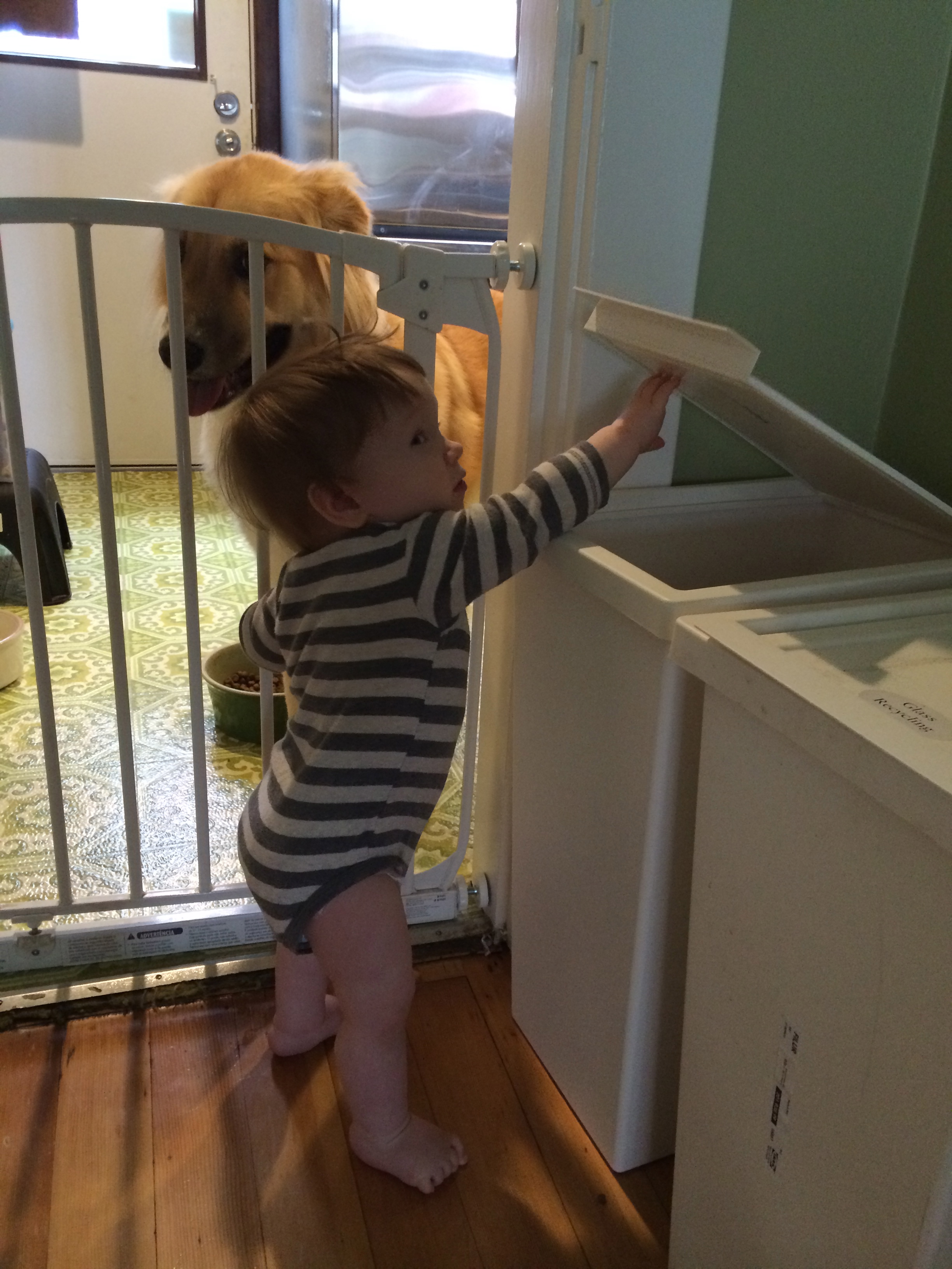 We’ve got the baby gate in the kitchen doorway now because Ari has discovered Andrew’s food, and Andrew doesn’t eat his food quickly anymore. Here are some pictures of Ari getting into the recycling bins and practicing his standing:
