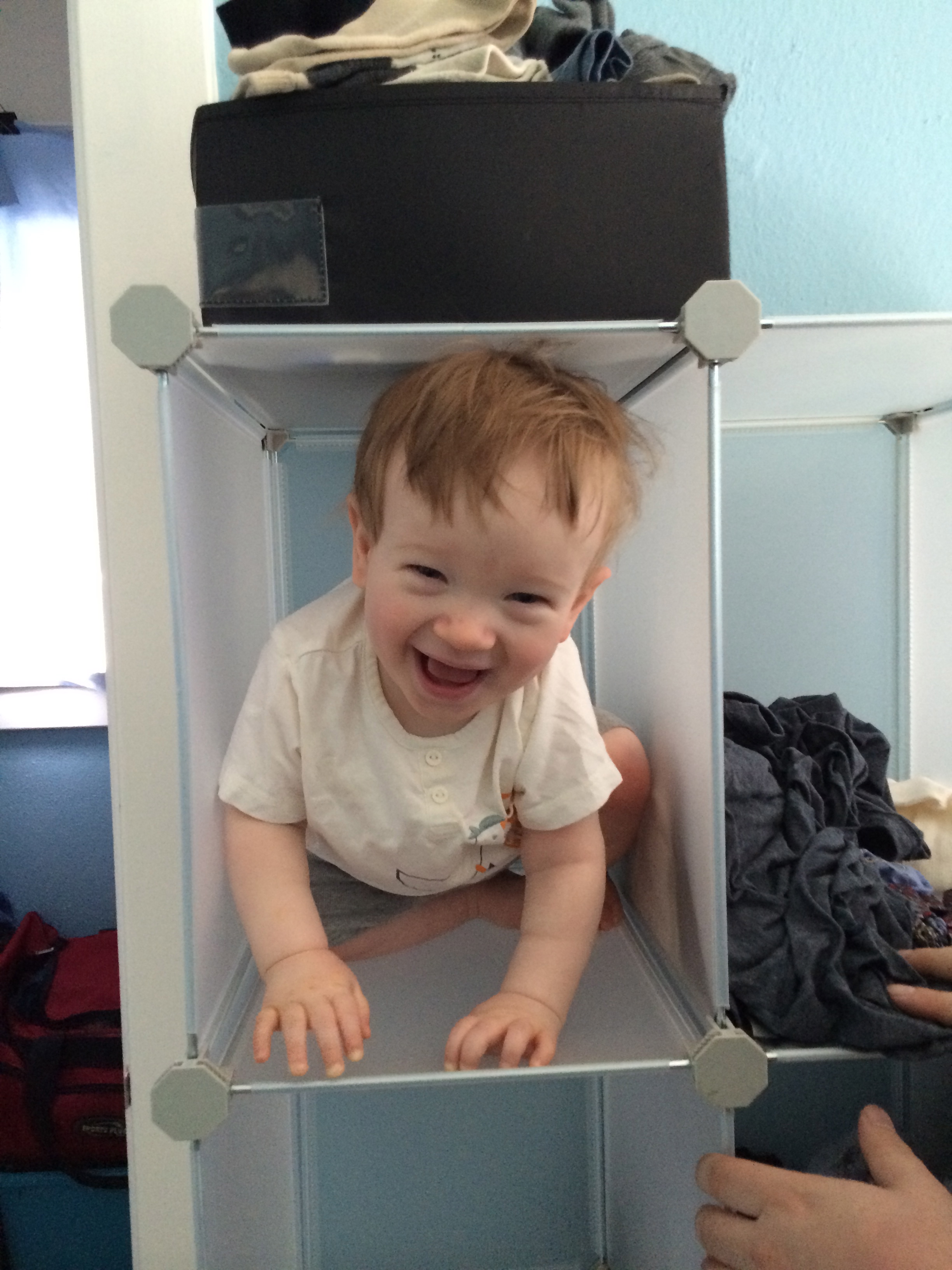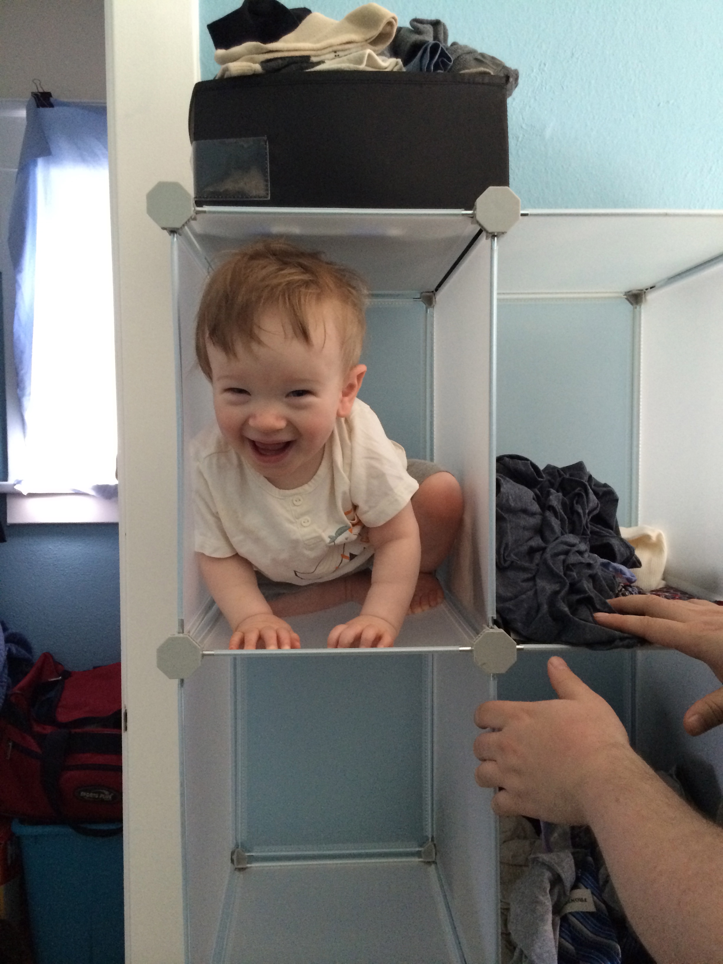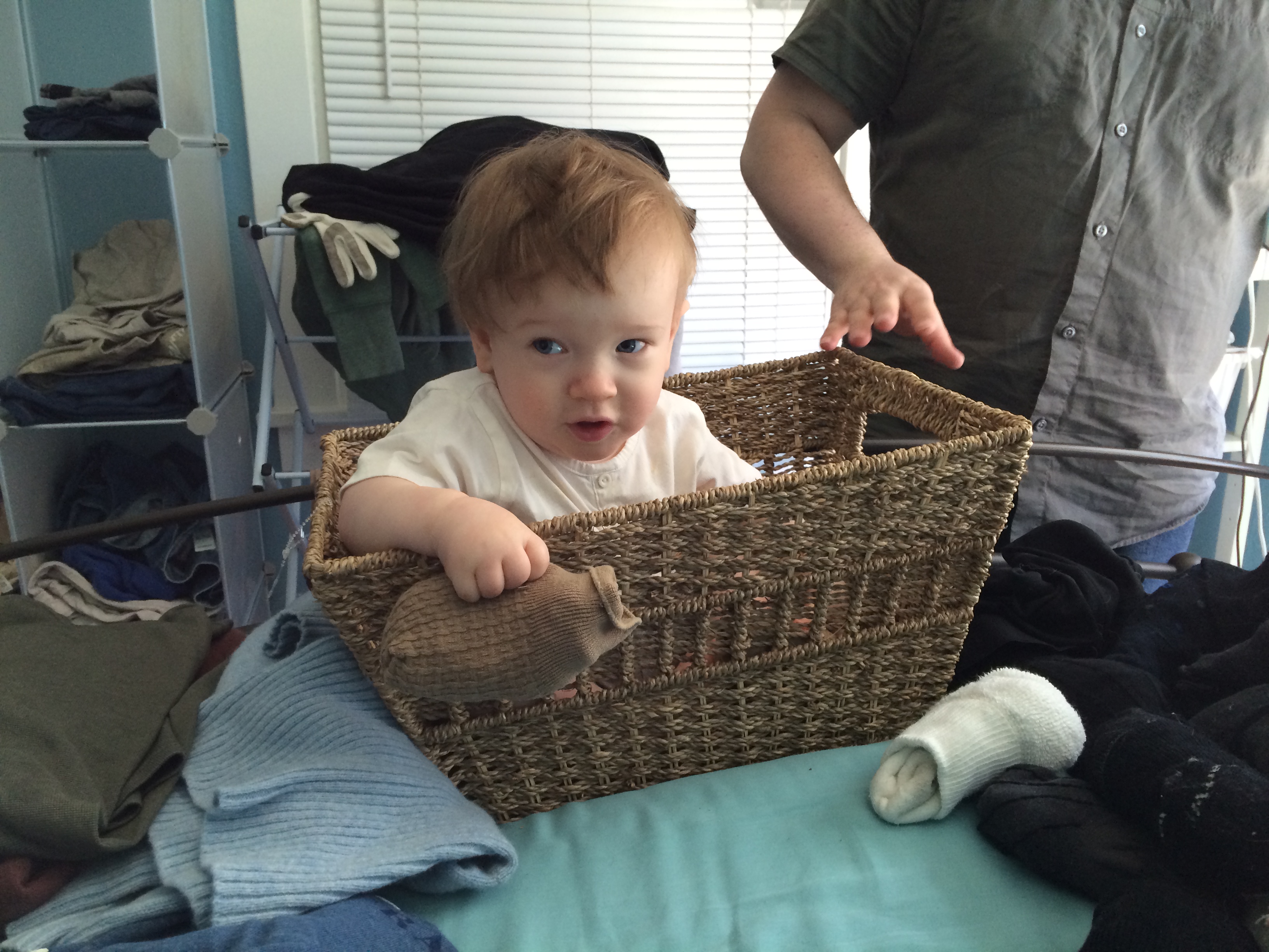 We worked on cleaning up our room and organizing our clothing during the weekend and Ari got involved in that too: