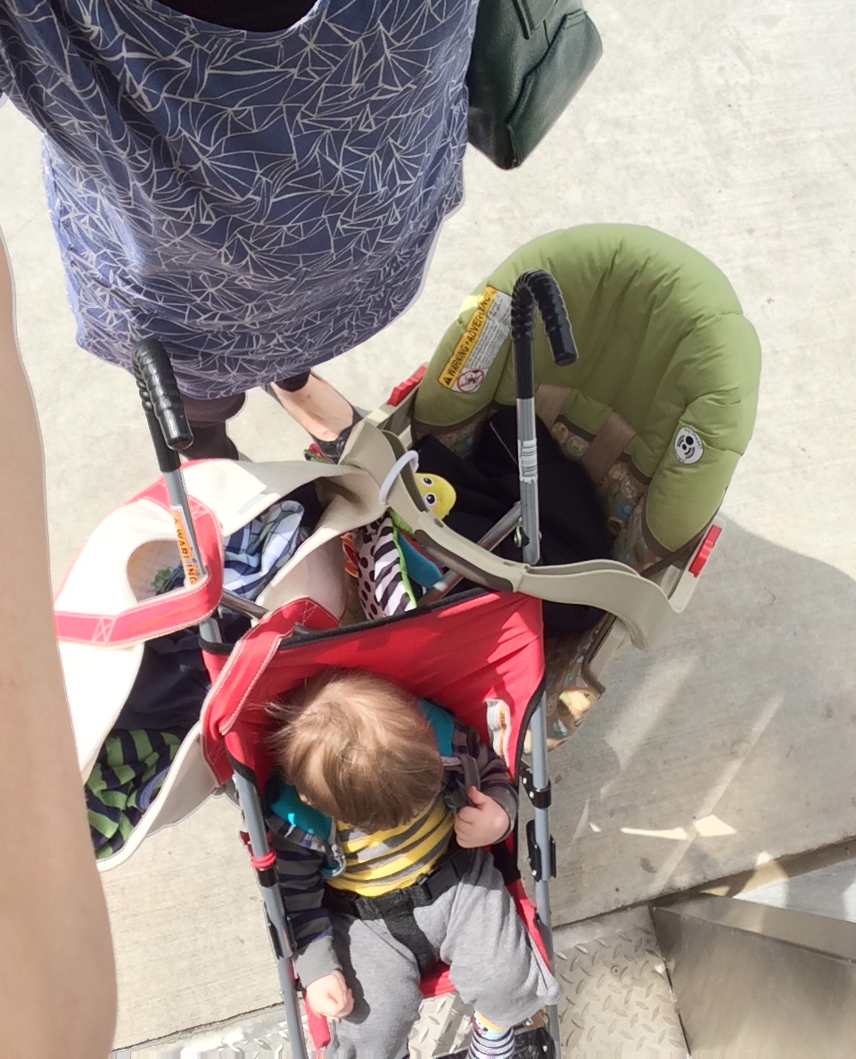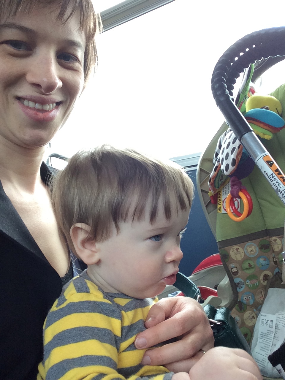I had to pack along the car seat and a giant bag of too many toys and clothing changes and burp cloths I brought for him, so my hands were beyond full – sort of like when I moved to and from San Francisco and New York by bus, subway, and airplane, refusing to pay to ship things or take taxis and carrying like five giant bags and a box all over the city. Well, this was a lot easier than those moves were, actually.