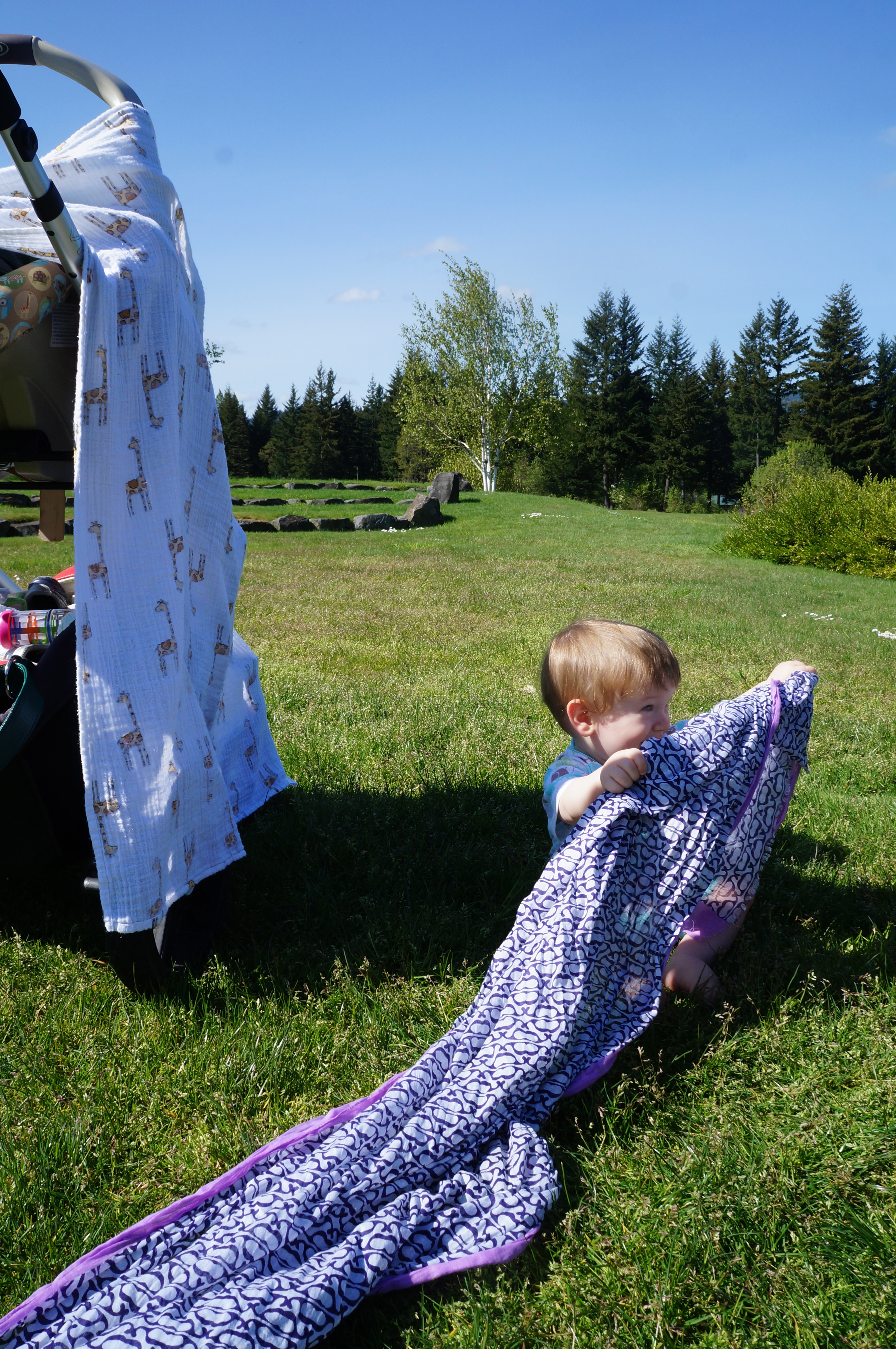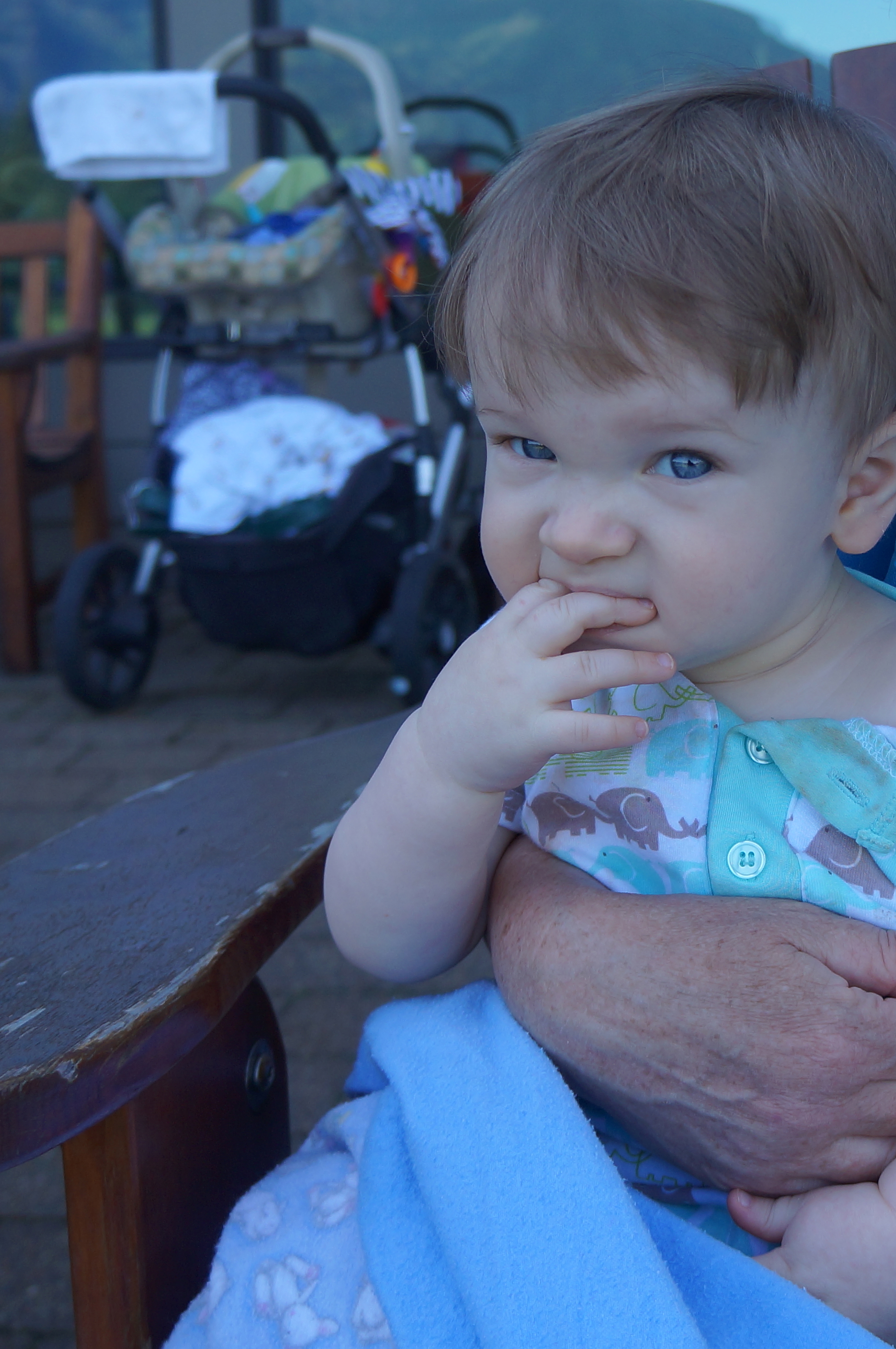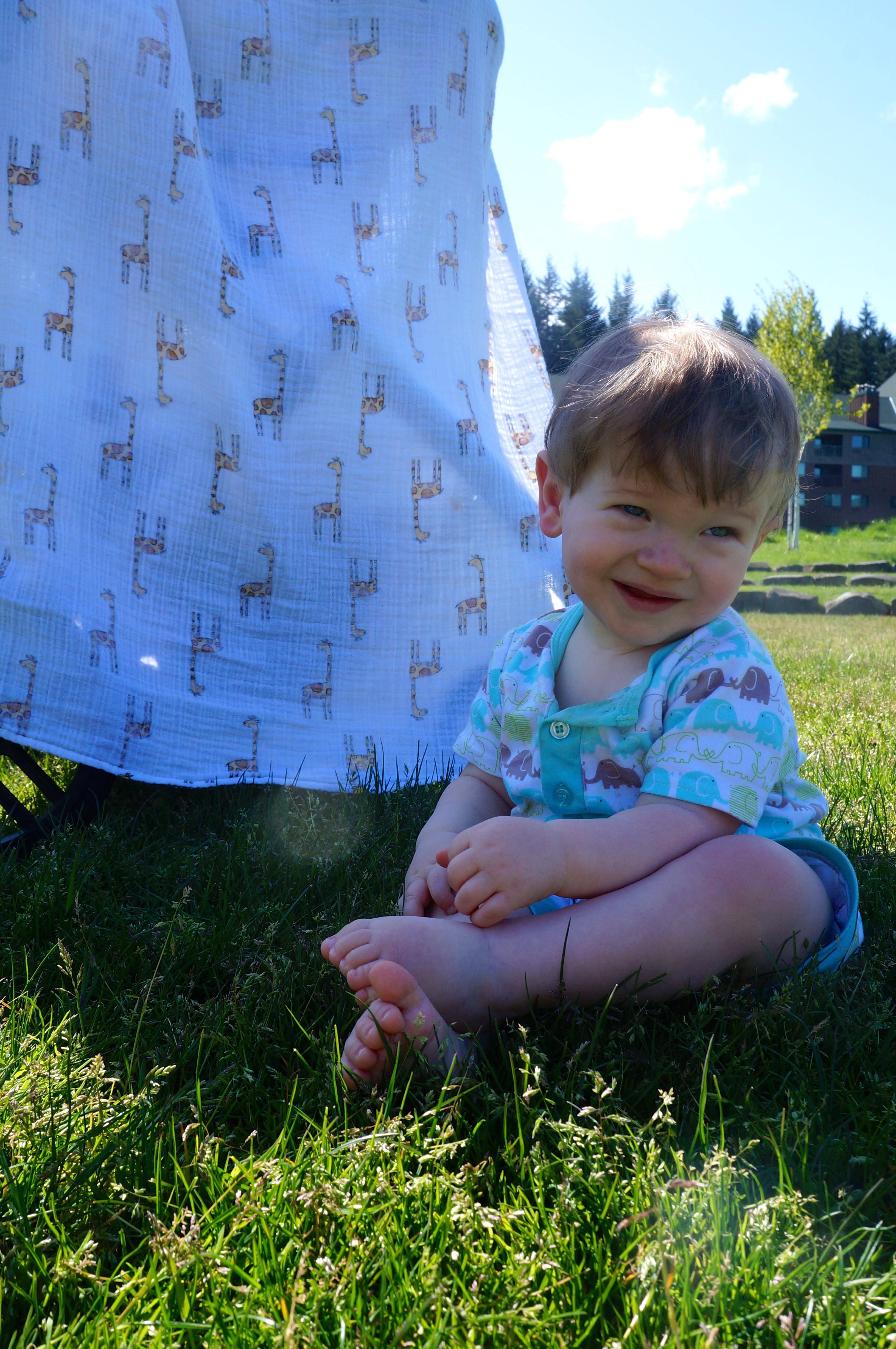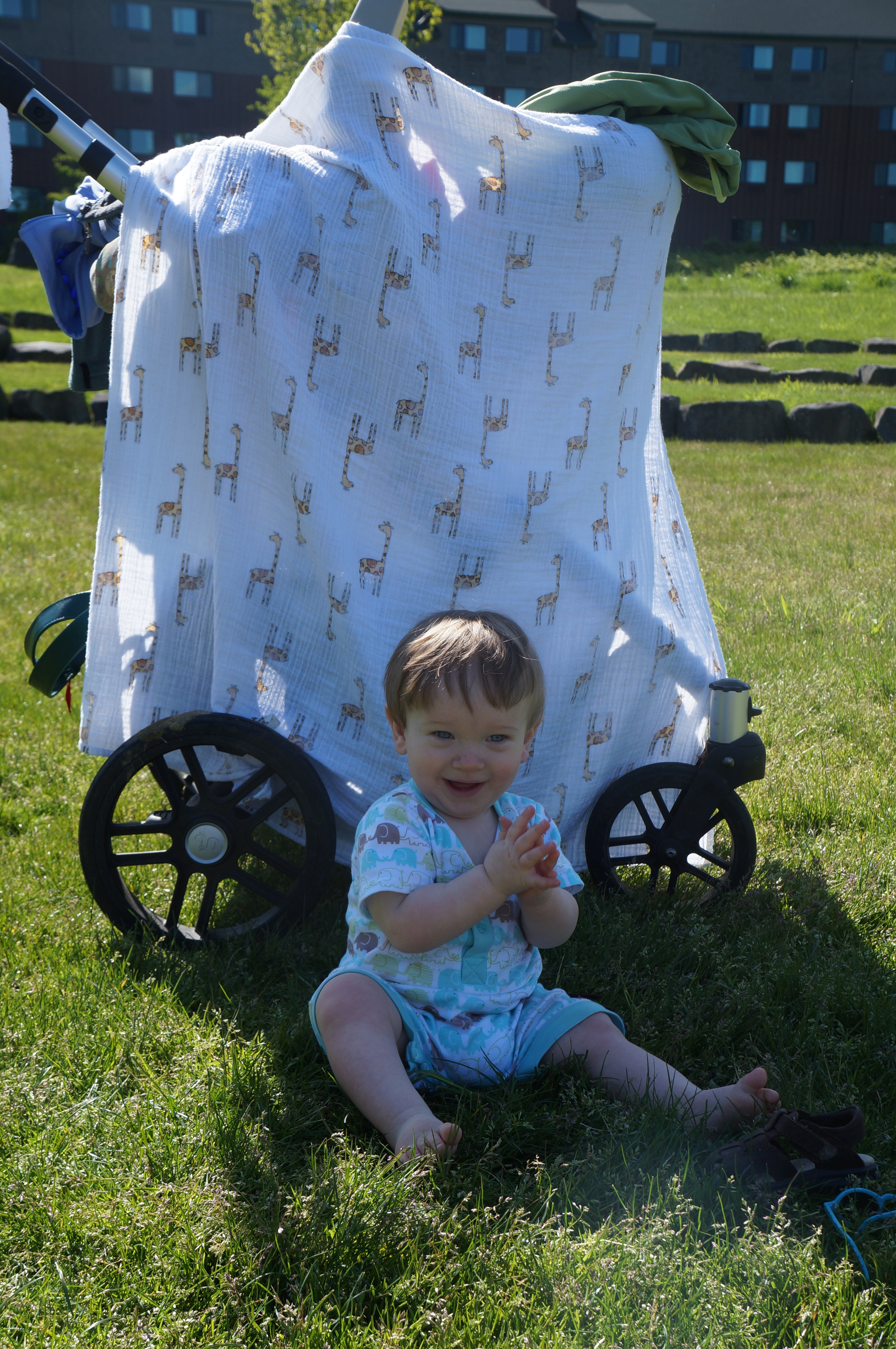 We made portable shade for him with a blanket draped on the stroller. I also put baby sunblock on him for the first time. Actually his nanny has put it on him at least once.